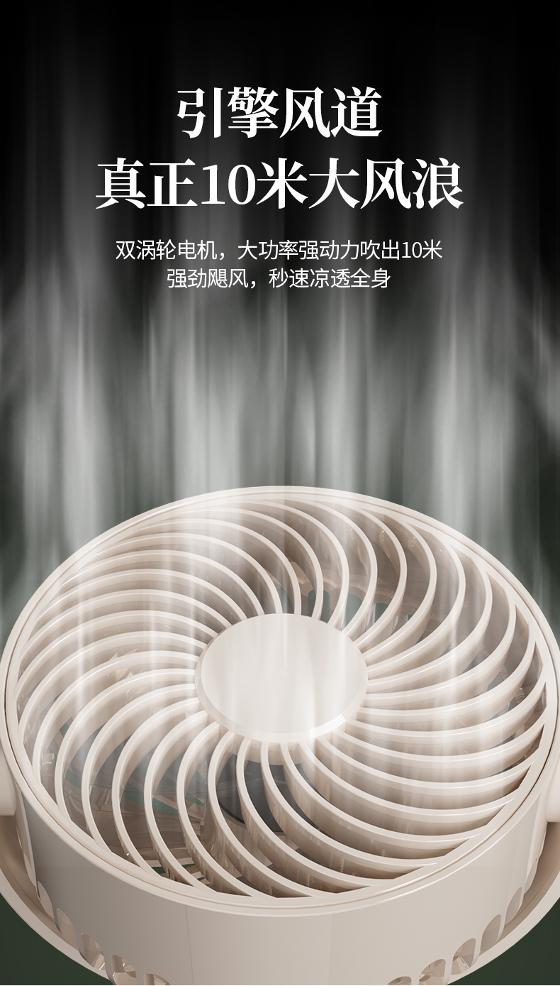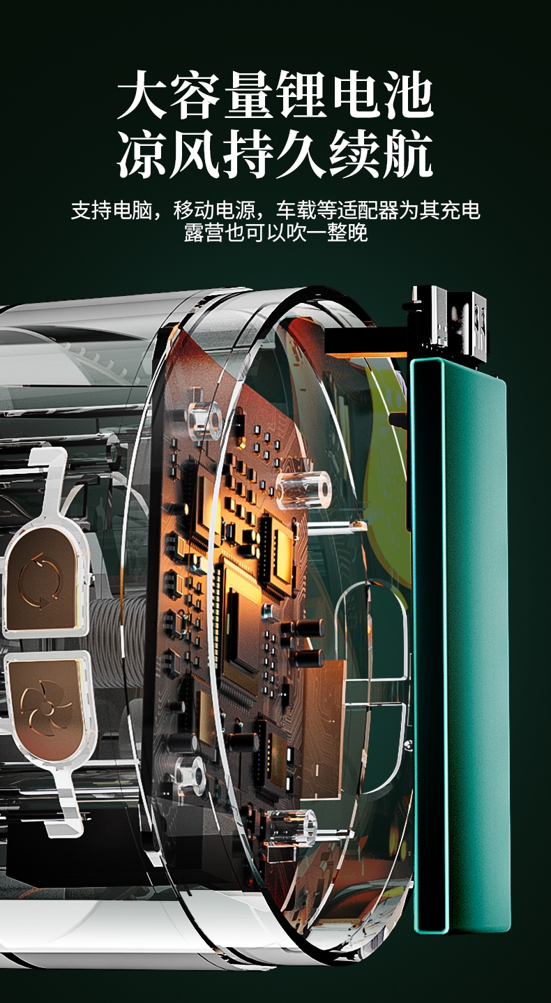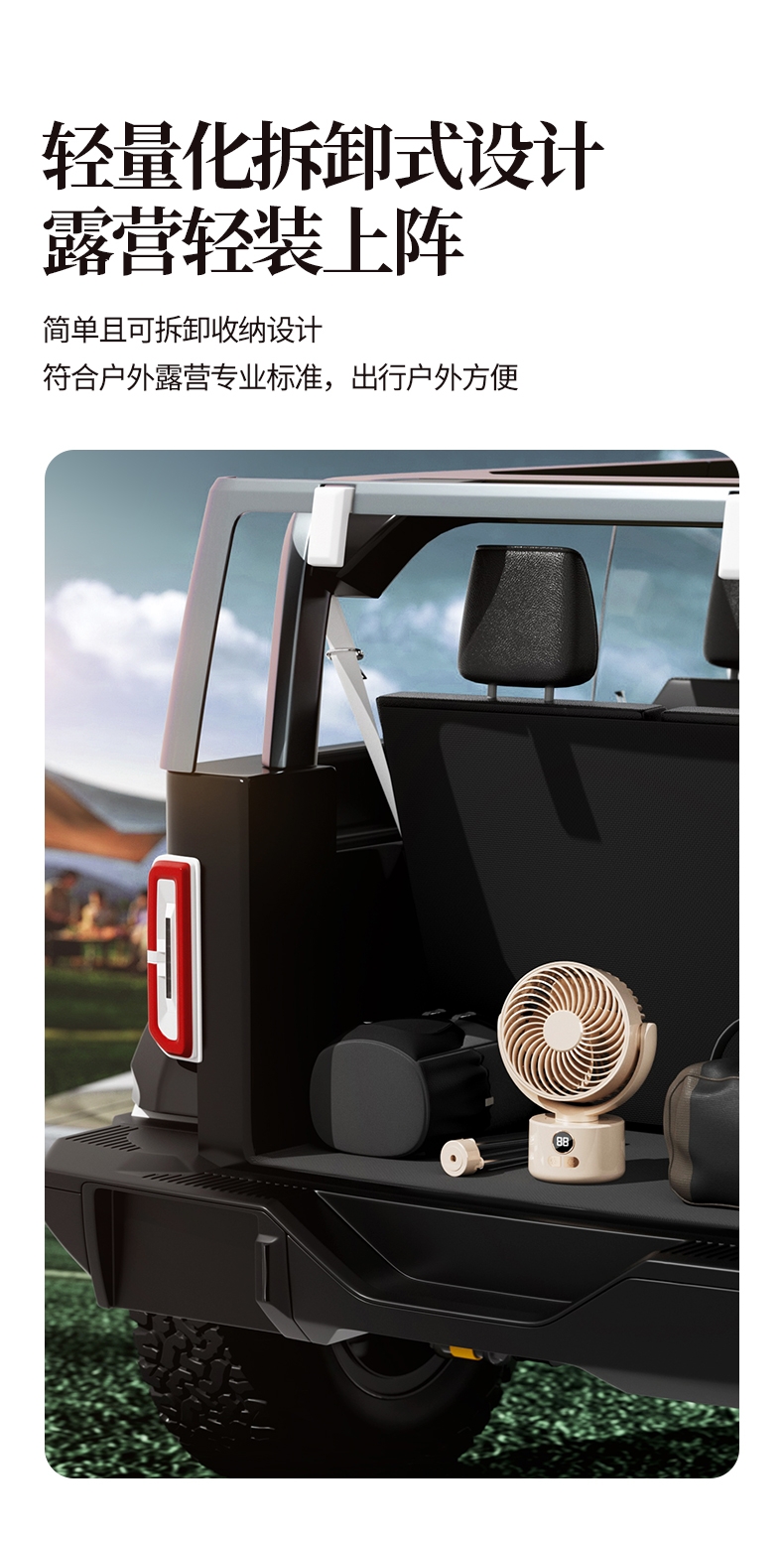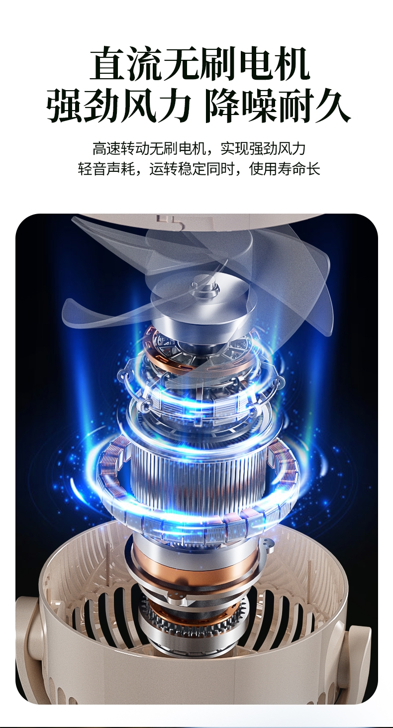 多方位角度自由风向调节上下左右送风多种角度随意切换;内置大容量锂电池强劲电量长效续航,专业户外露营风扇;轻量化可拆卸式设计,户外出行方便收纳,露营轻装上阵;降噪风道工艺降低噪音风柔音轻不扰心,低噪音安静入眠;三档风力调控带动室内空气循环,瞬间赶走燥热悠然一夏