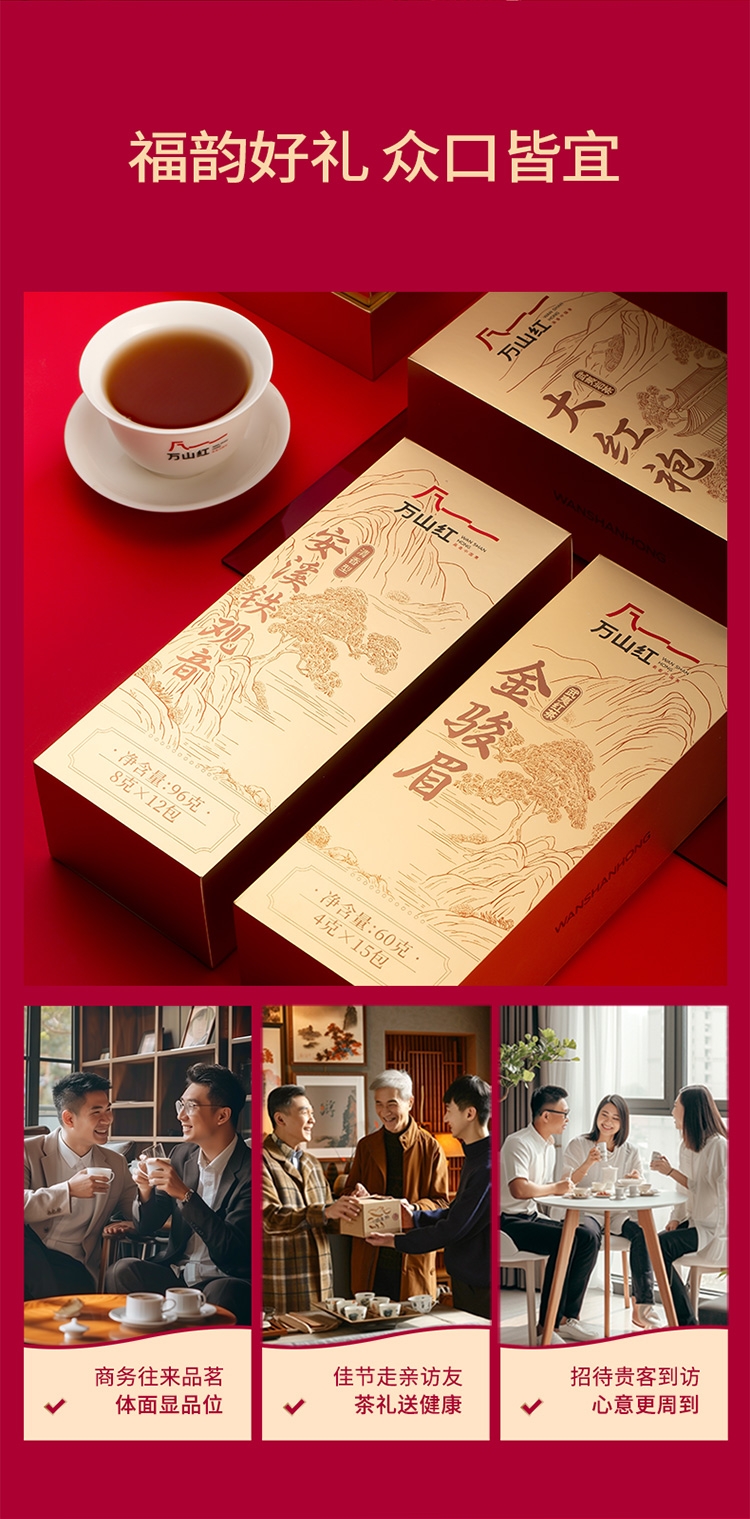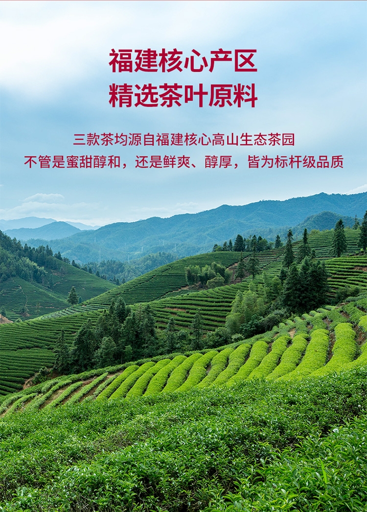 三款茶均源自福建核心高山生态茶园;蜜甜醇和,鲜爽、醇厚,皆为标杆级品质。;汇集金骏眉、大红袍、铁观音三大名茶既是茶礼更是心意