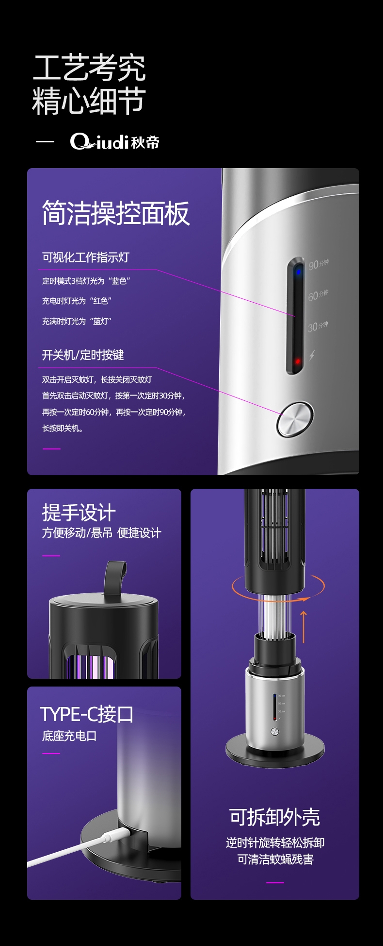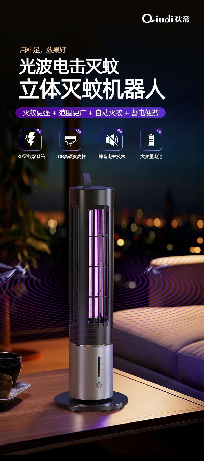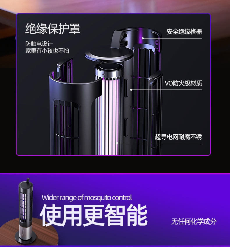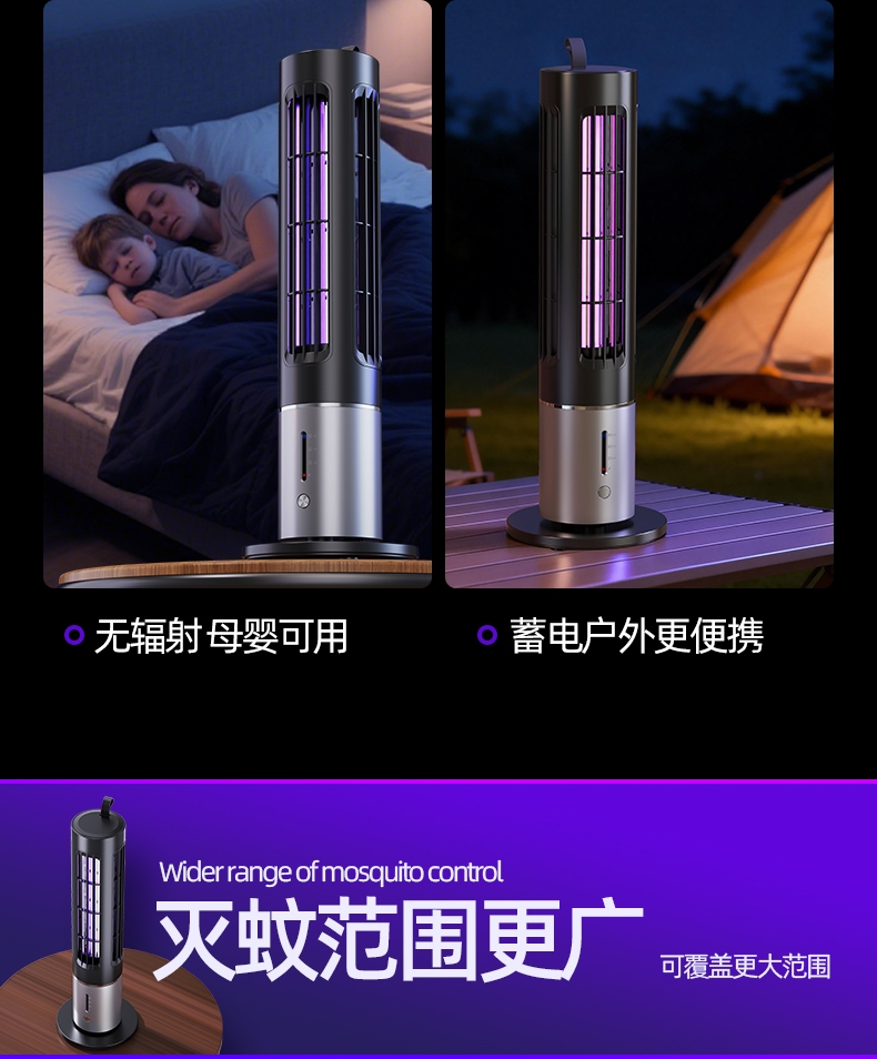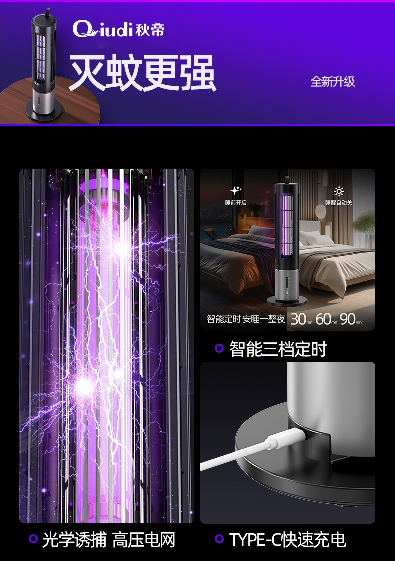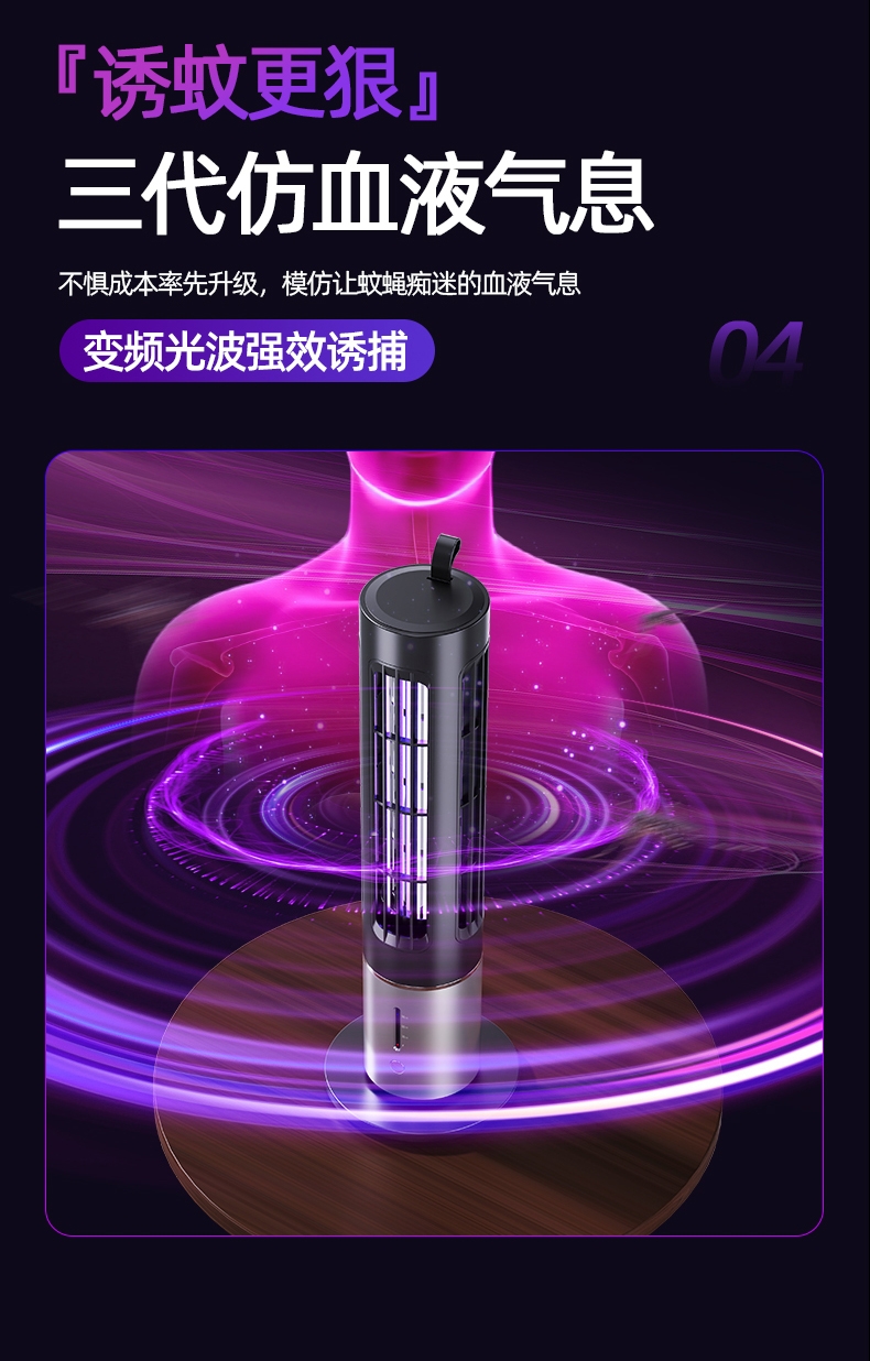 升级顶配诱蚊技术,大面积自动灭蚊系统,智能三档定时;蓄电户外更便捷,适用室内户外多种场景随时随地灭蚊蝇;立体紫光灯柱诱蚊更快,光学精准诱蚊无辐射母婴均可用;全新升级三代热能光罩,模拟人体运动热感高效吸引蚊虫;内隐式电击绝缘保护层,真正做到健康安全自动诱蚊灭蚊