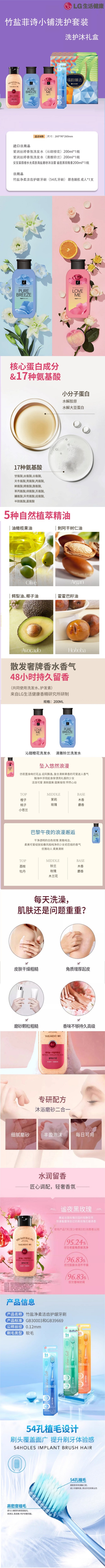 配置清单:爱润丝婷香氛洗发水(沁甜橙花)200ml*1瓶 爱润丝婷香氛洗发水(清雅铃兰)200ml*1瓶 安宝笛蓓缦水光柔肤海盐磨砂沐浴露 谧夜黑玫瑰香200ml*1瓶 竹盐净柔洁齿护龈牙刷(54孔牙刷) 颜色随机 成人*1支