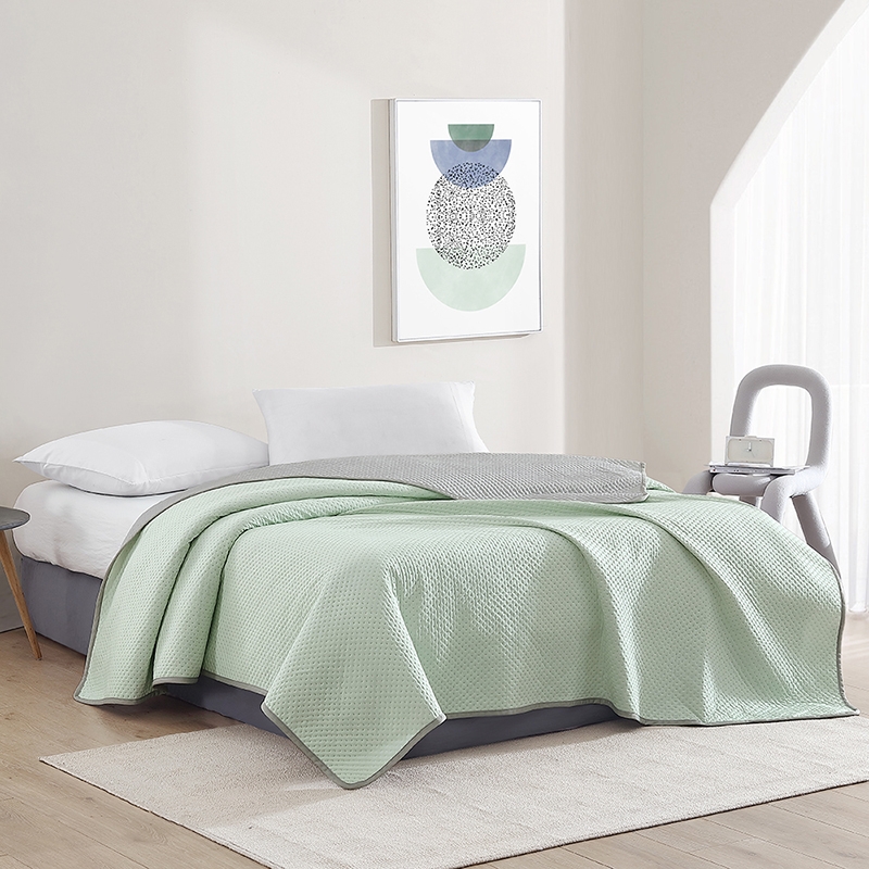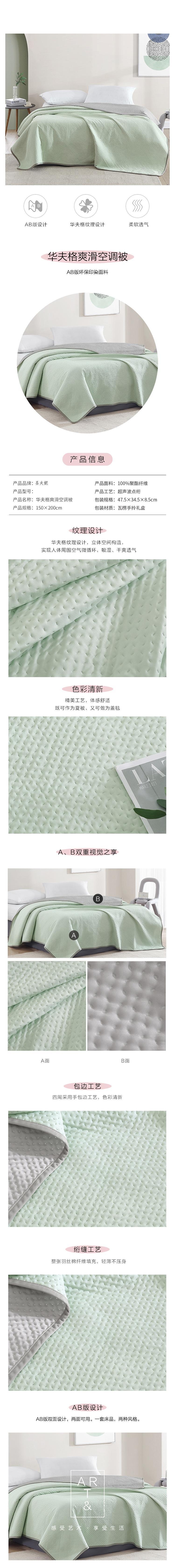 华夫格纹理设计,立体空间构造,实现人体周围空气微循;体感舒适,既可作为夏被、又可做为盖毯;AB版双面设计,两面可用,一套床品,两种风格