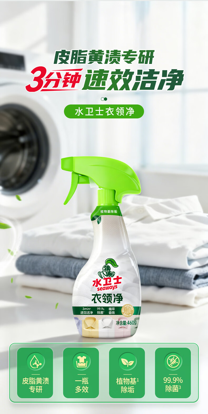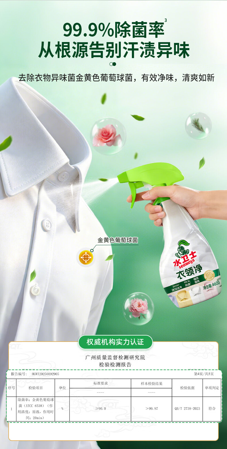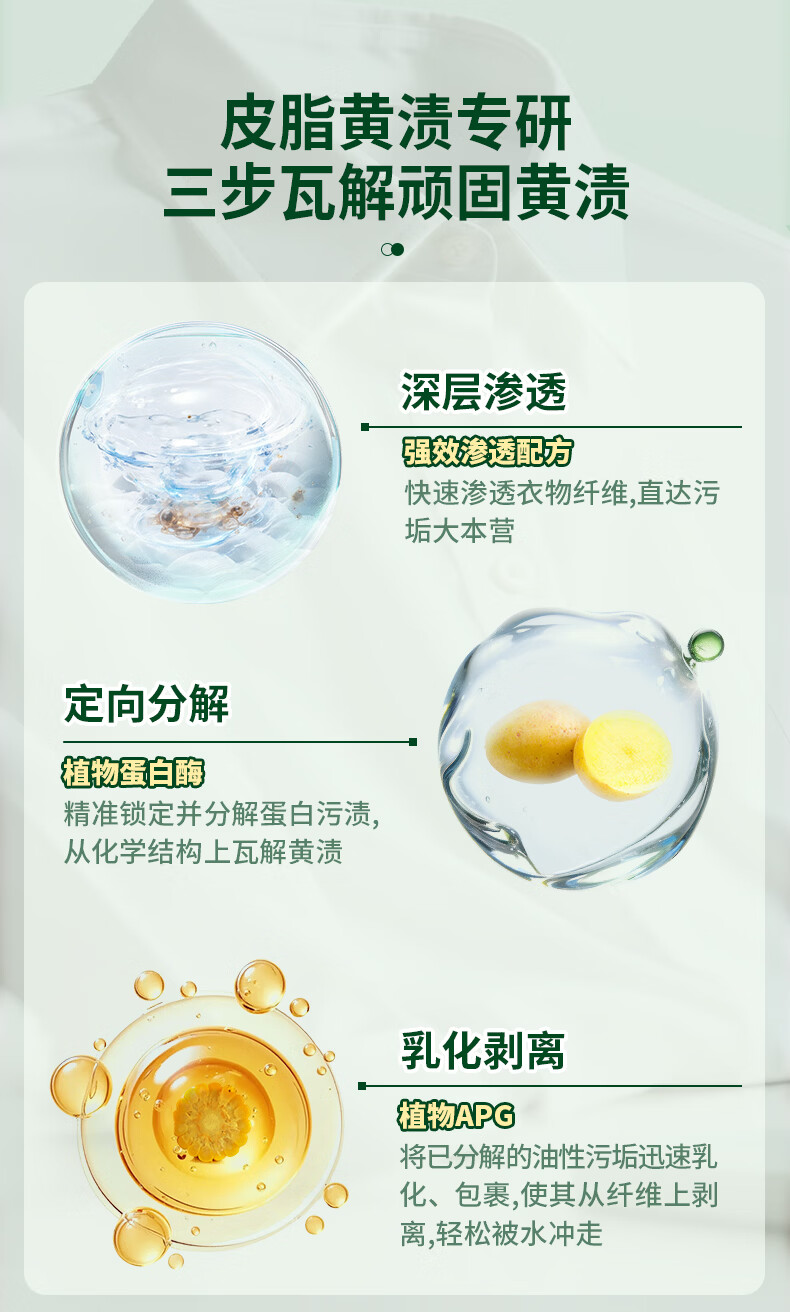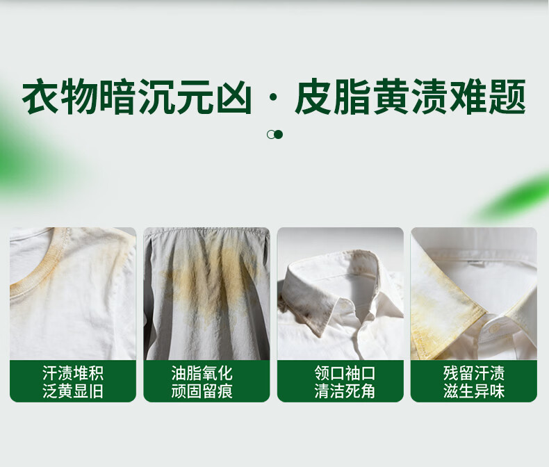 汗渍、油渍、血渍、饮料渍等日常污渍;皮脂黄渍专研3分钟速效洁净;99.9%除菌率从根源告别汗渍异味