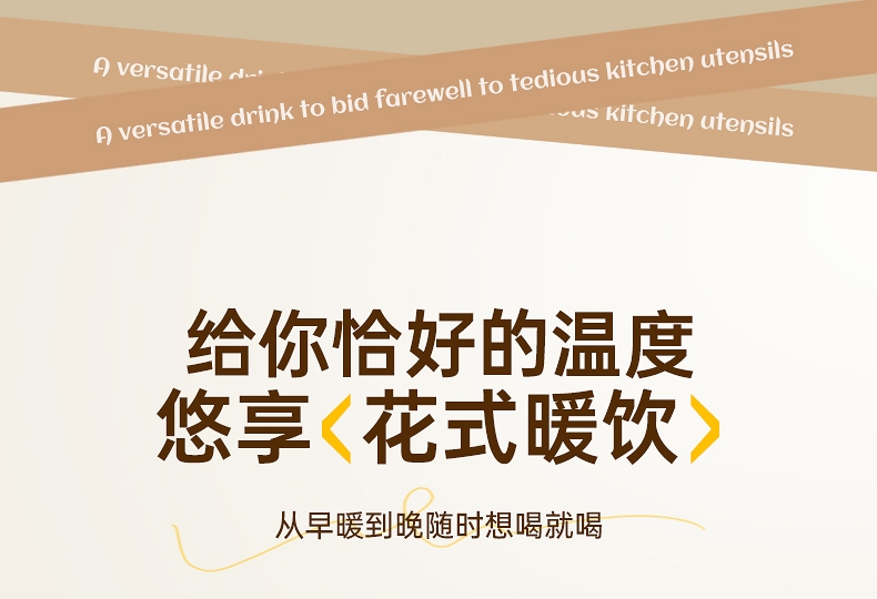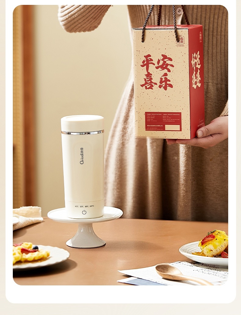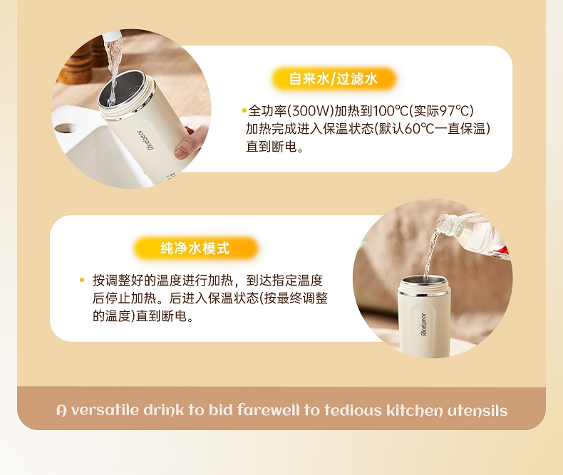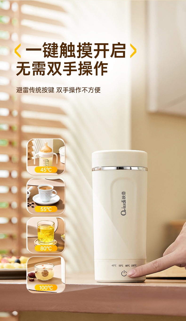 体积小巧轻盈,出行携带毫无负担外出差旅热饮自在随行;告别酒店公用水壶,无需担忧卫生问题随时享受健康暖饮;优配304不锈钢全心守护饮水健康易清洗无异味更安心;一键触摸控制四段温度可选花式冲饮,满足更多暖饮需求;450ml私享专属容量直接饮用既是养生杯也是保温杯