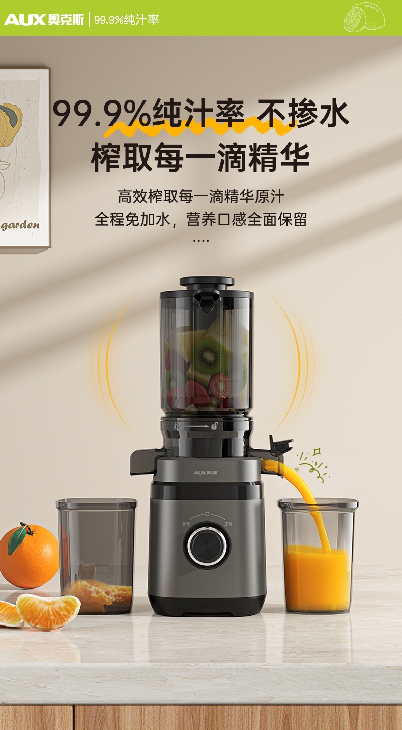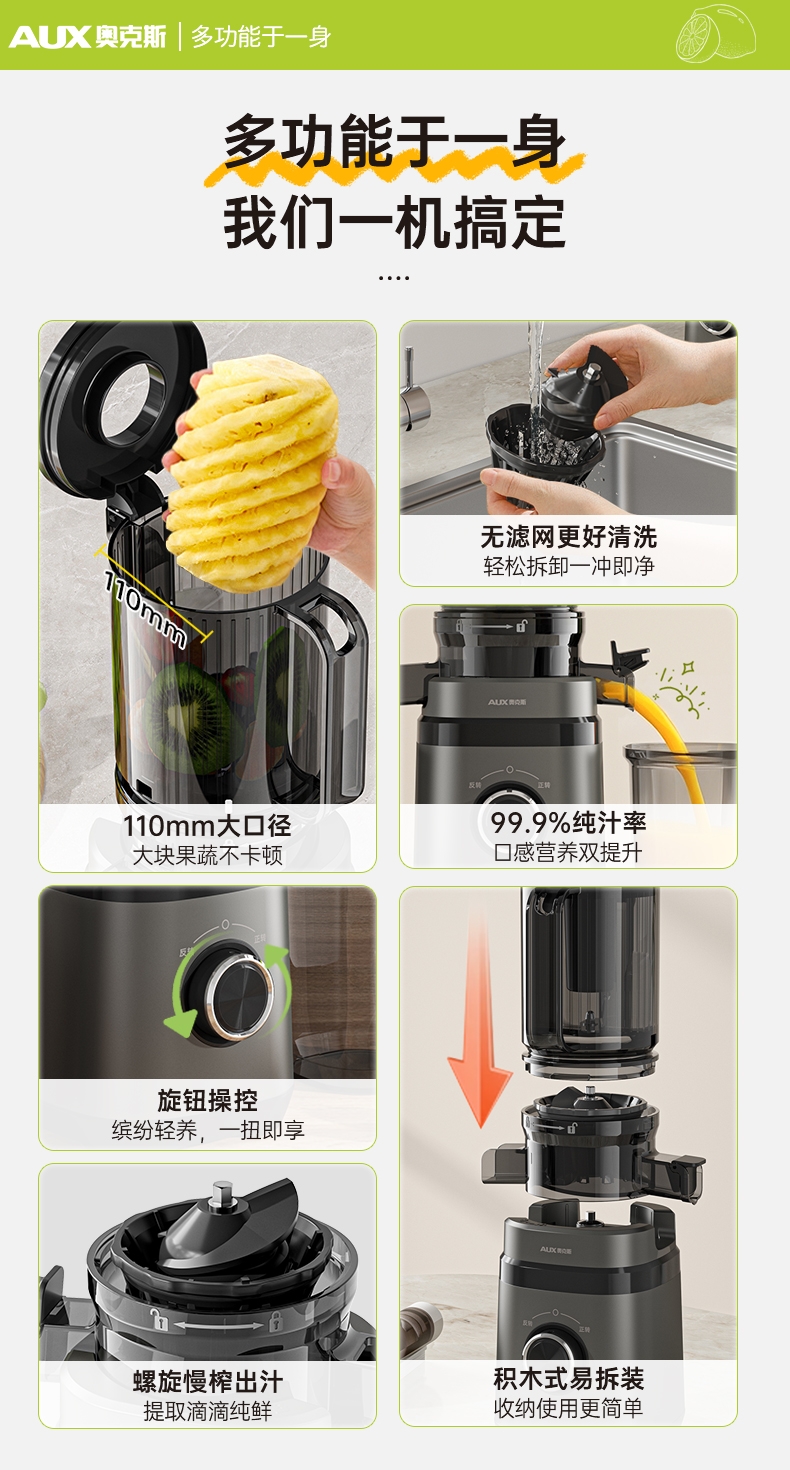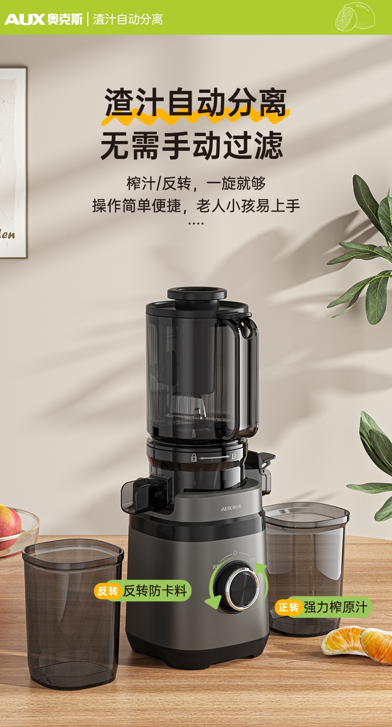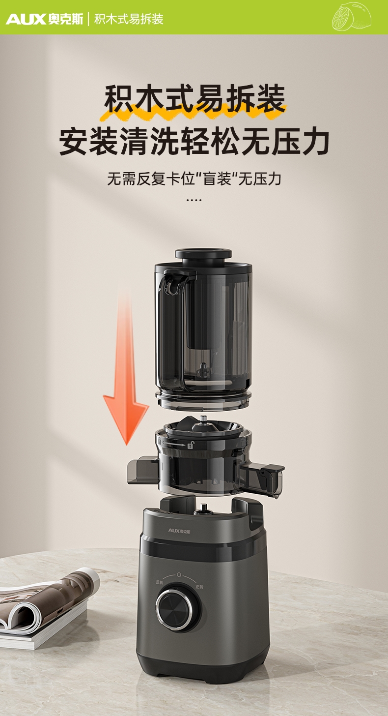 整块果蔬顺畅出汁,原汁原味乐享鲜榨;渣汁自动分离,无需手动过滤;积木式易拆装,安装清洗轻松无压力