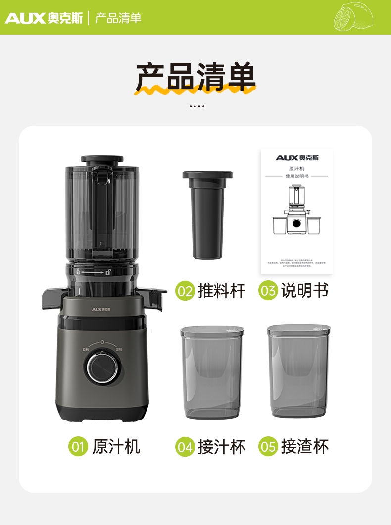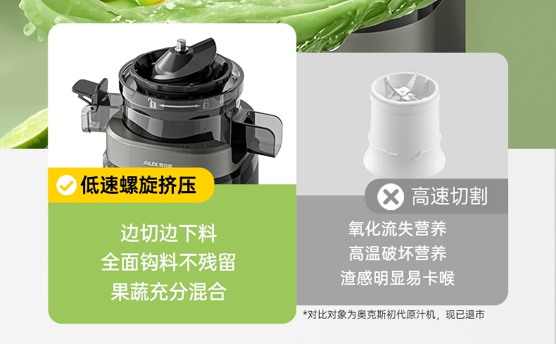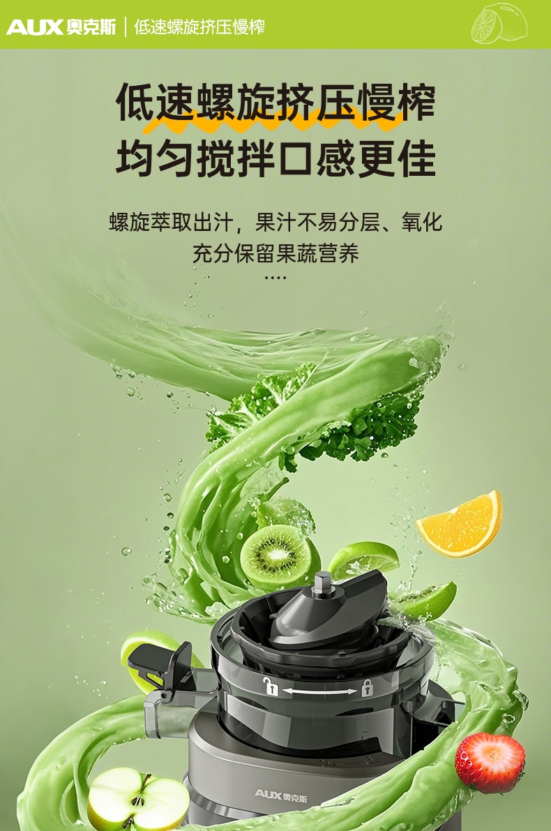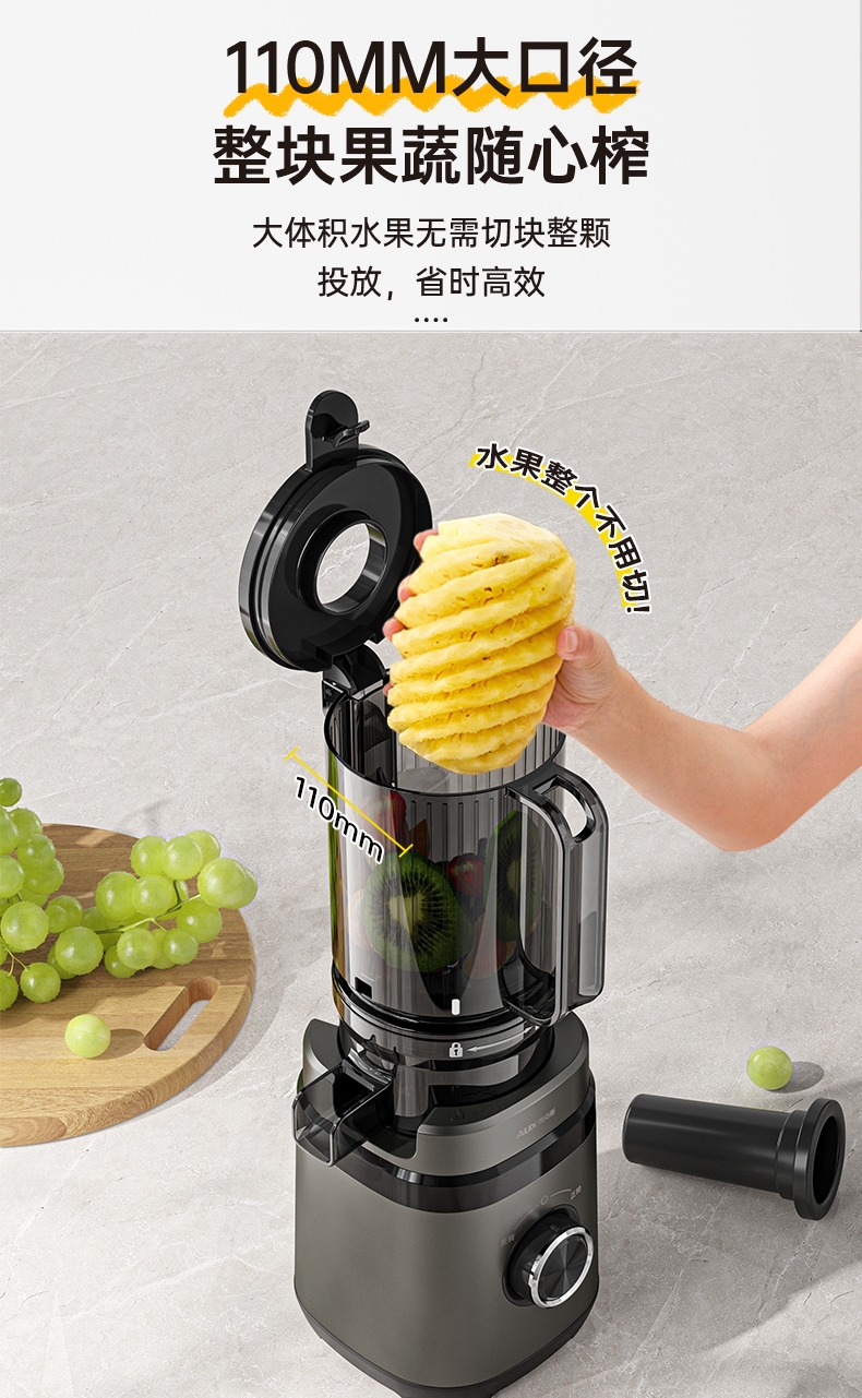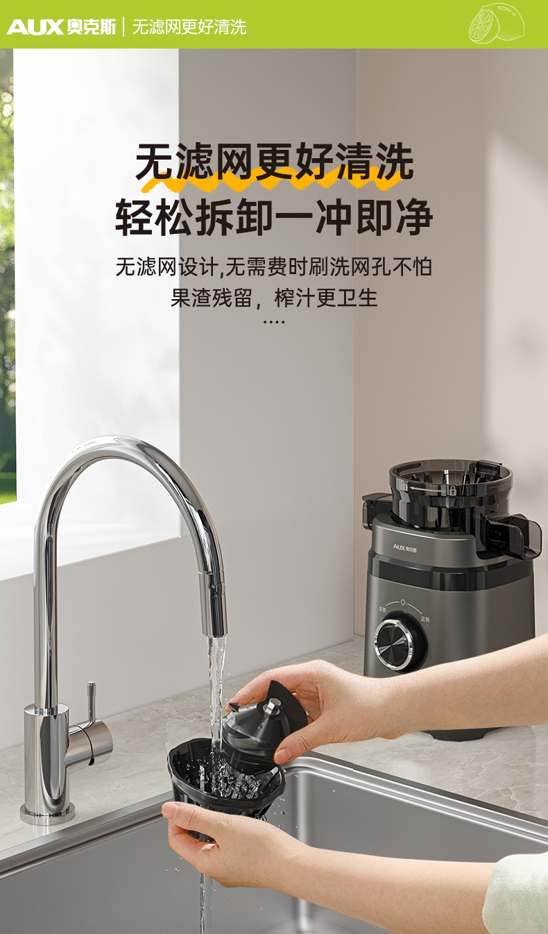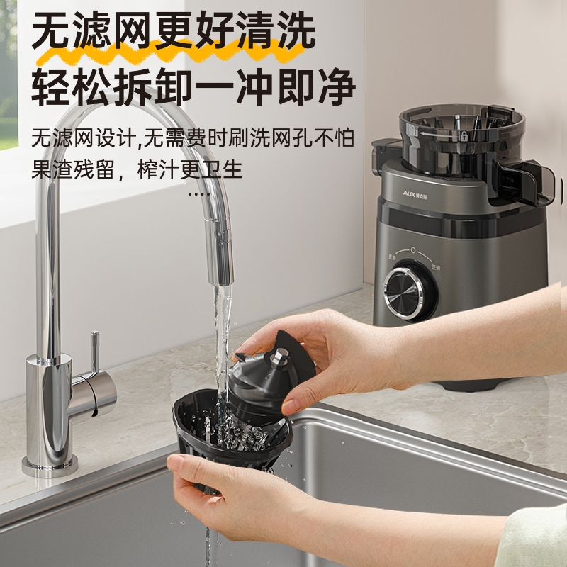 整块果蔬顺畅出汁,原汁原味乐享鲜榨;渣汁自动分离,无需手动过滤;积木式易拆装,安装清洗轻松无压力
