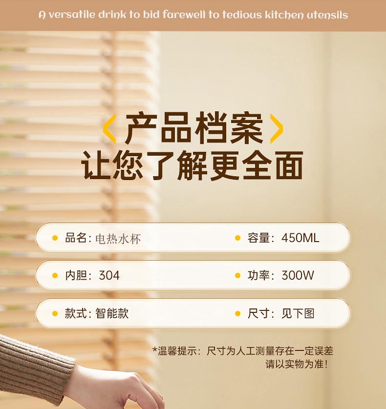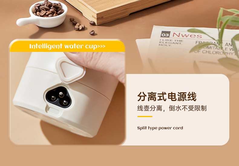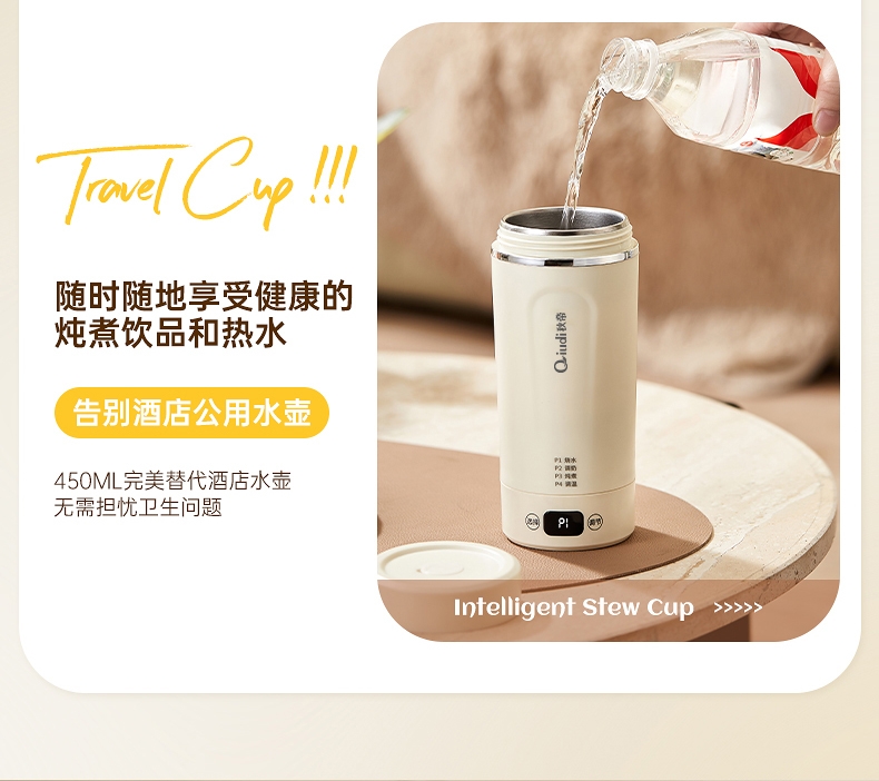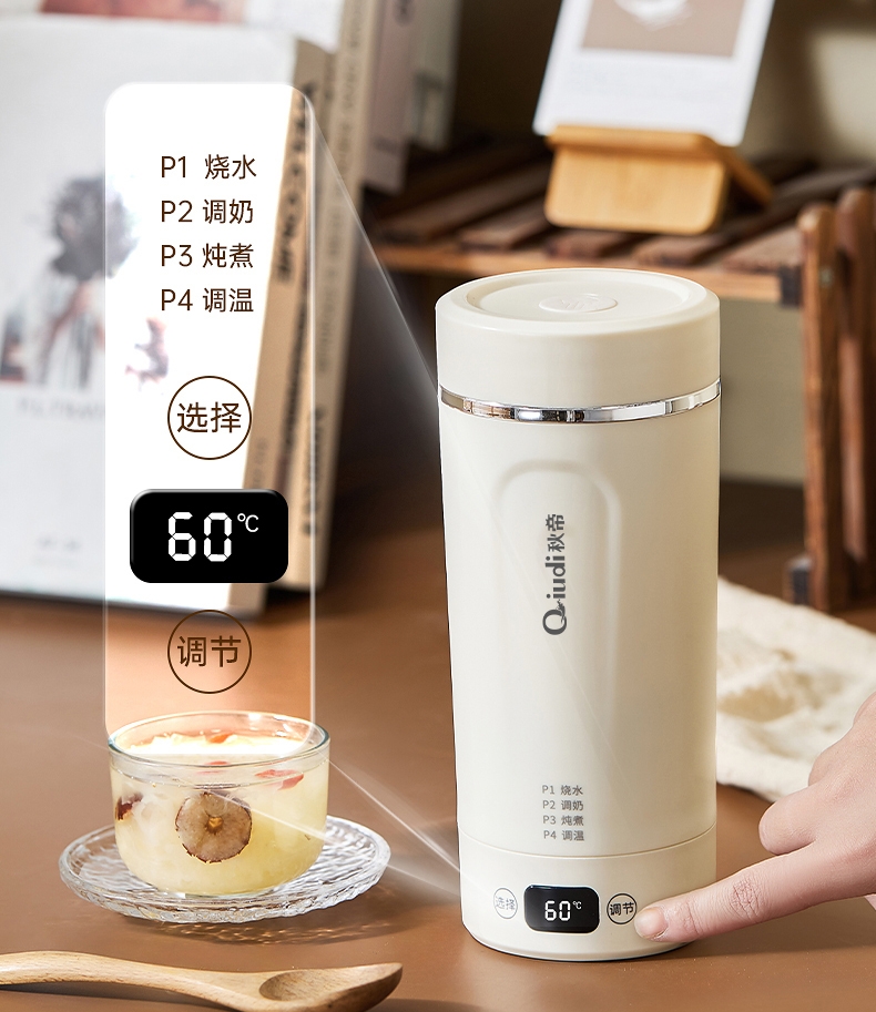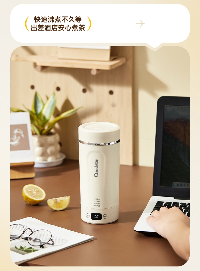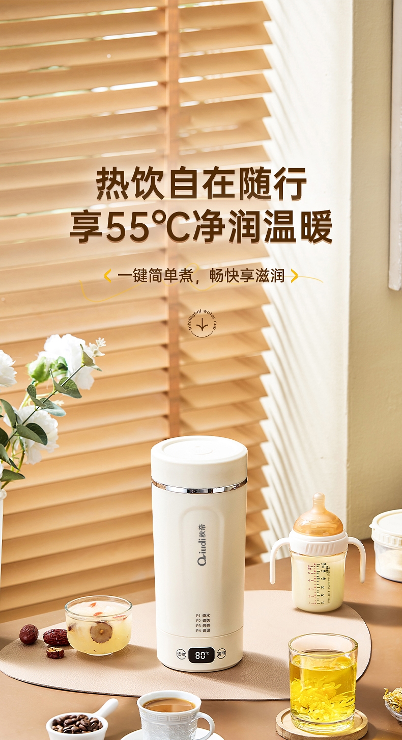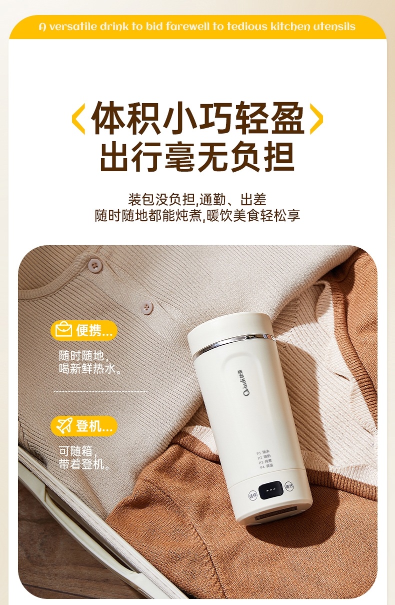 体积小巧轻盈,出行携带毫无负担外出差旅热饮自在随行;告别酒店公用水壶,无需担忧卫生问题随时享受健康暖饮;优配304不锈钢全心守护饮水健康易清洗无异味更安心;智能触控面板,简洁操作易懂轻松调控大屏实时显示温度;多段自由控温,加热完成自动进入保温状态给你恰好温度
