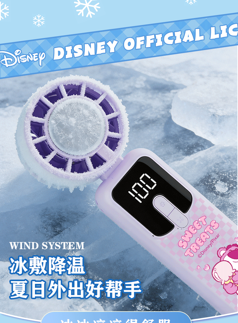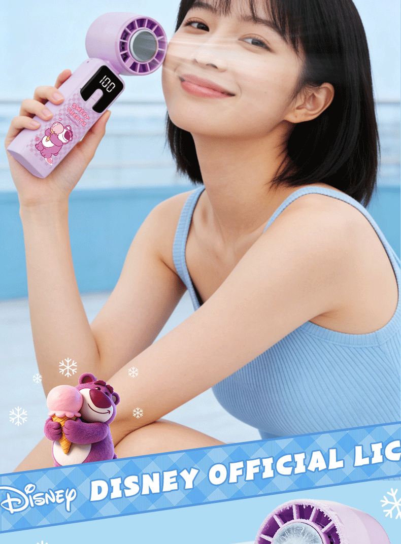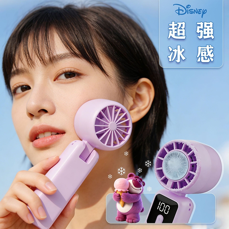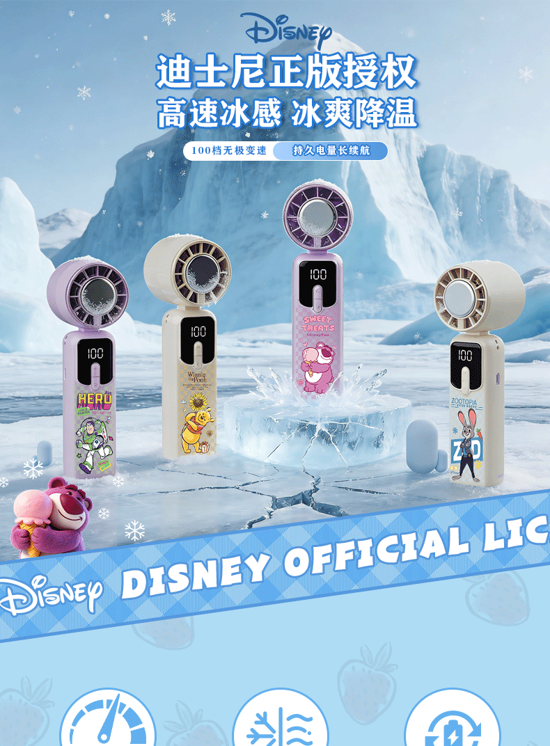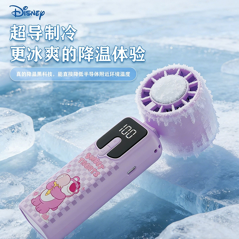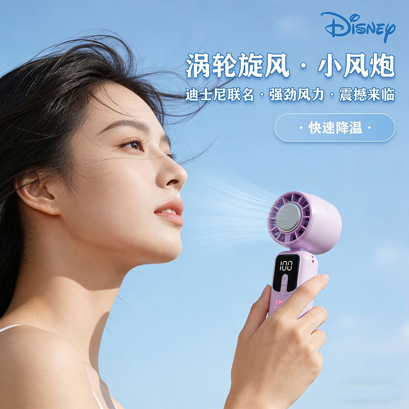 迪士尼正版 IP 加持,颜值实力双在线;100 档无极变速 + 冰感降温,吹出来的风自带凉;智能数显 + 长续航,出门一整天都不慌