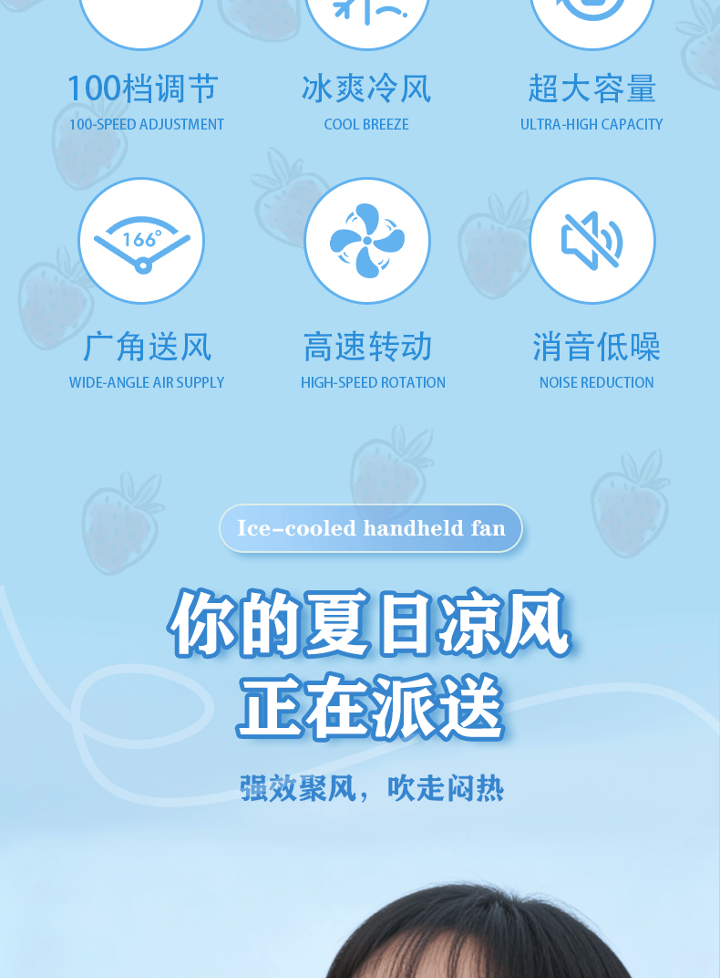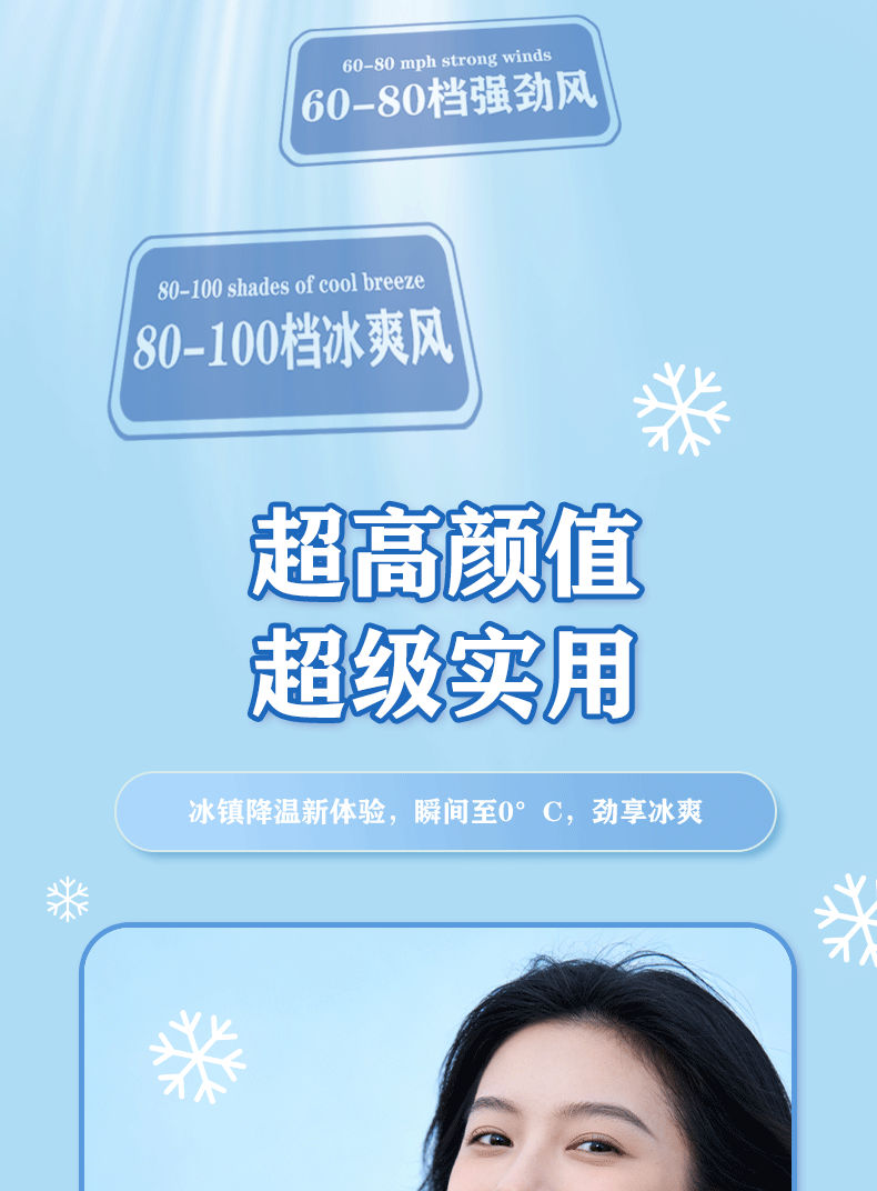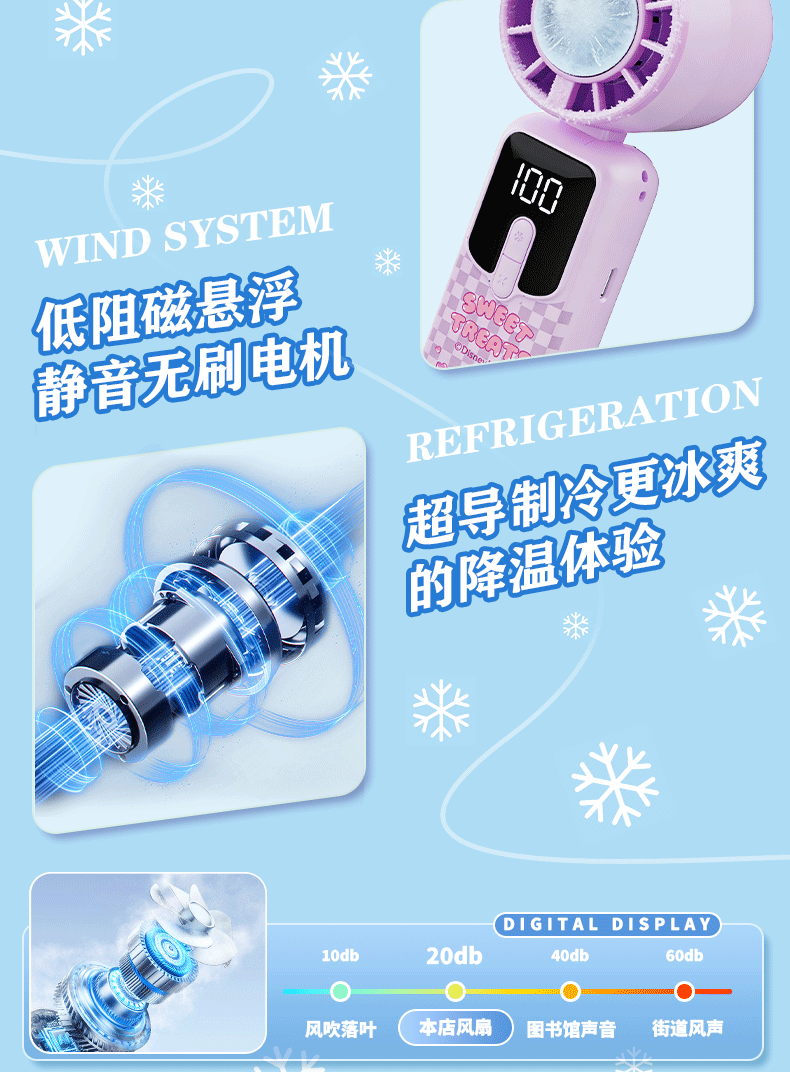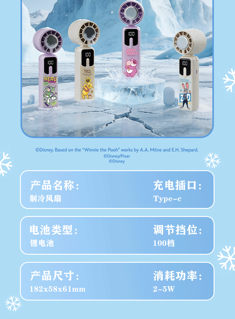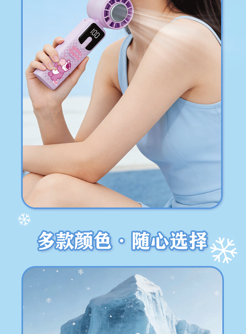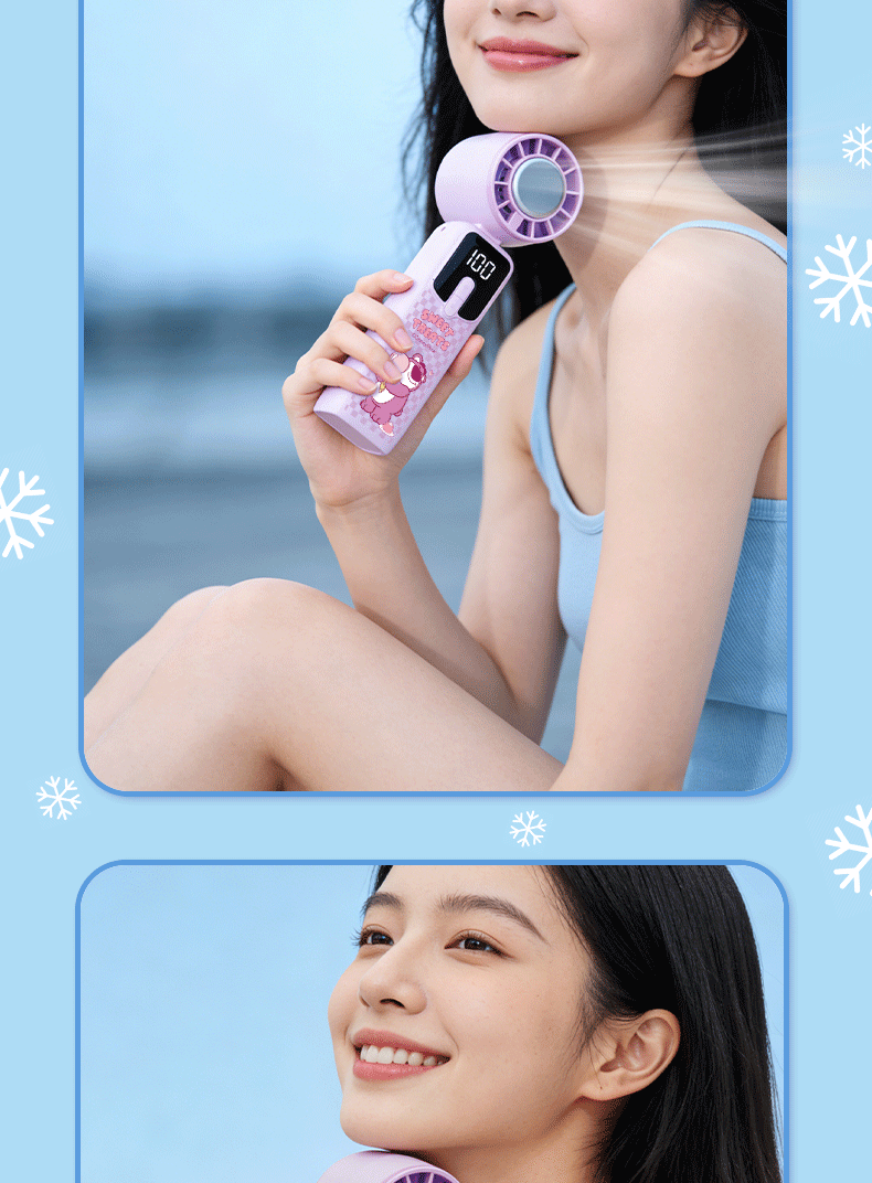 迪士尼正版 IP 加持,颜值实力双在线;100 档无极变速 + 冰感降温,吹出来的风自带凉;智能数显 + 长续航,出门一整天都不慌
