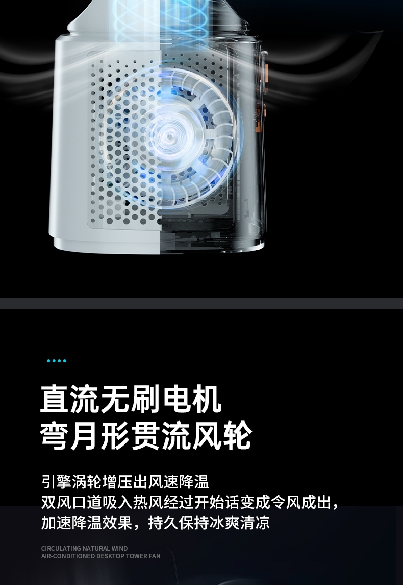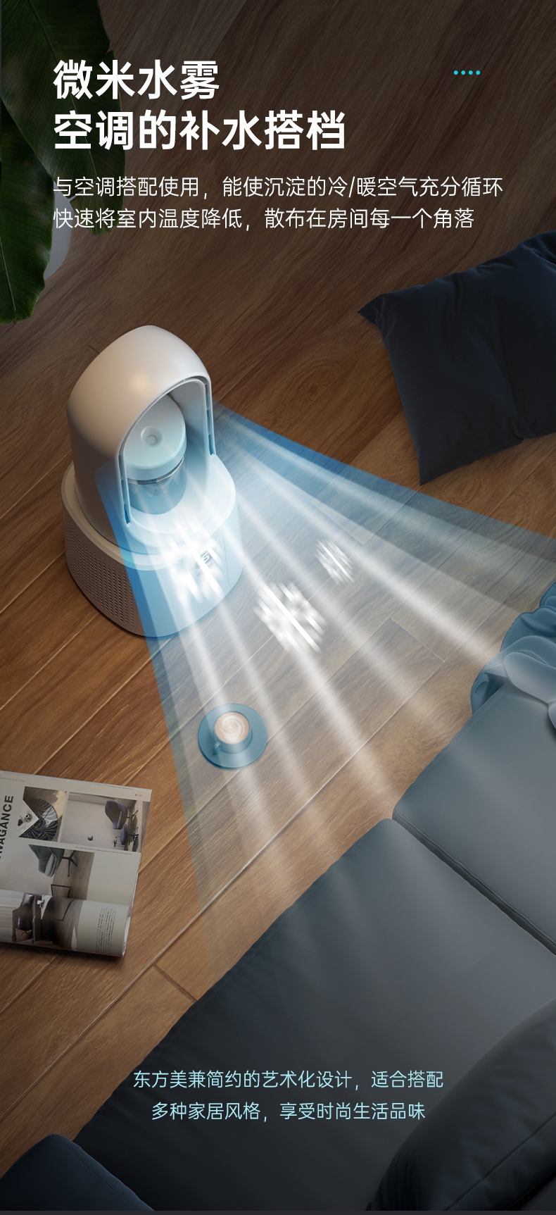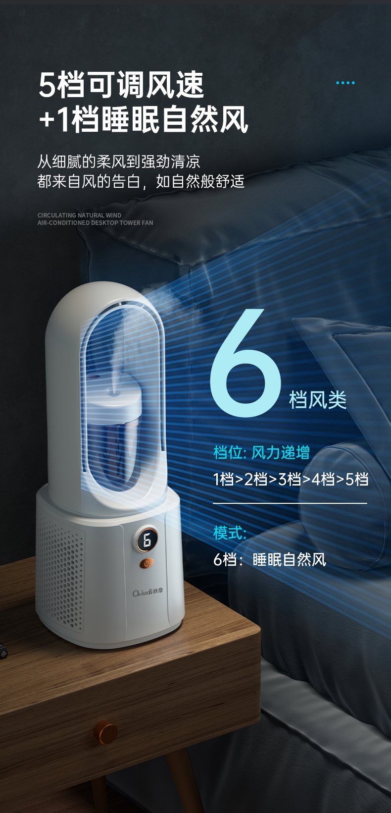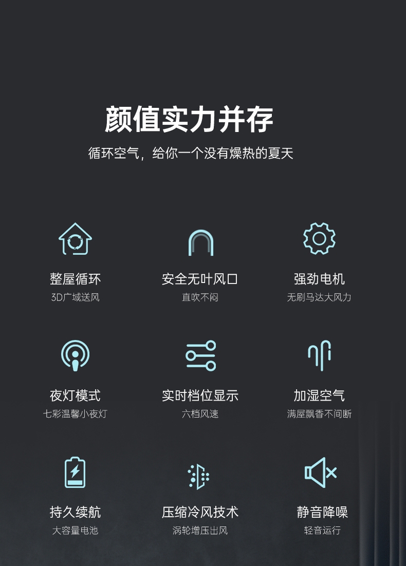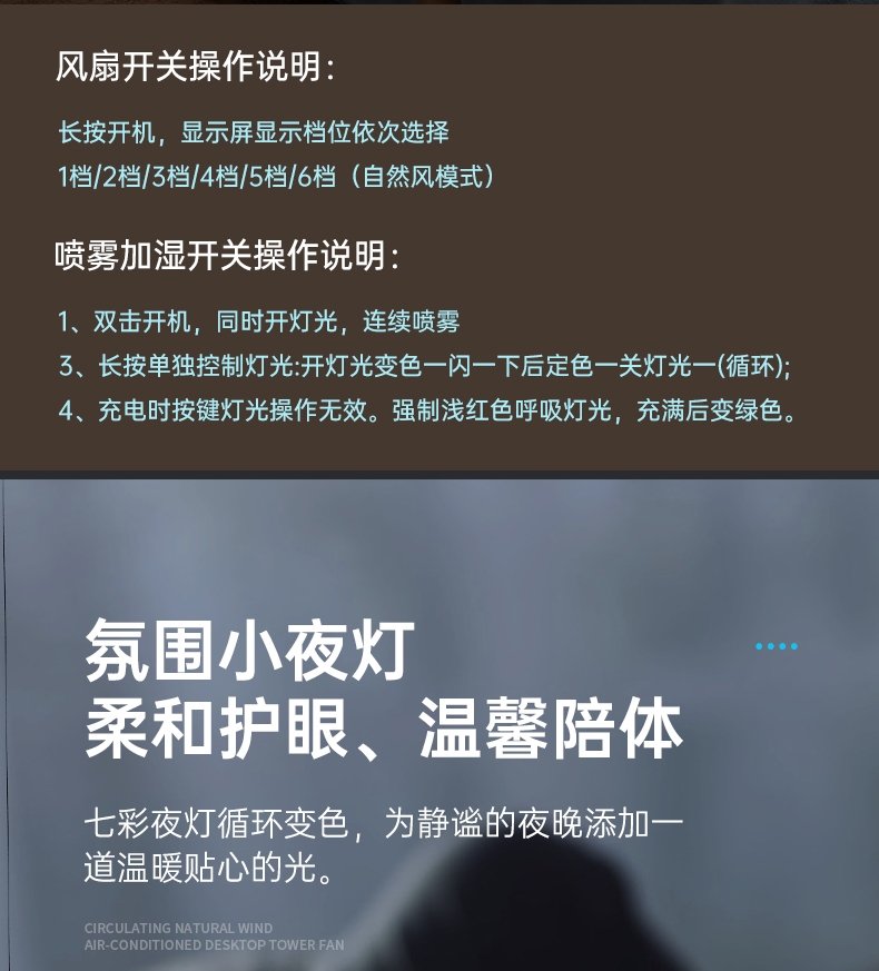 加湿喷雾风扇一机两用,滋润空气循环整屋感官双重享受;优化贯通风道风力更加强劲,送风距离更远产生噪音更小;独立加湿器轻松加湿喷雾,细腻水粒子有效降低周伟温度;六档可调风速从细腻到强劲,液晶显示屏实时档位更清楚;氛围小夜灯柔和护眼温馨陪伴,七彩夜灯循环变色更贴心