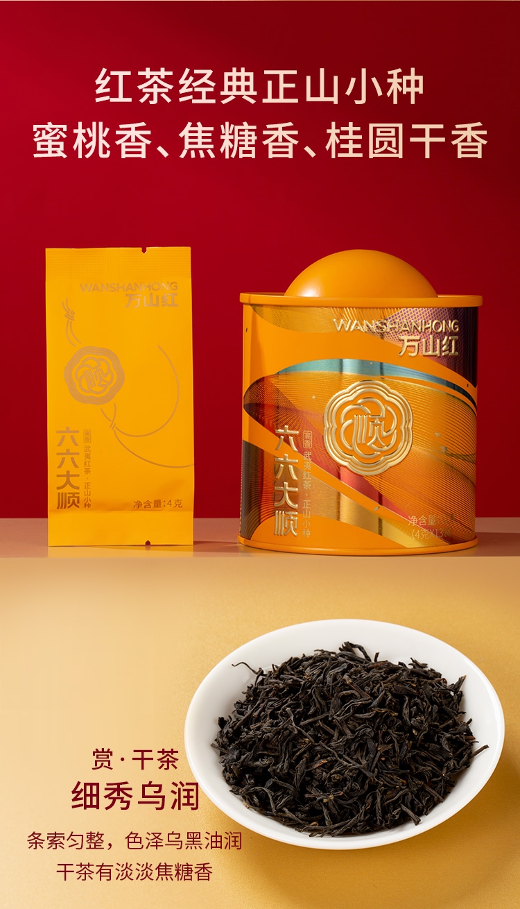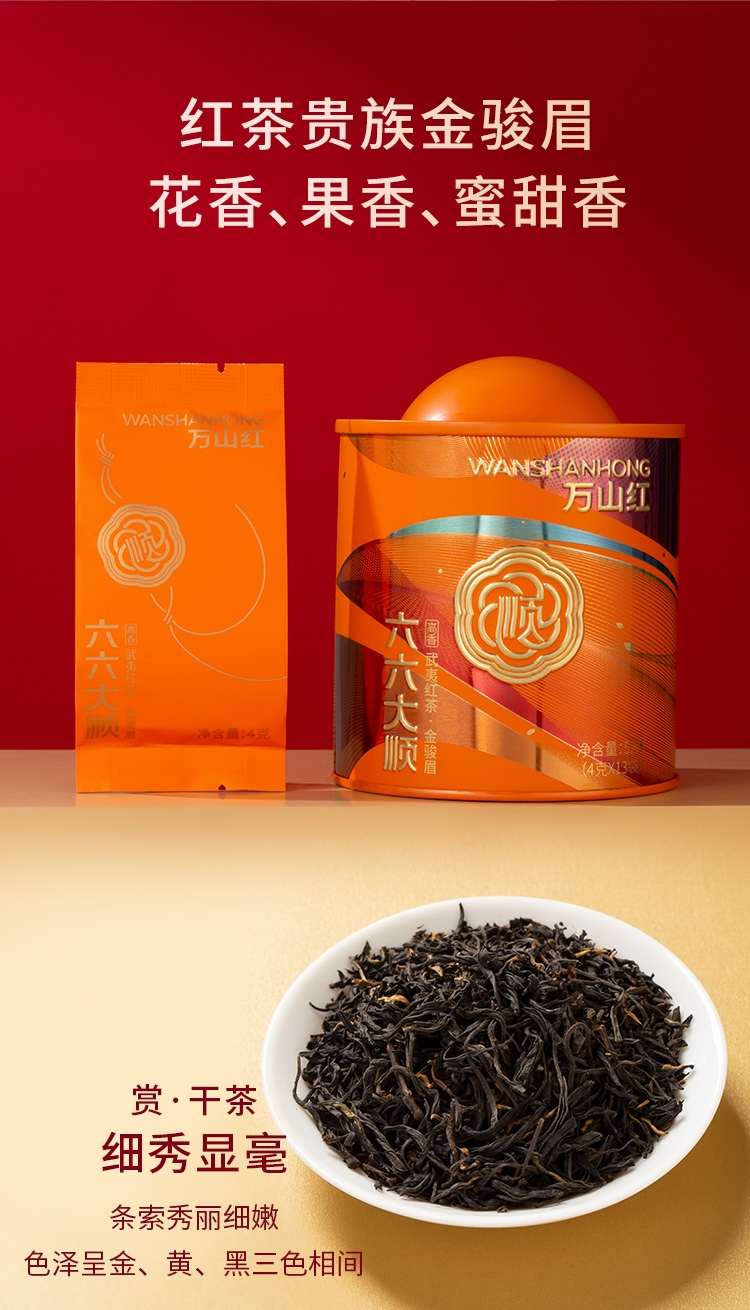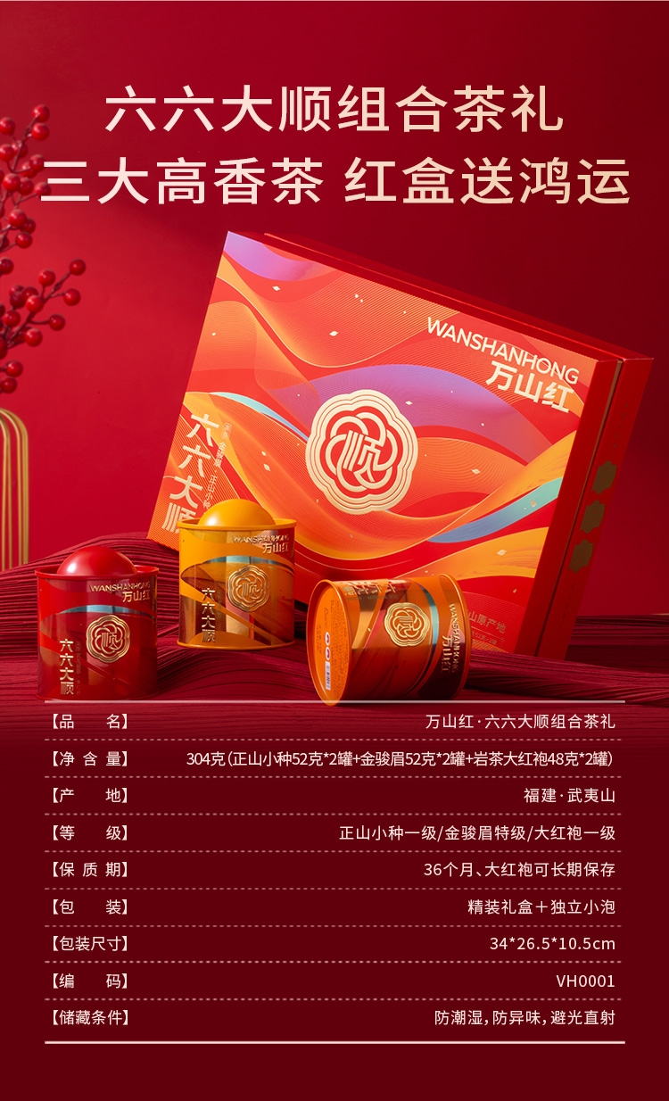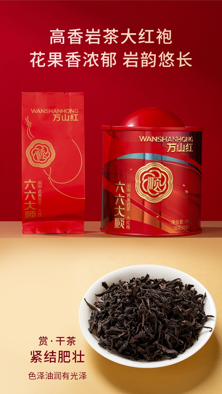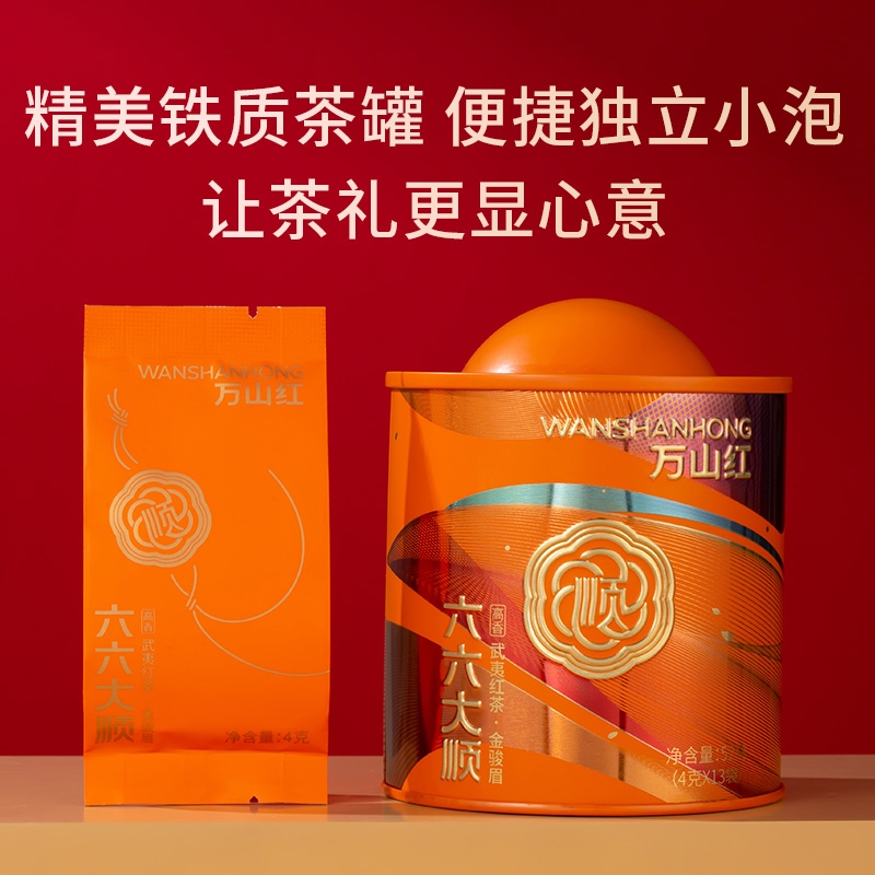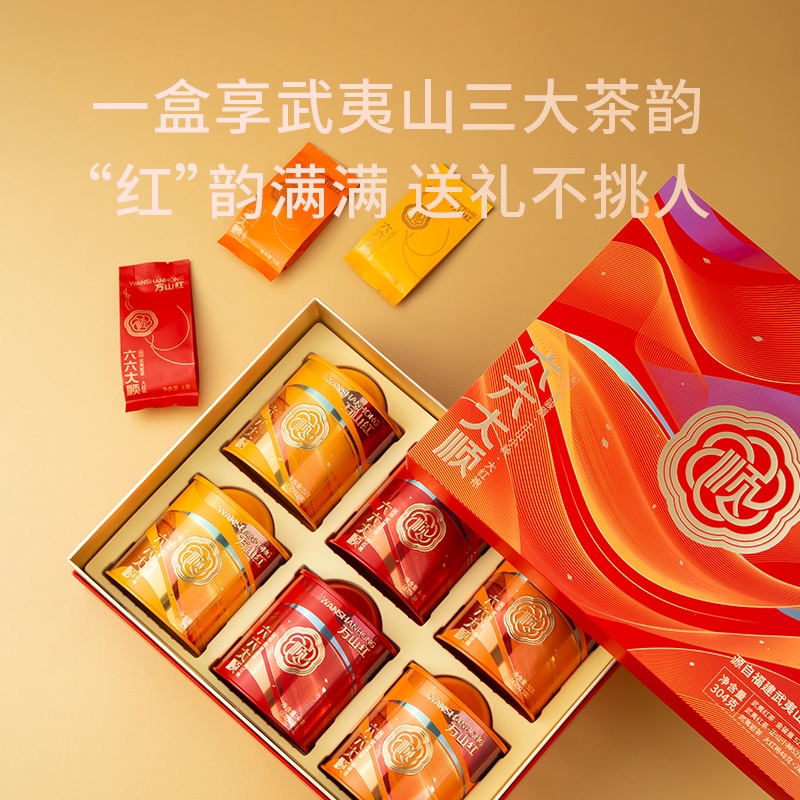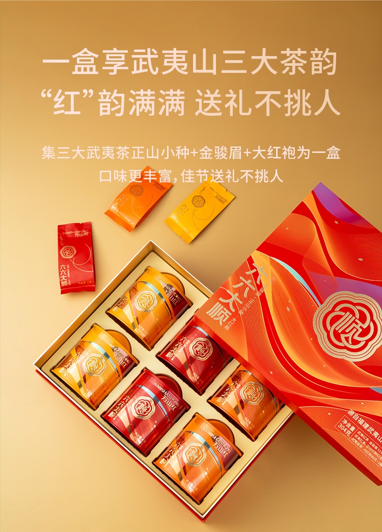 馈赠吉庆茶礼 ,三大茗茶六六大顺;;一盒享武夷山三大茶韵,风味各有千秋;;精美铁质茶罐, 便捷独立小泡 ,让茶礼更显心意。