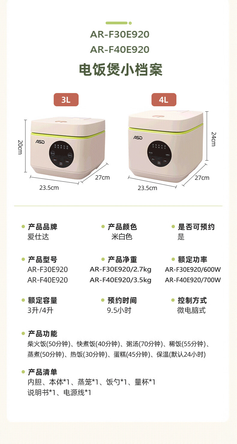 爱仕达 家用4L多功能电饭煲AR-F40E920