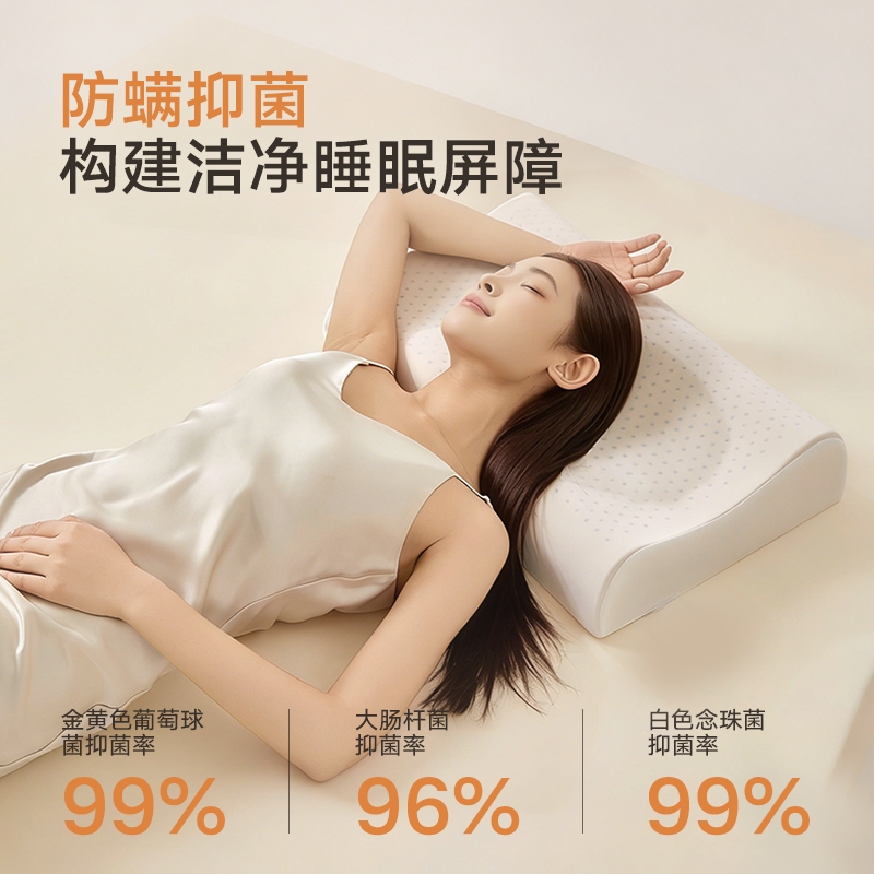 乳胶是一种天然抗菌材质;含量高达90%以上乳胶成分,多纬蜂窝状气孔;枕头高弹力,贴合人体脊椎生长曲度,仰睡侧睡都可以