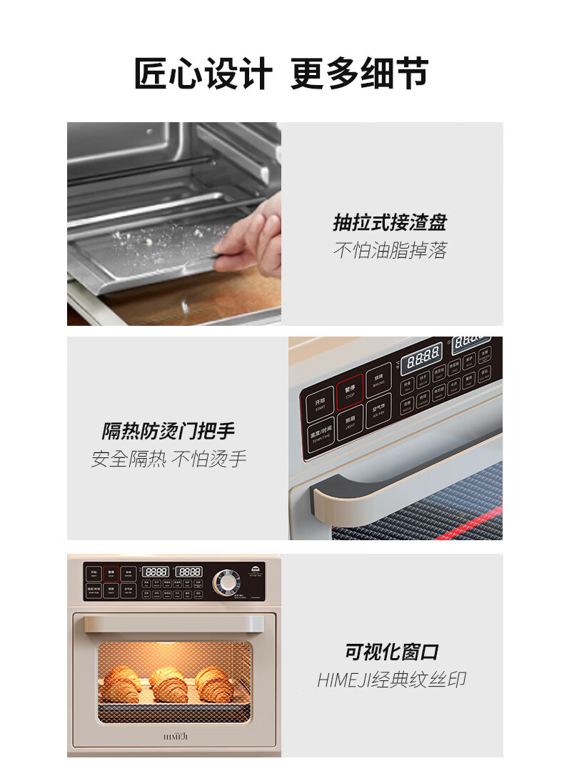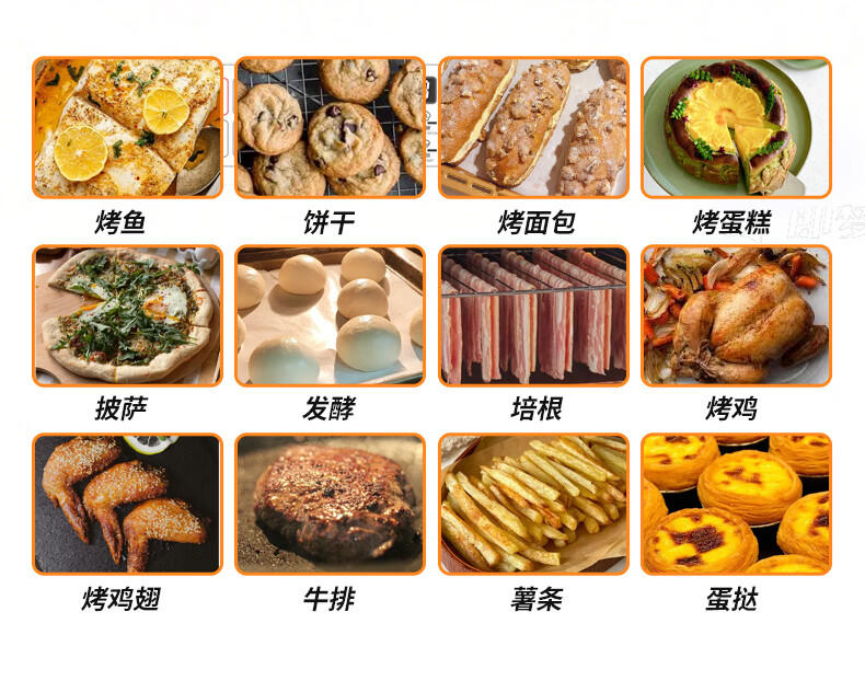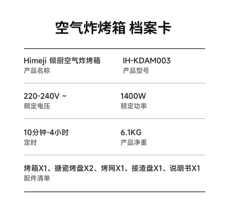 配置清单:烤箱*1、搪瓷烤盘*2、烤网*1、接渣盘*1、说明书*1