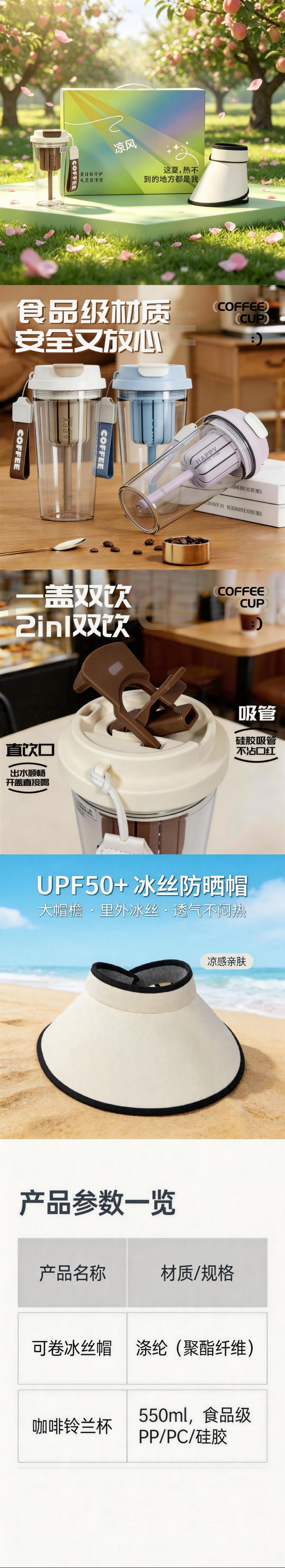 颜值与实用兼具,送礼自用两相宜;食品级咖啡杯,户外畅饮无负担;防晒帽+随行杯,出门清凉又省心