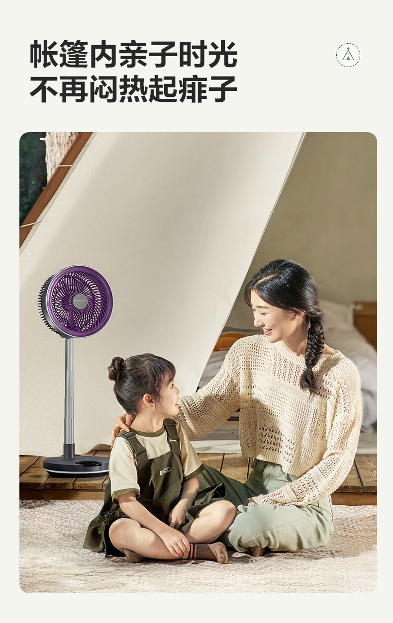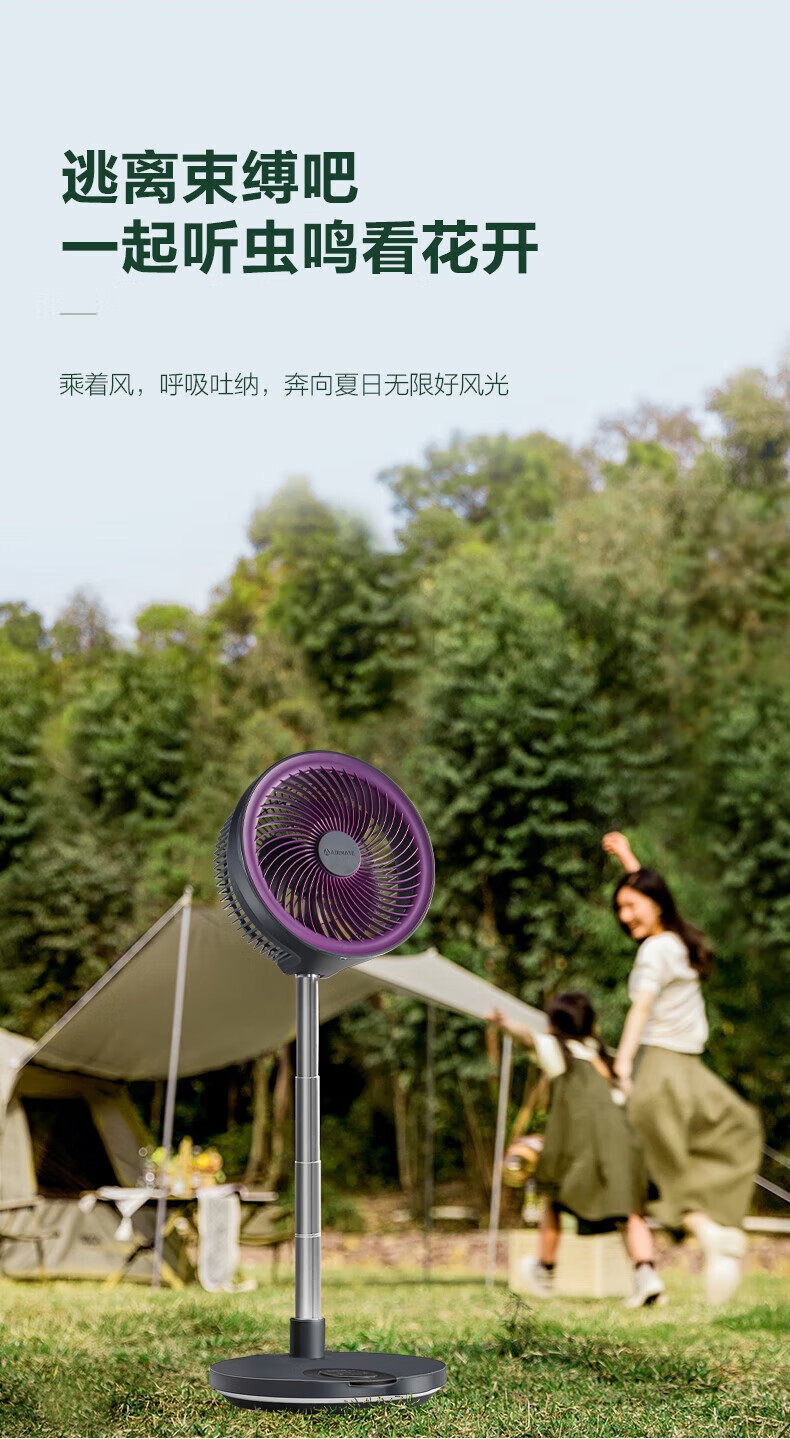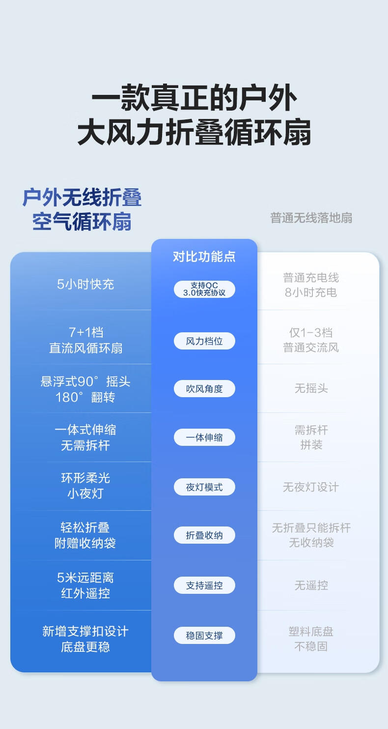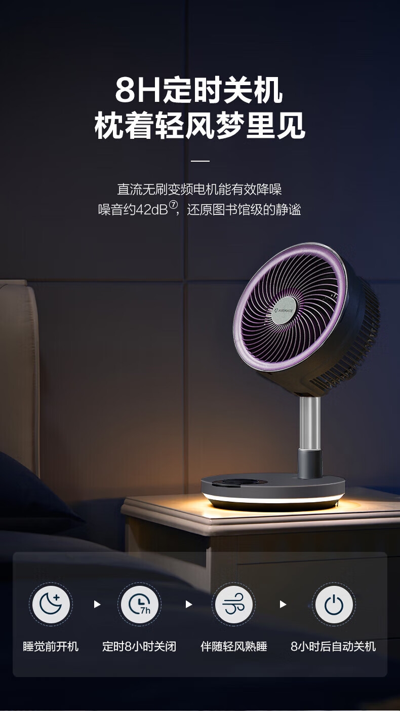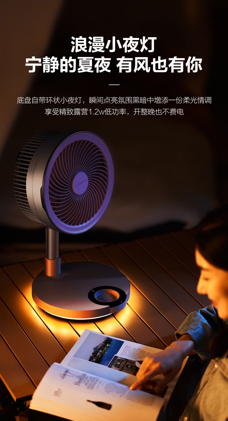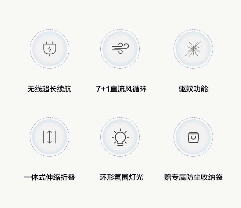 【定时】8小时定时关机;【电池容量】 3600mAh;【直流变频电机】直流电机,节能省电;【高度】高度自由伸缩,折叠收纳;【风量】 7档+1暴风自由选择