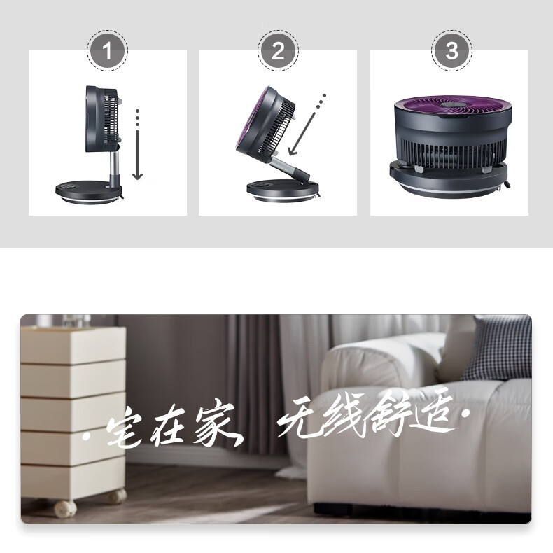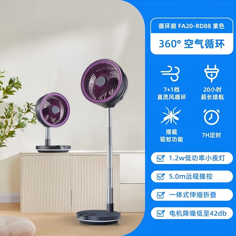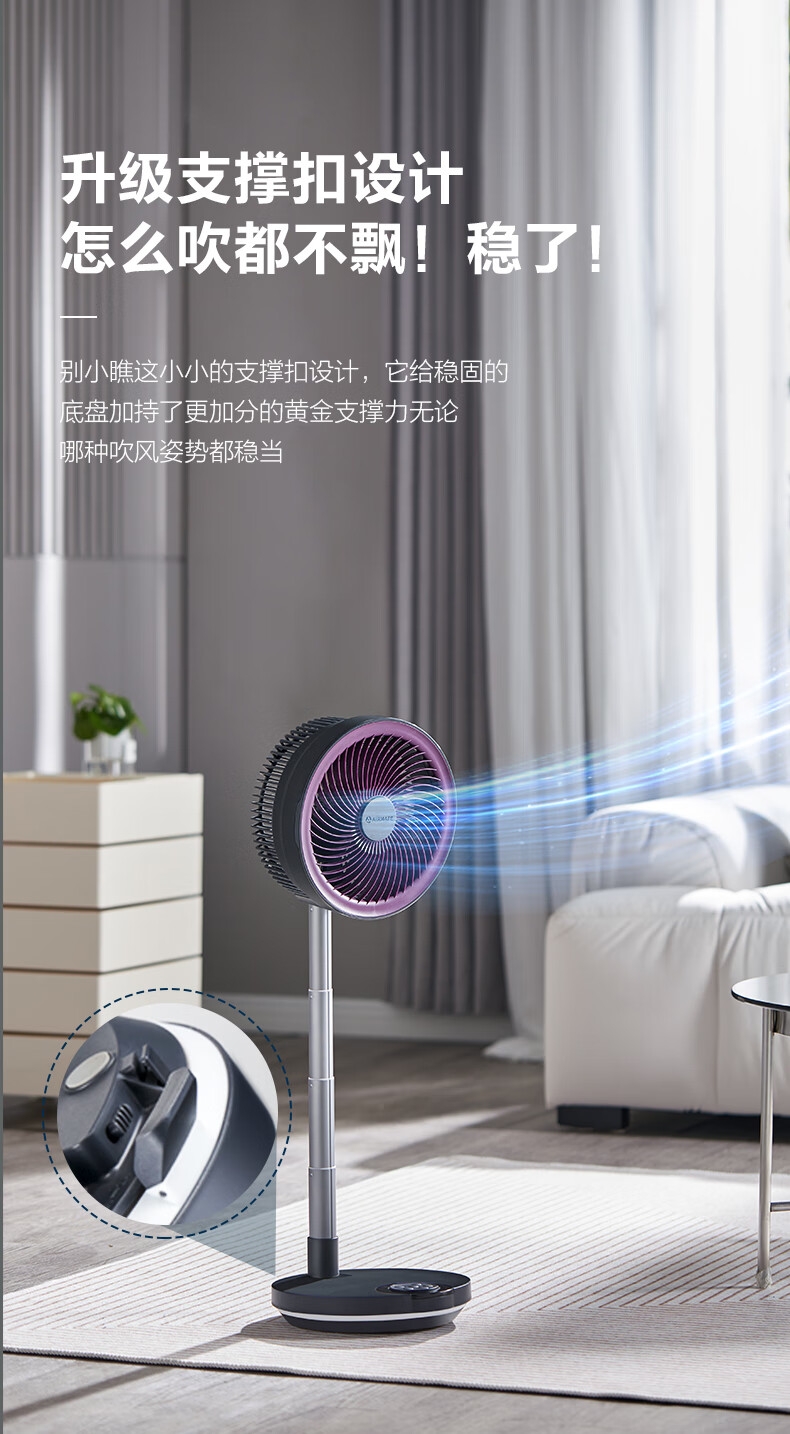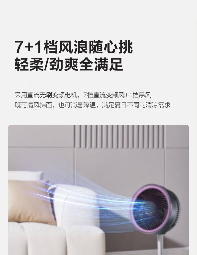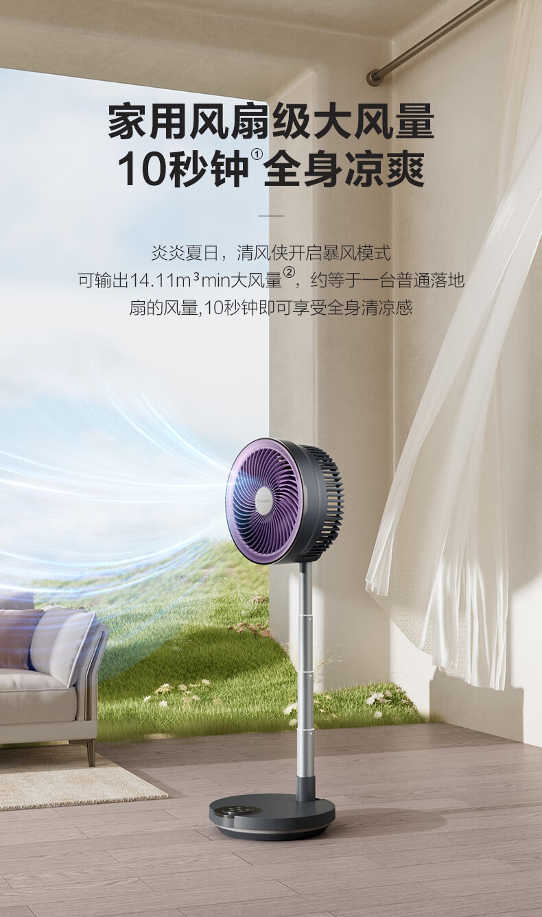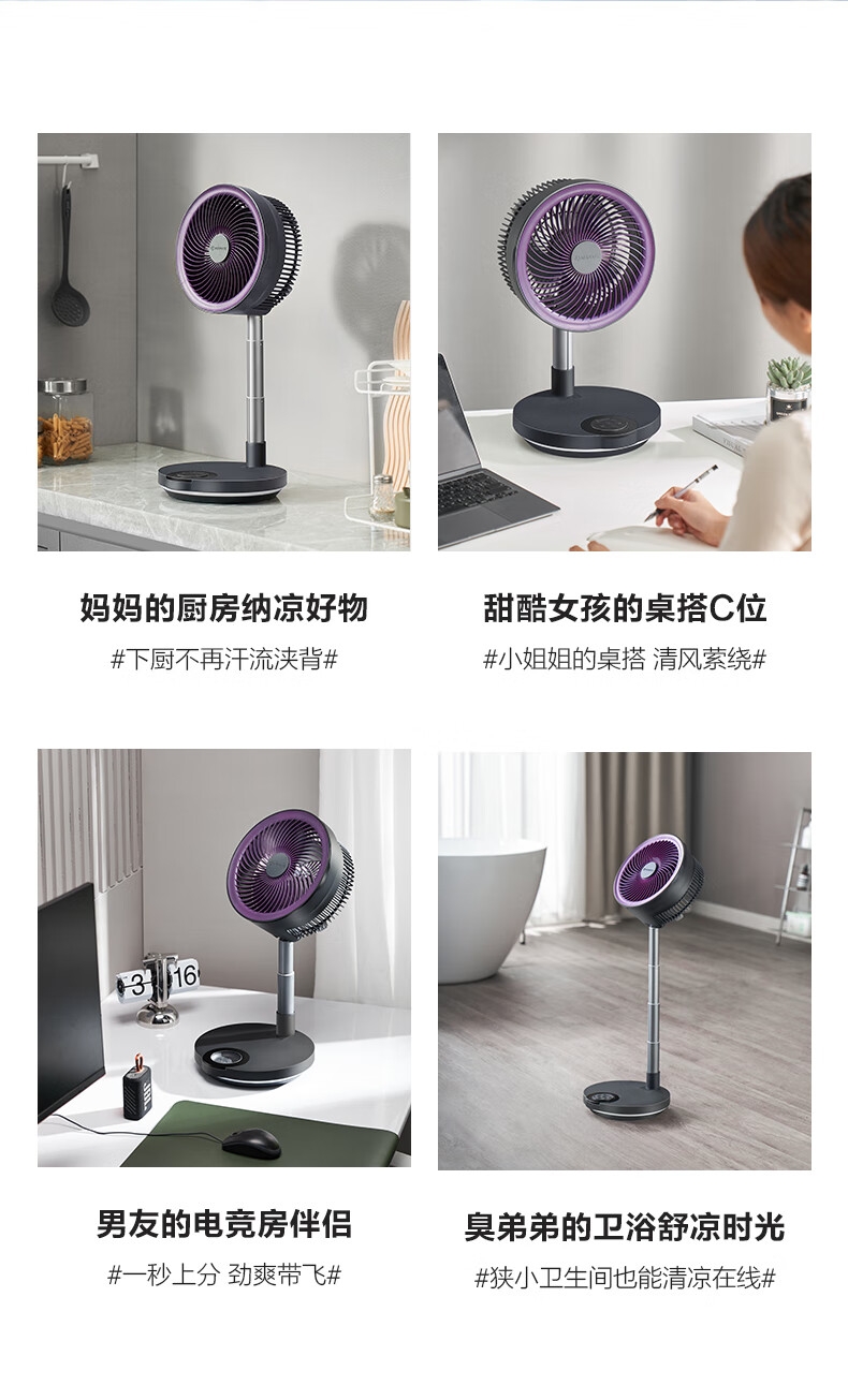 【定时】8小时定时关机;【电池容量】 3600mAh;【直流变频电机】直流电机,节能省电;【高度】高度自由伸缩,折叠收纳;【风量】 7档+1暴风自由选择