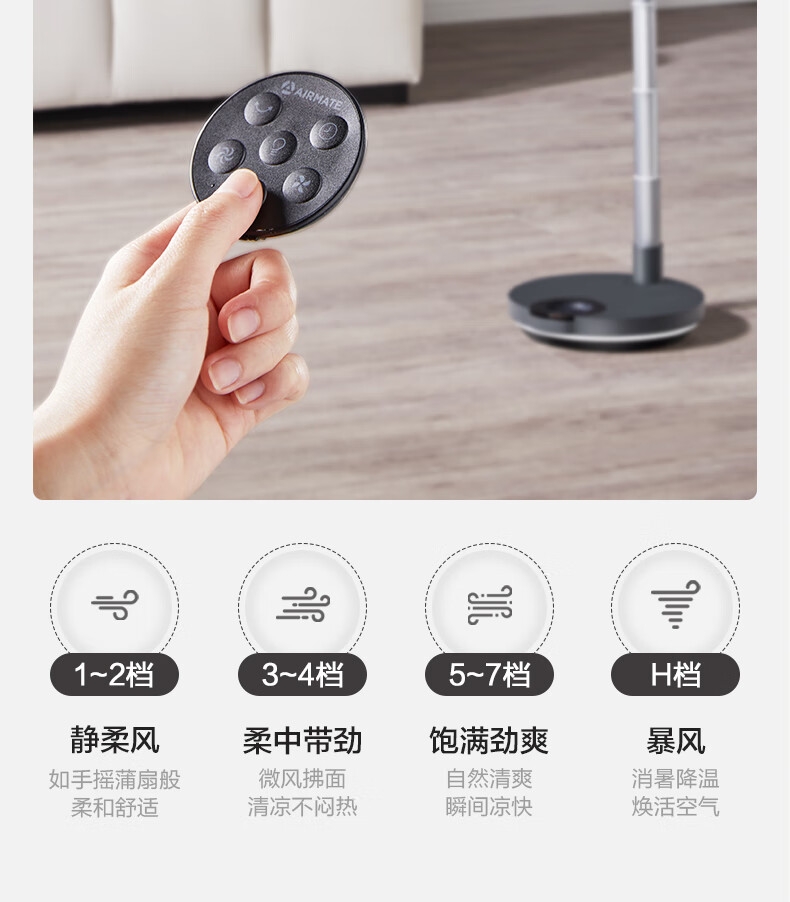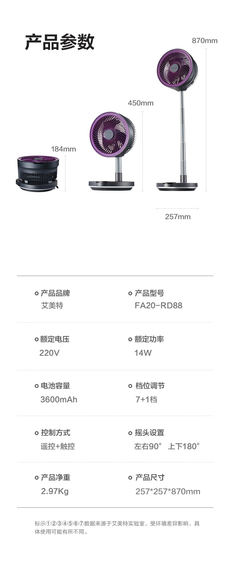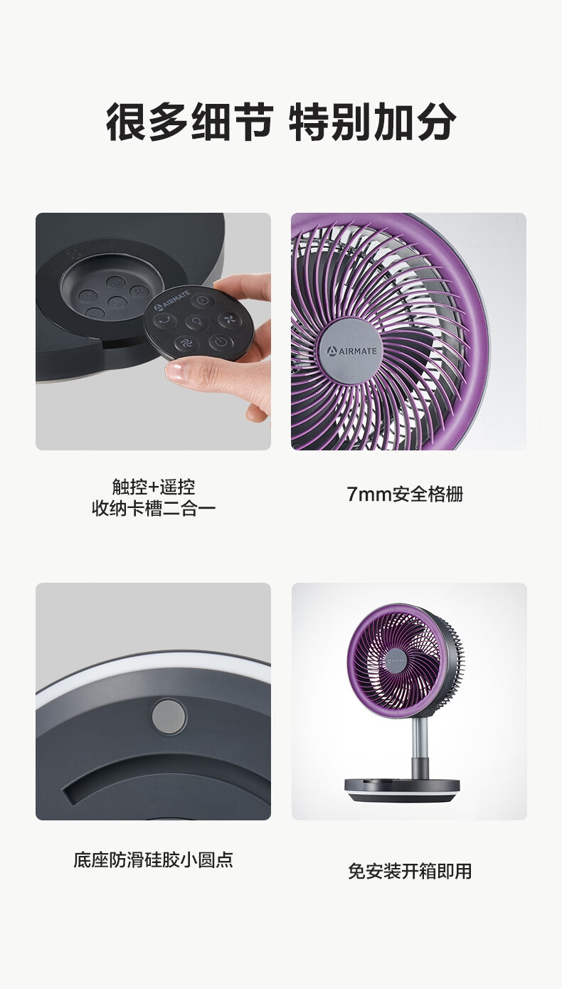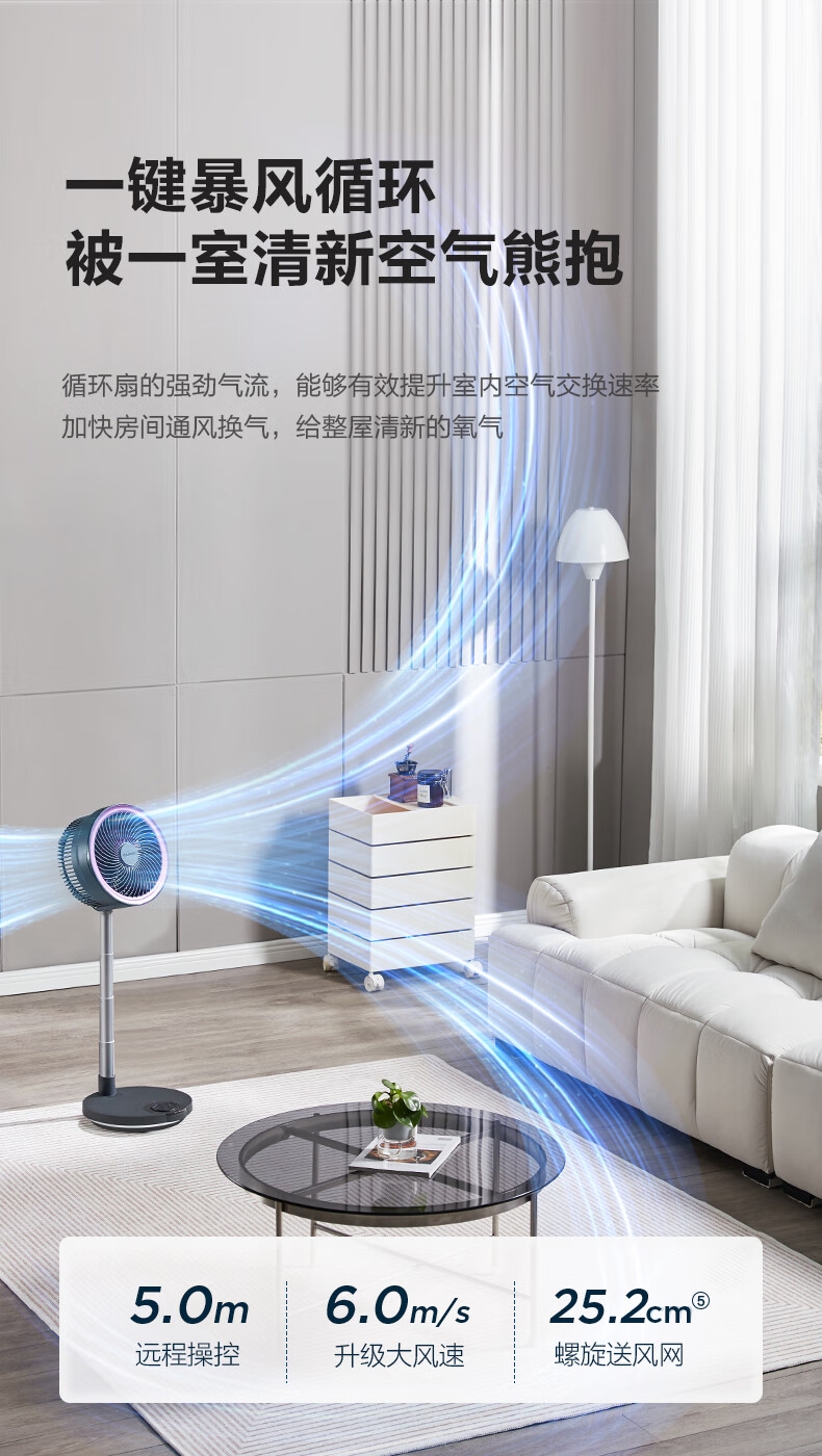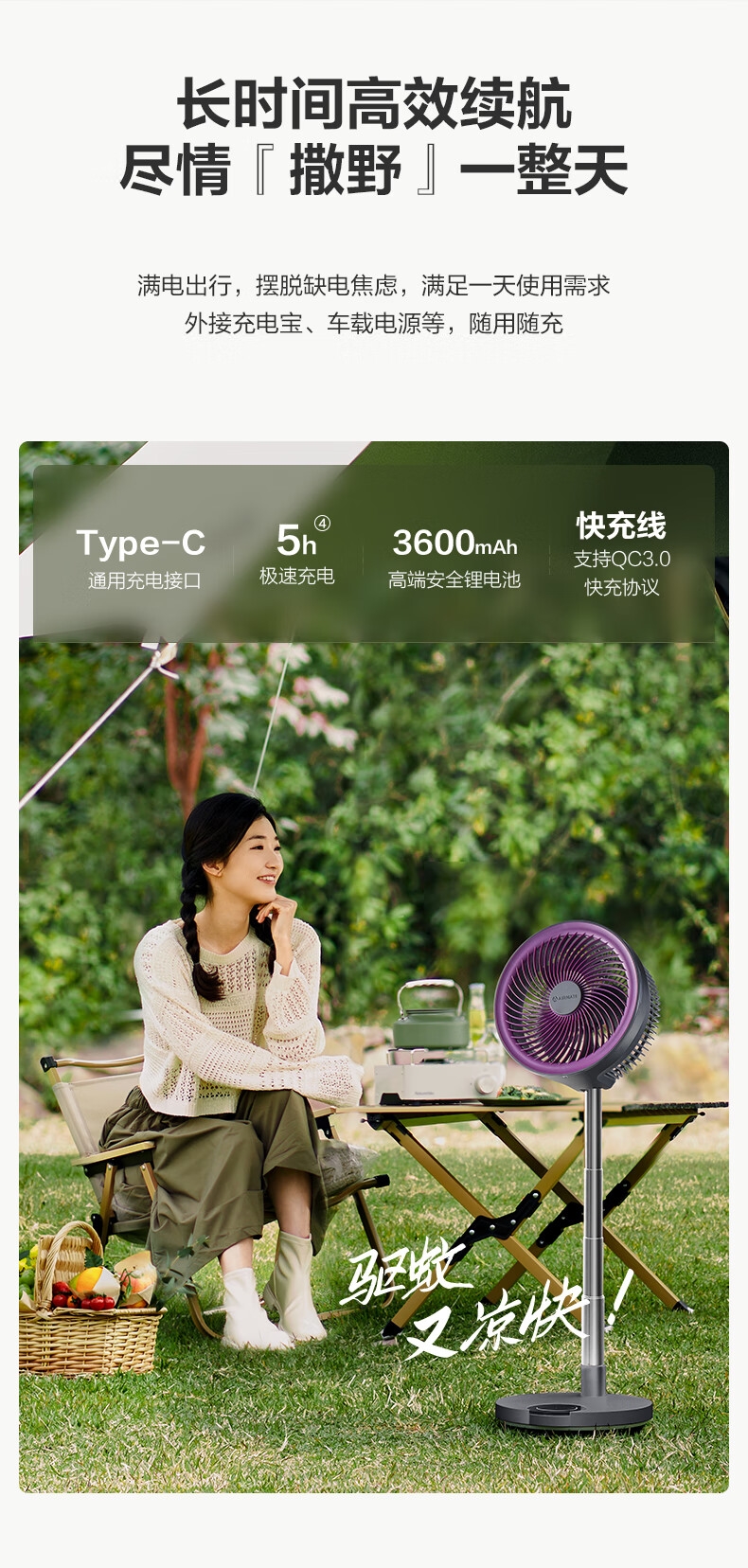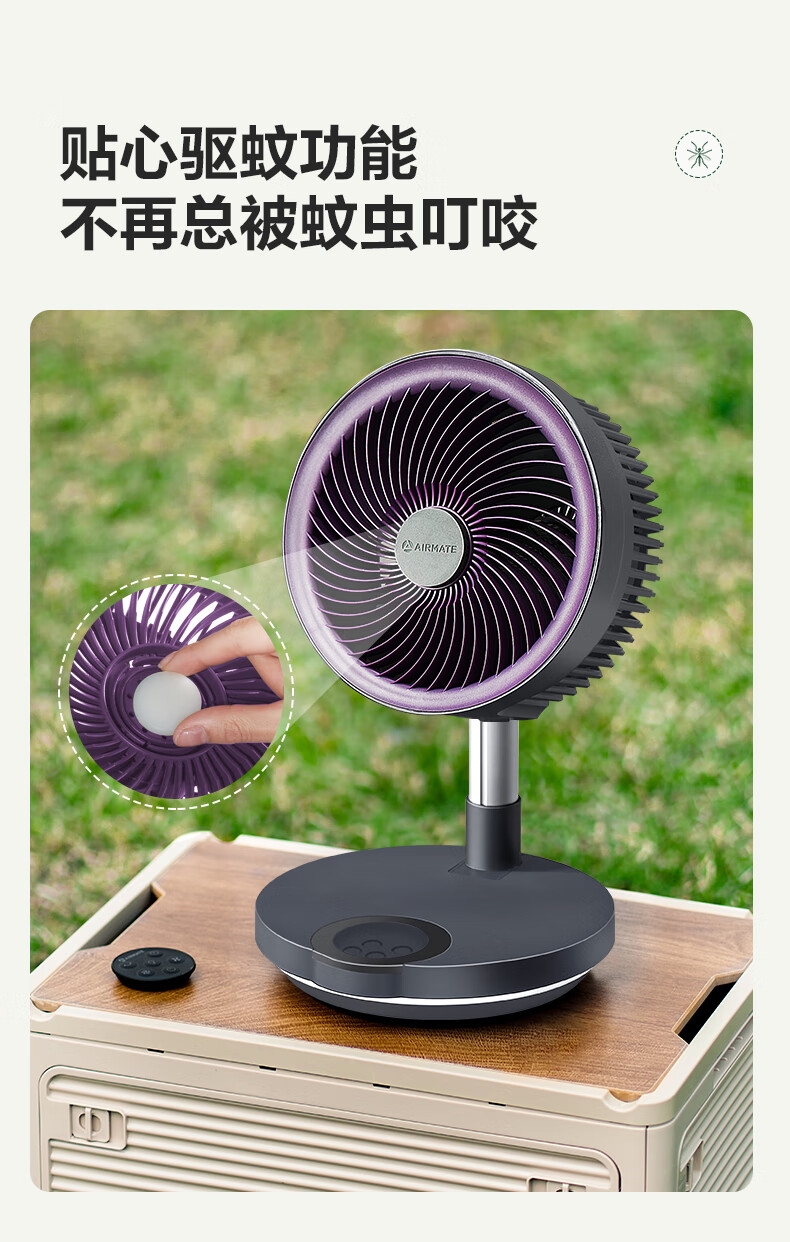 【定时】8小时定时关机;【电池容量】 3600mAh;【直流变频电机】直流电机,节能省电;【高度】高度自由伸缩,折叠收纳;【风量】 7档+1暴风自由选择