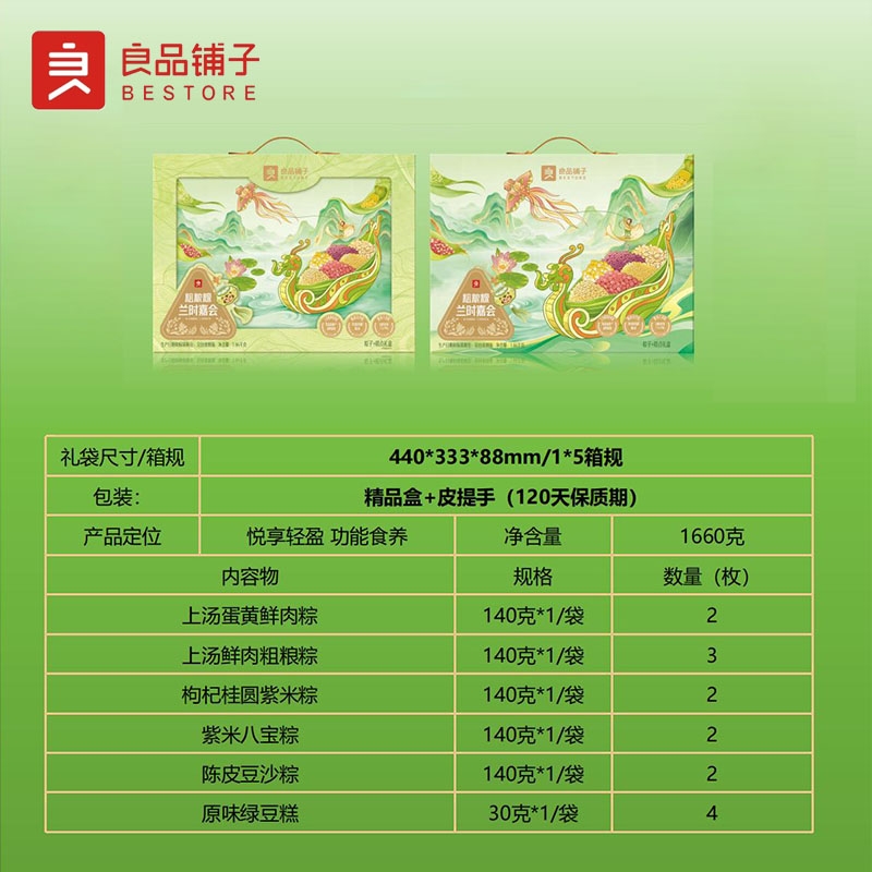 配置清单:上汤蛋黄鲜肉粽140g*2 上汤鲜肉粗粮粽140g*3 枸杞桂圆紫米粽140g*2 紫米八宝粽140g*2 陈皮豆沙粽140g*2 原味绿豆糕30g*4