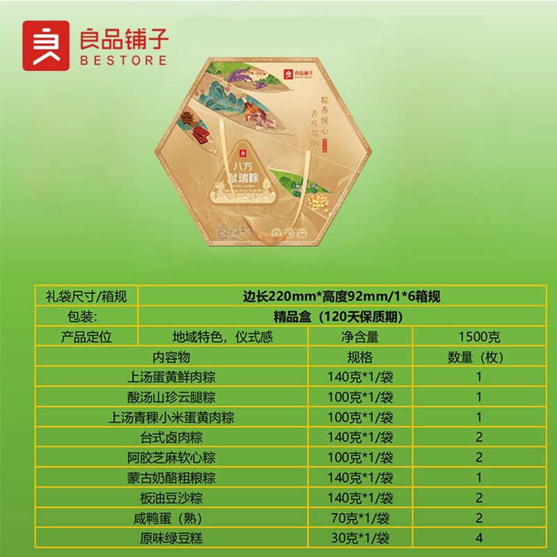配置清单:上汤蛋黄鲜肉粽140g 酸汤山珍云腿粽100g 上汤青稞小米蛋黄肉粽100g 台式卤肉粽140g*2 阿胶芝麻软心粽100g*2 蒙古奶酪粗粮粽140g 嘉兴板油红豆沙粽140g*2 咸鸭蛋(熟)70g*2 绿豆糕30g*4
