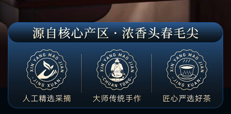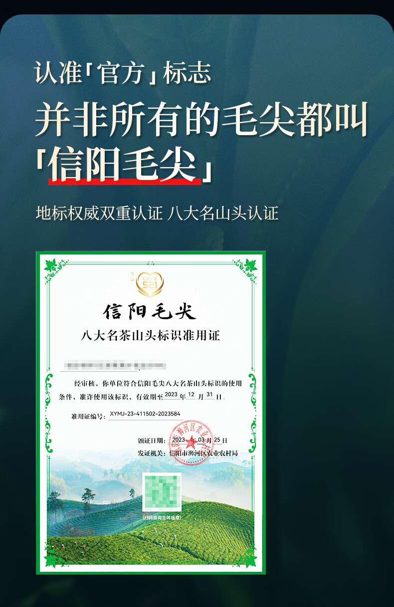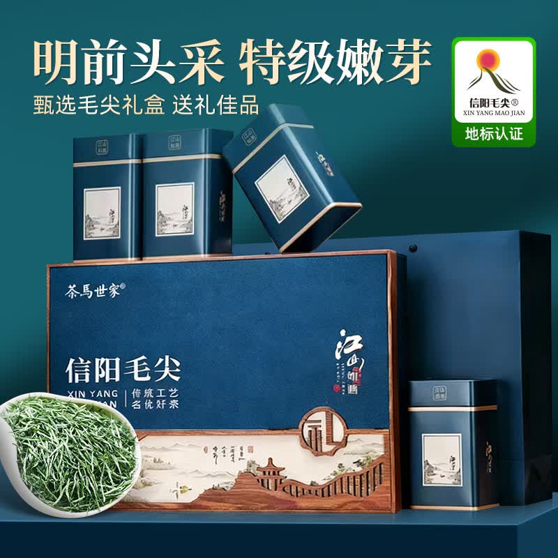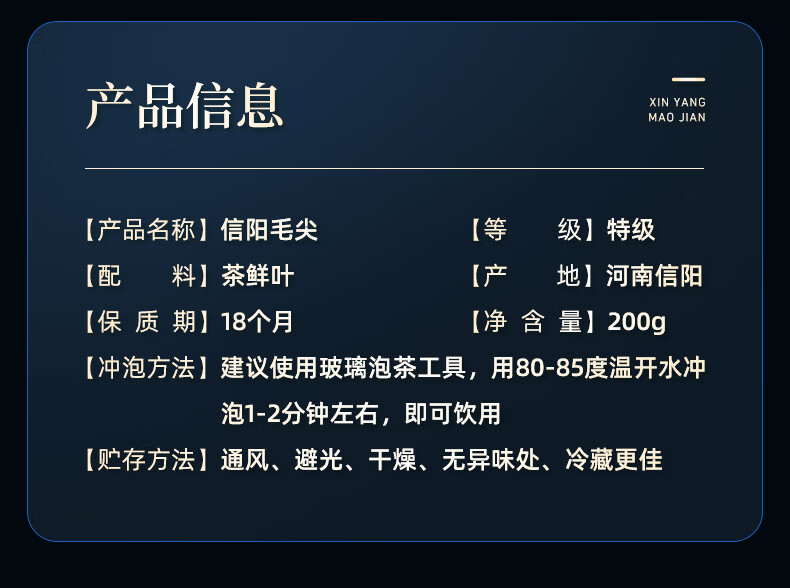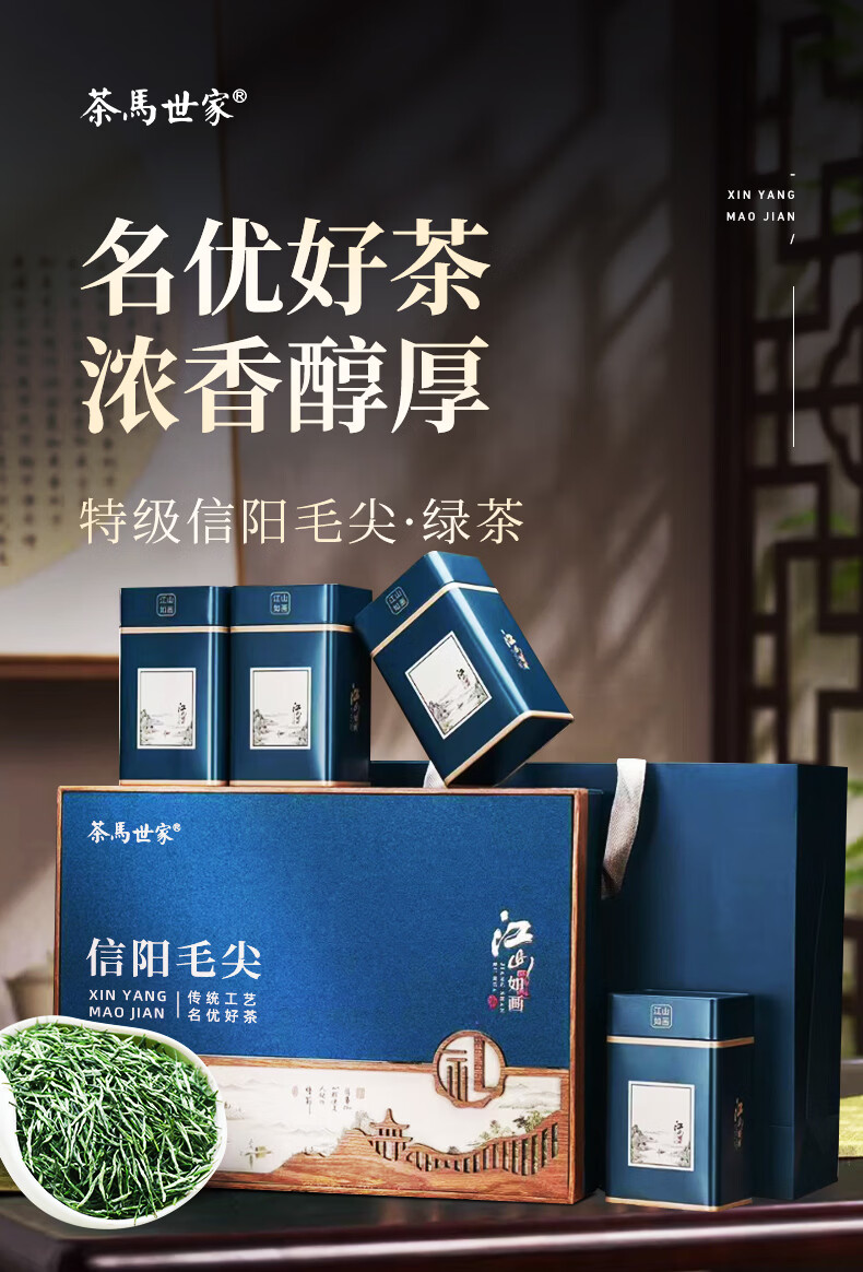 源自信阳毛尖核心产区,芽叶肥壮,叶面光润油亮;香气浓郁,滋味醇厚,回甘迅猛,口感丰富,耐泡性强;国风雅致经典四合一礼盒包装,待客,送礼都很合适