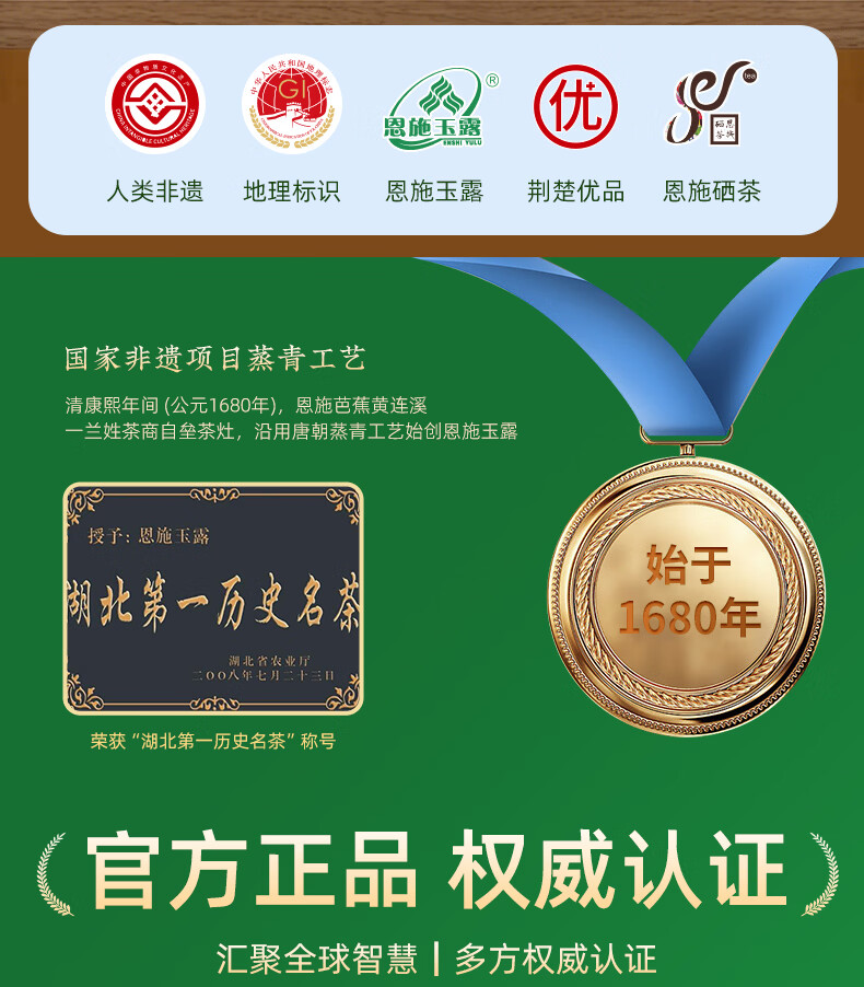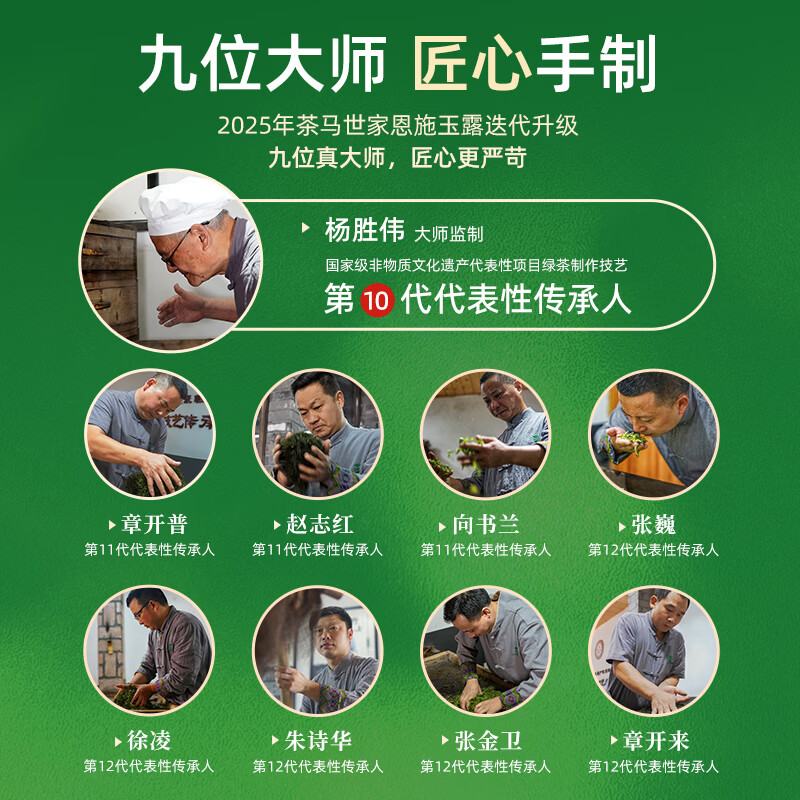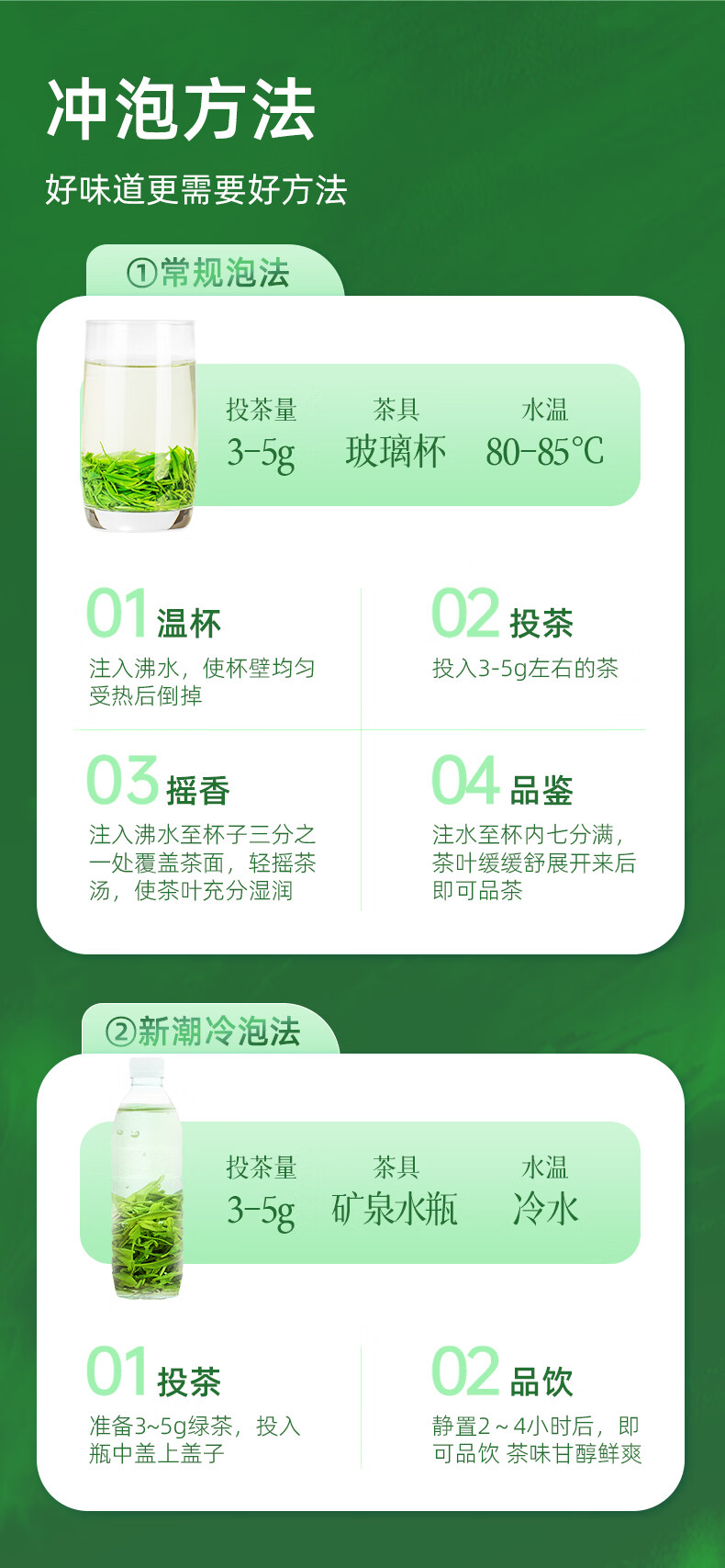 头春头采,特级精选,优中选优,非遗传承人亲制;采用非遗蒸青工艺,干茶翠绿、茶汤嫩绿、叶底鲜绿;墨绿金盖质感尽显高级,锁鲜便携,品味随心。鲜爽随行