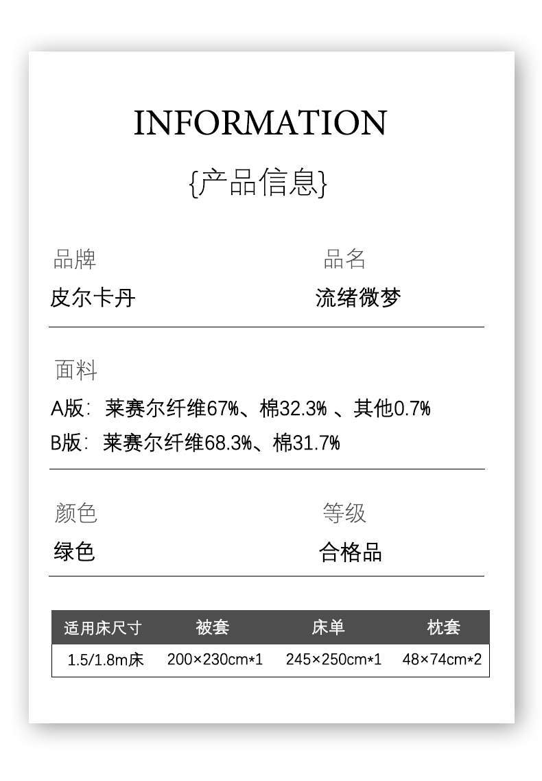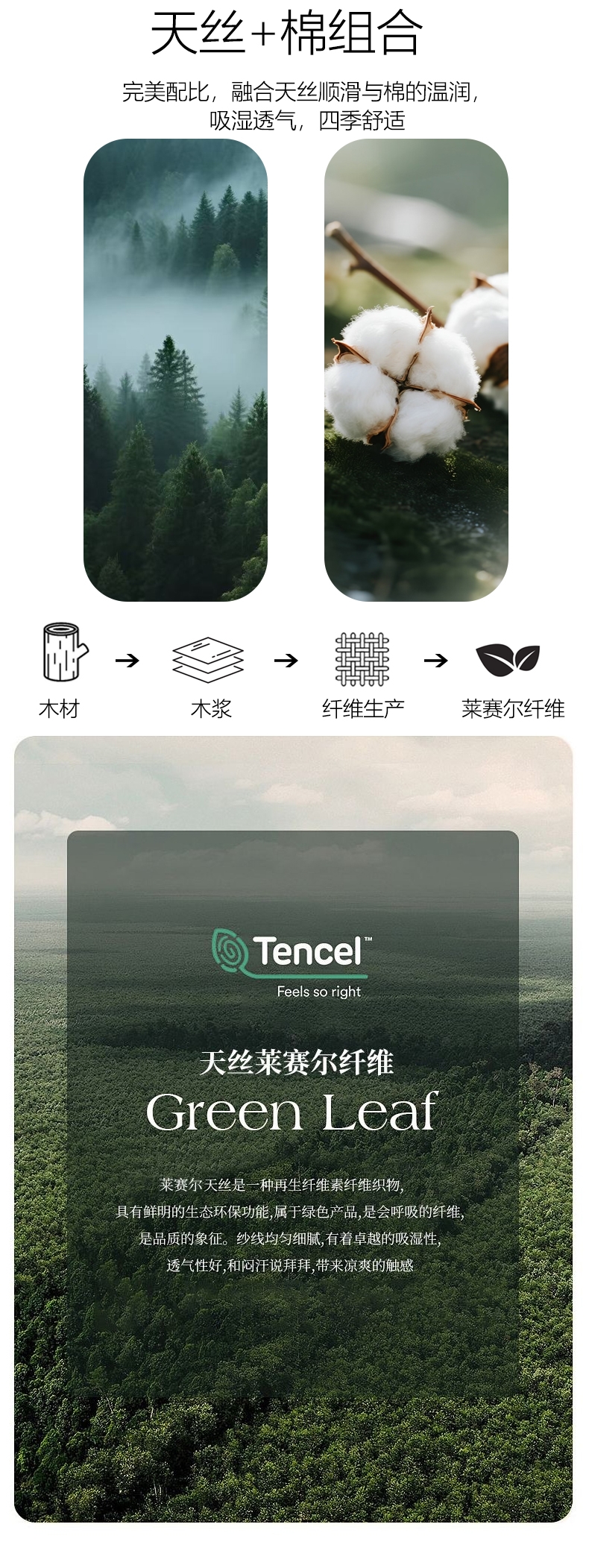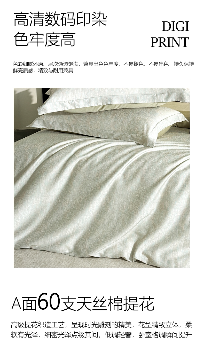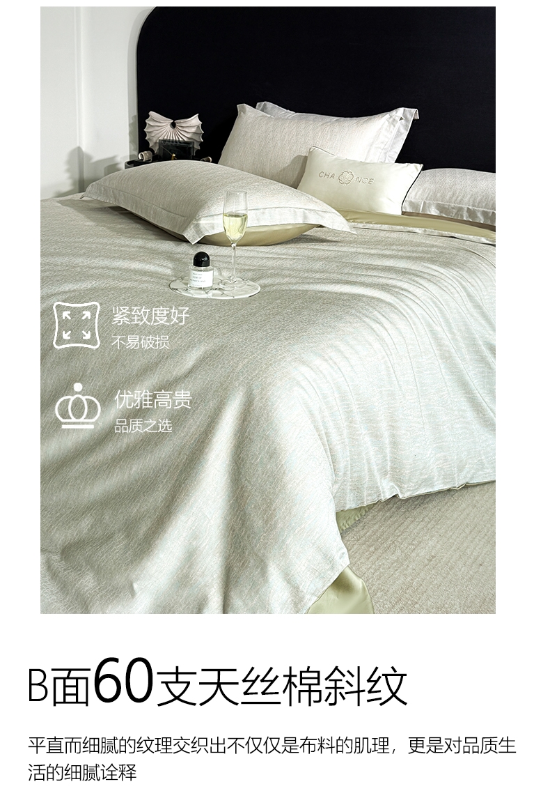 采用天丝棉面料;A版采用独特的天丝棉提花+亮丝镶嵌;更显高端大气