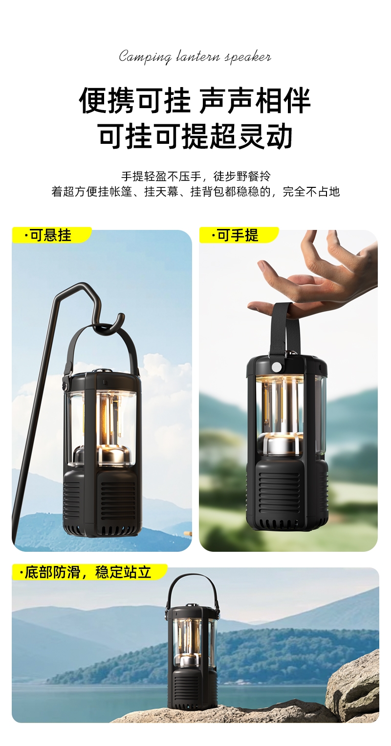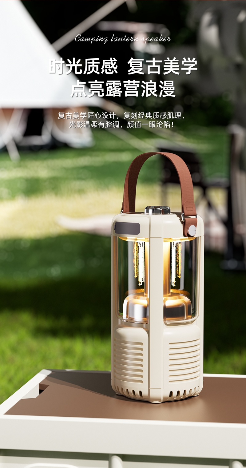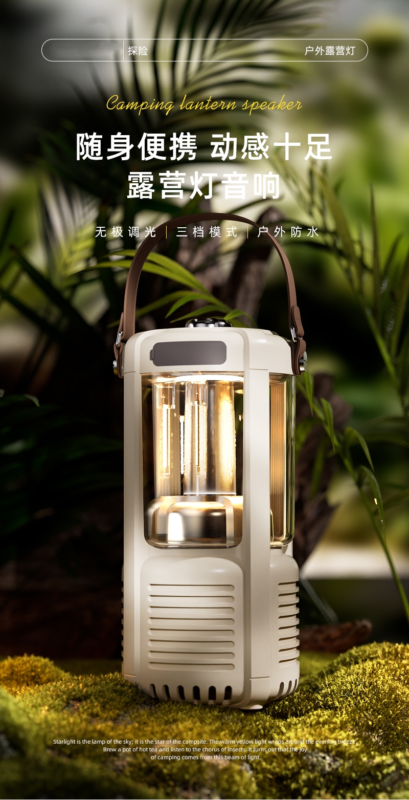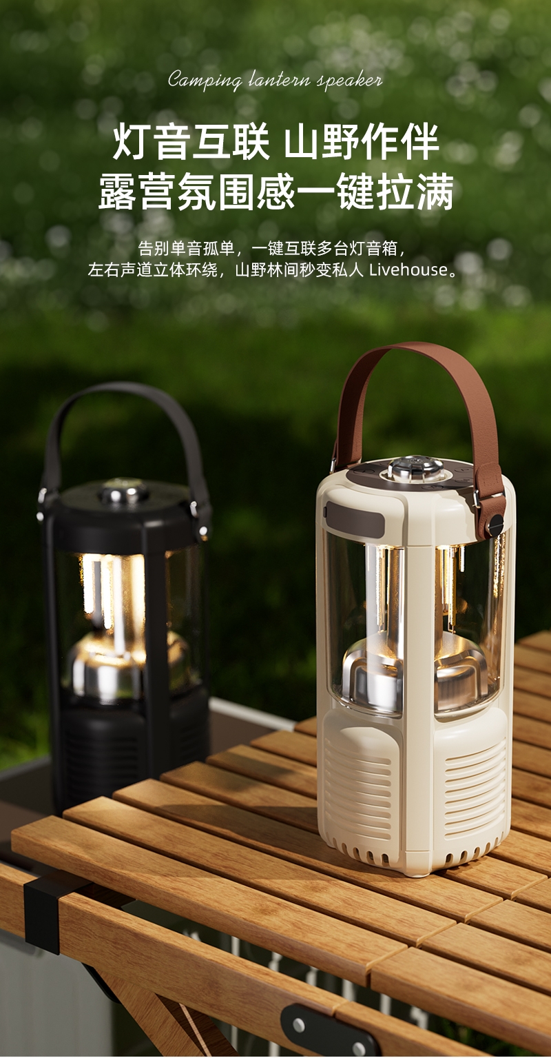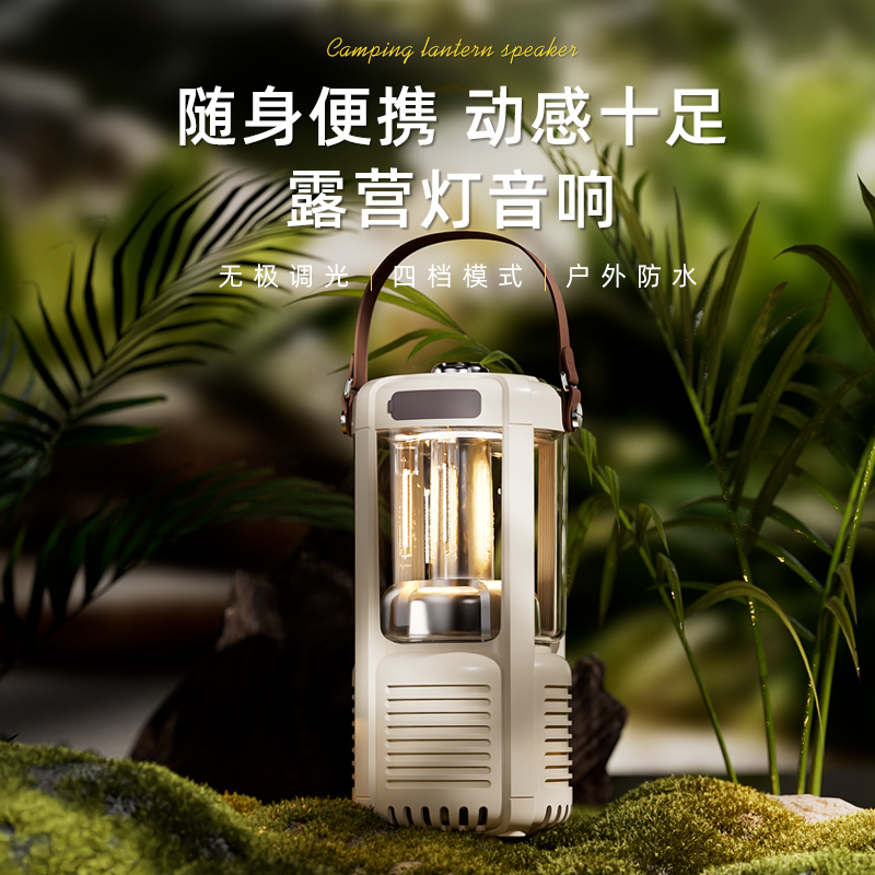 蓝牙音箱+露营氛围灯,满足户外/居家照明+音乐需求;手提/悬挂双设计能灵活放在帐篷/天幕下,适配多场景;具备亮度可调/长续航/IPX5级防水等级,符合户外