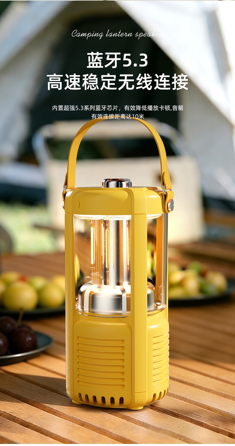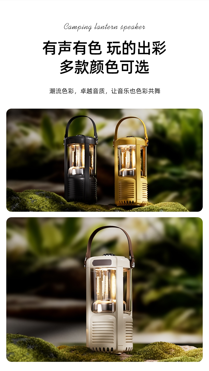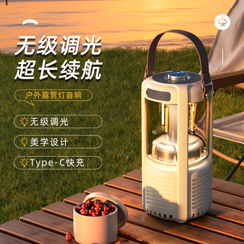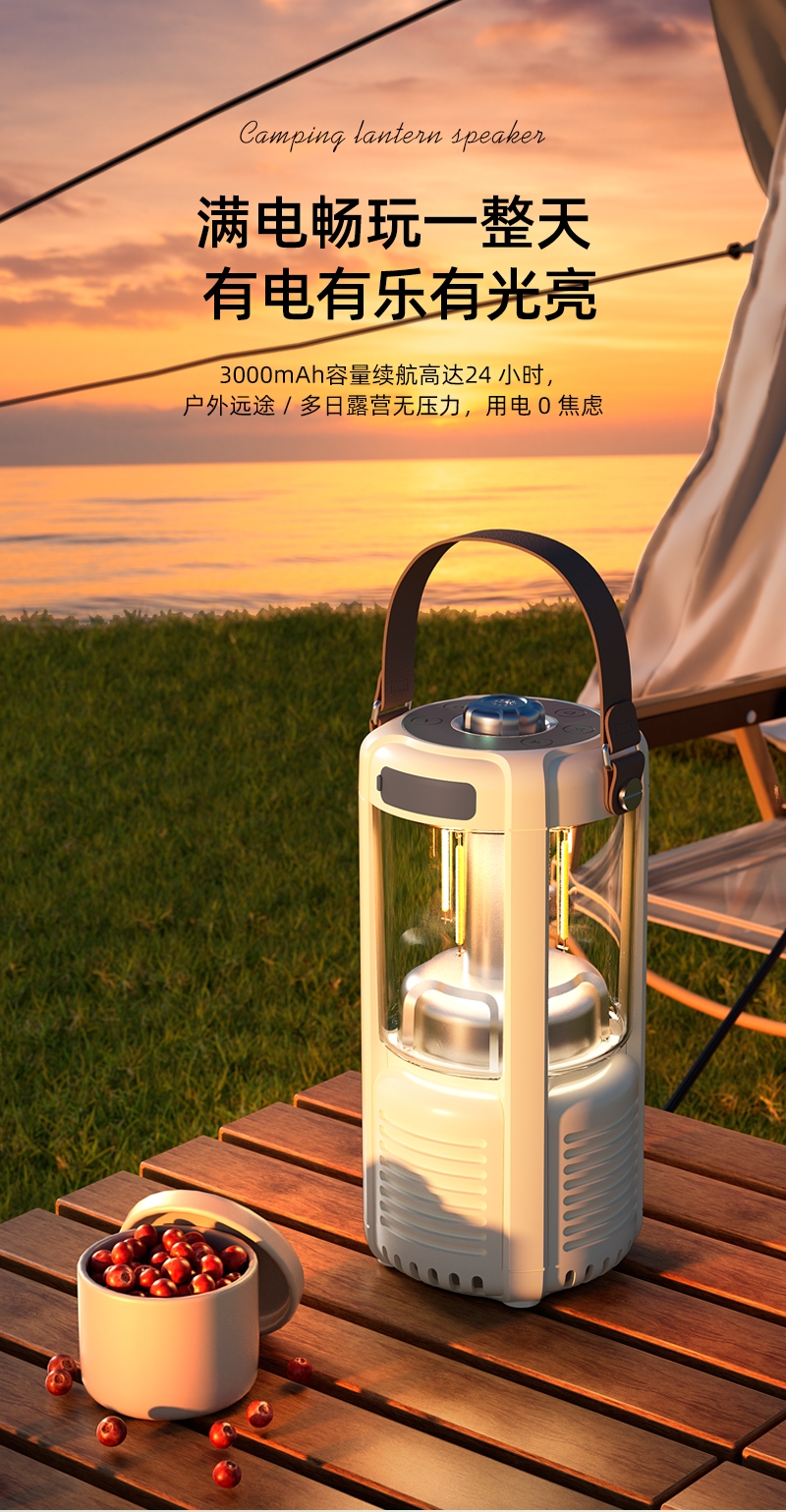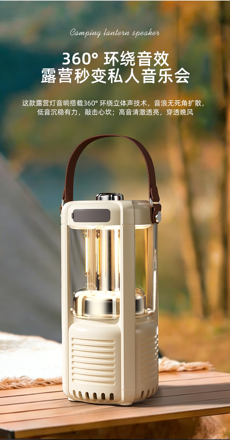 蓝牙音箱+露营氛围灯,满足户外/居家照明+音乐需求;手提/悬挂双设计能灵活放在帐篷/天幕下,适配多场景;具备亮度可调/长续航/IPX5级防水等级,符合户外
