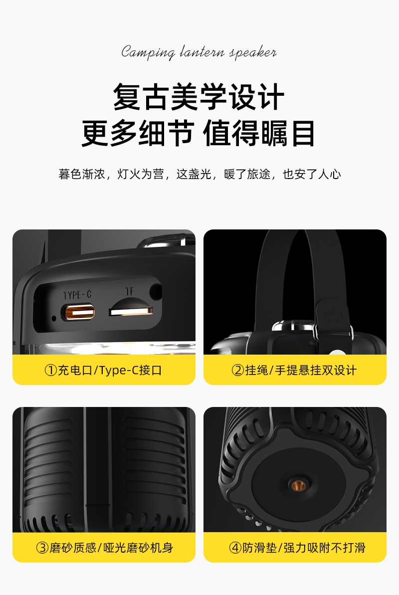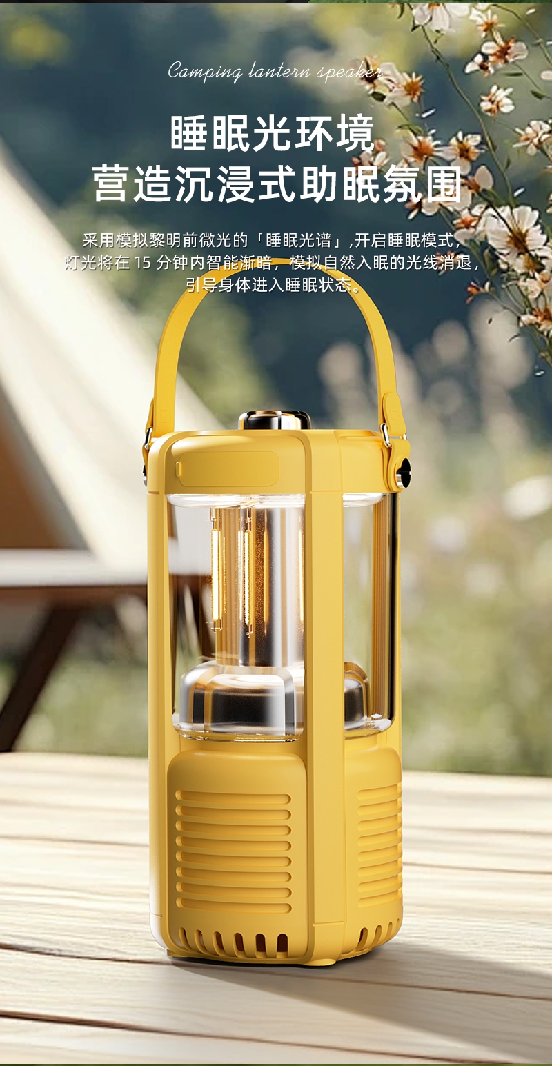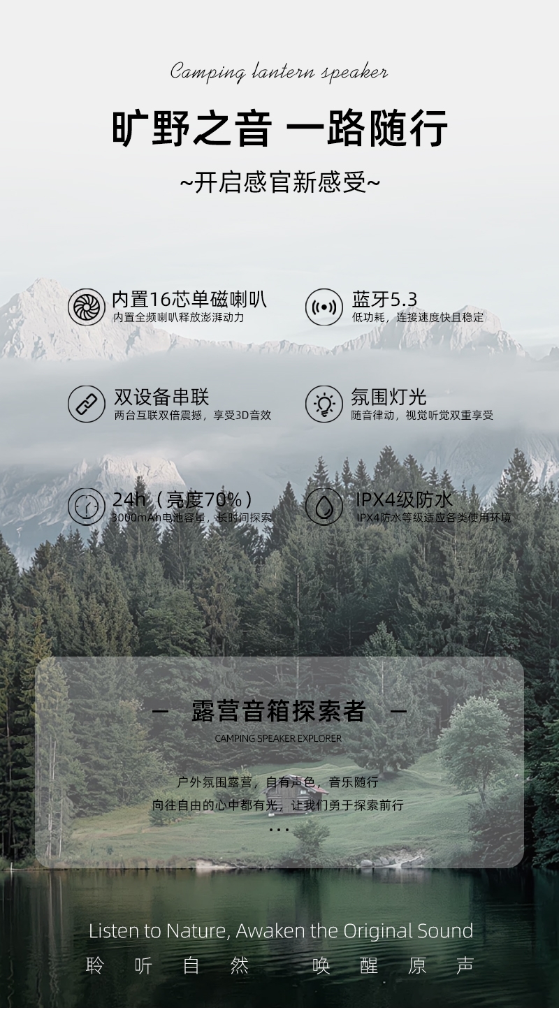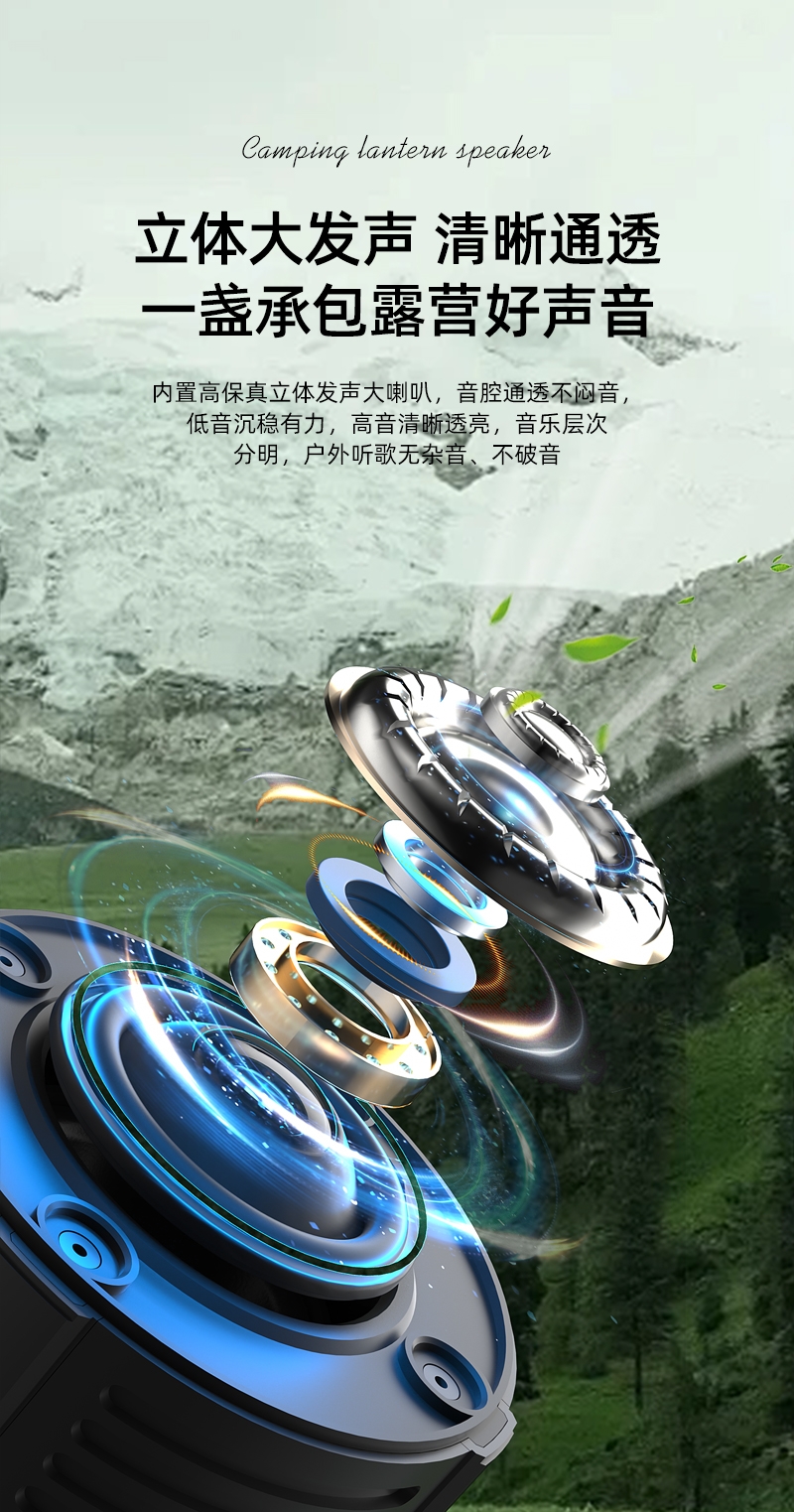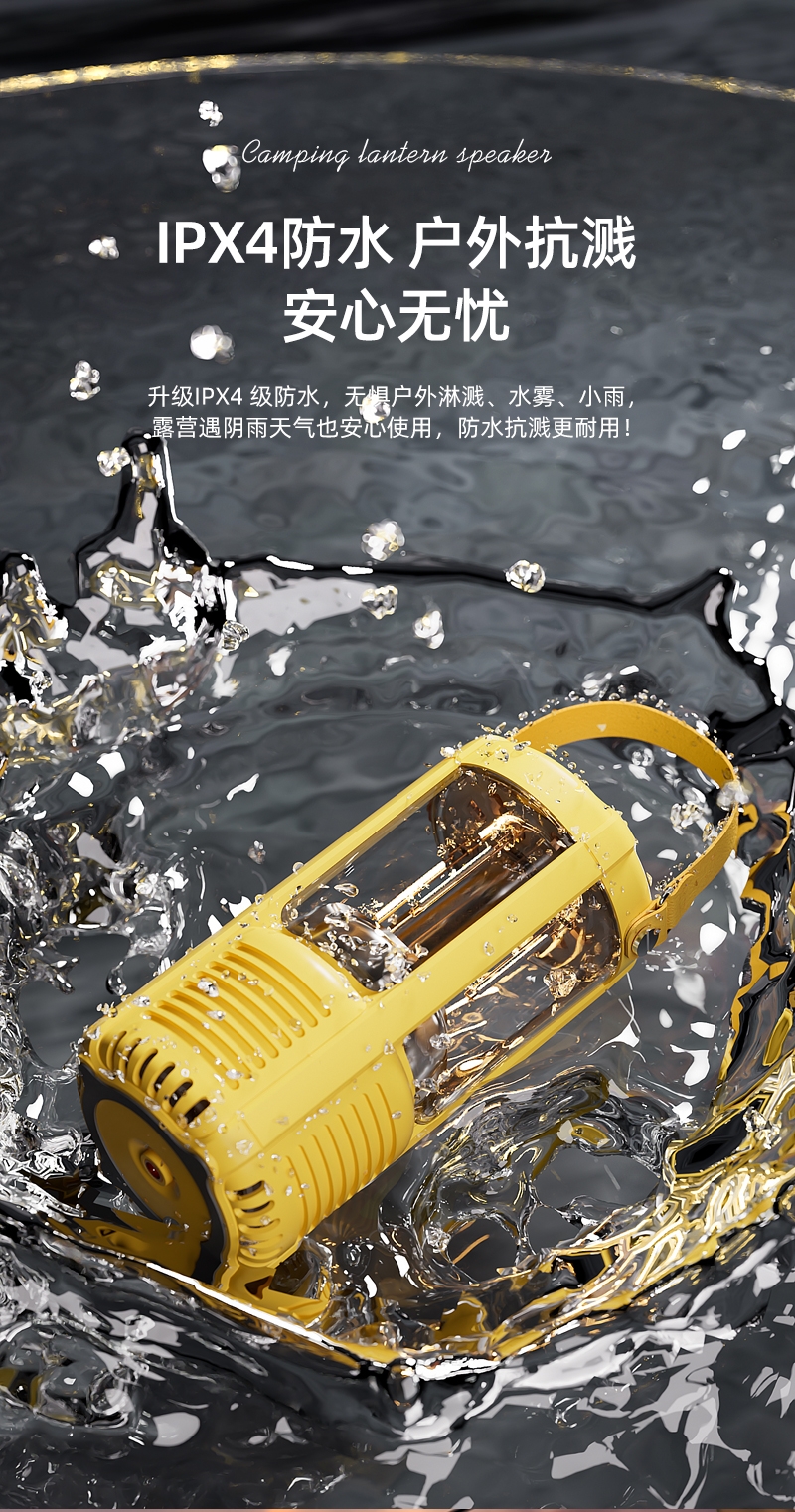 蓝牙音箱+露营氛围灯,满足户外/居家照明+音乐需求;手提/悬挂双设计能灵活放在帐篷/天幕下,适配多场景;具备亮度可调/长续航/IPX5级防水等级,符合户外