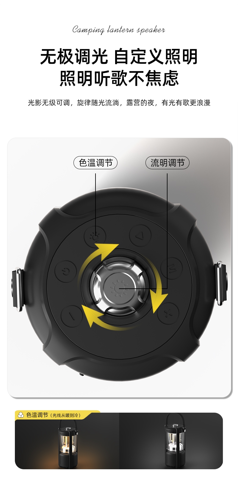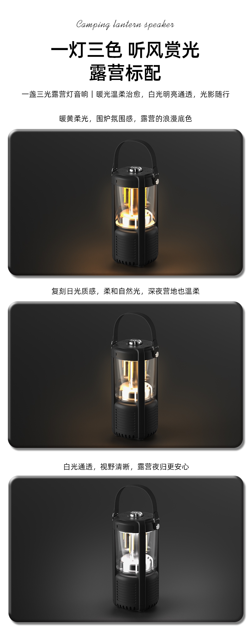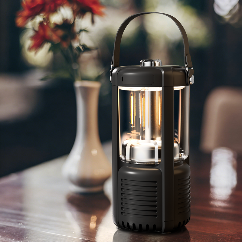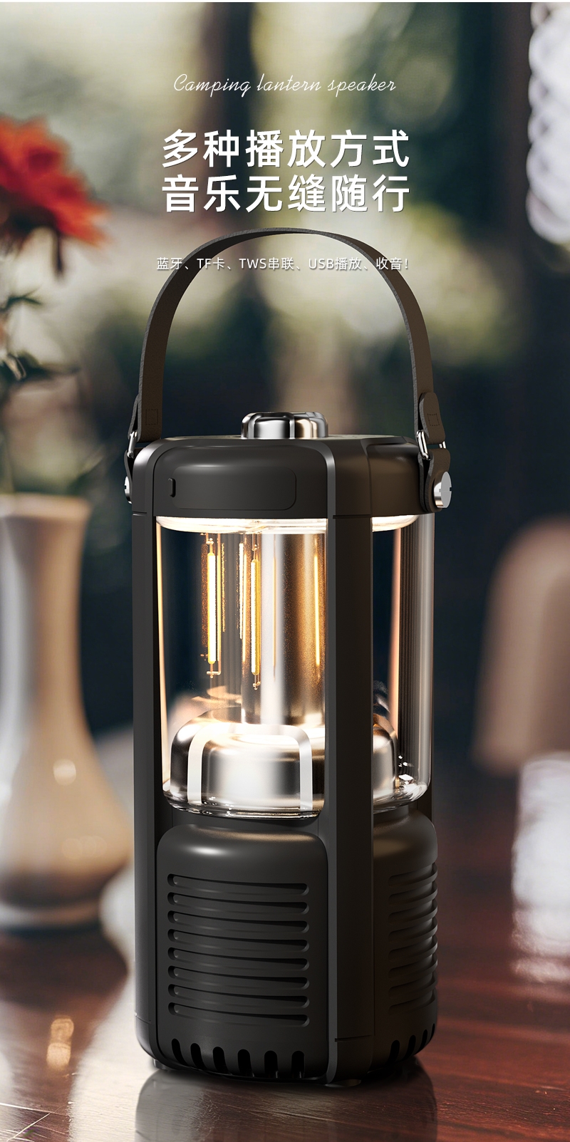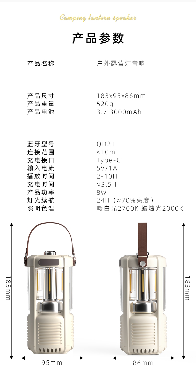 蓝牙音箱+露营氛围灯,满足户外/居家照明+音乐需求;手提/悬挂双设计能灵活放在帐篷/天幕下,适配多场景;具备亮度可调/长续航/IPX5级防水等级,符合户外