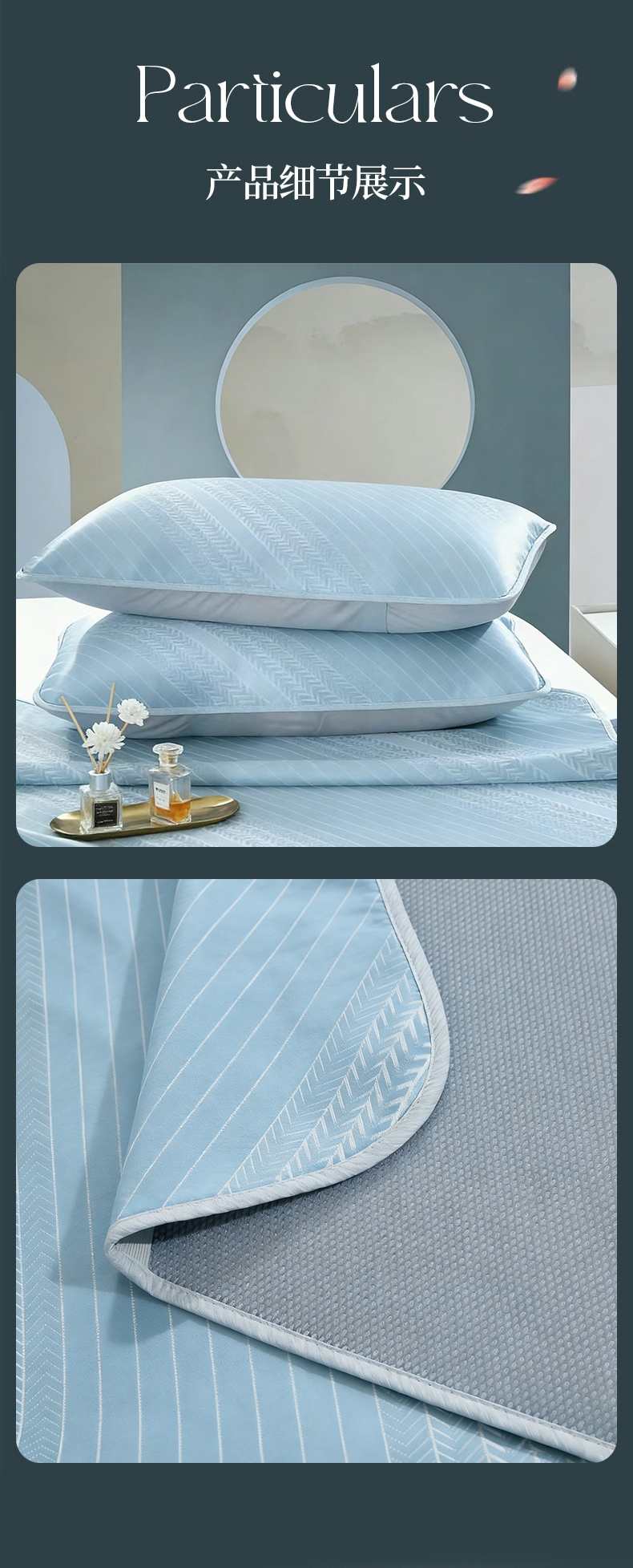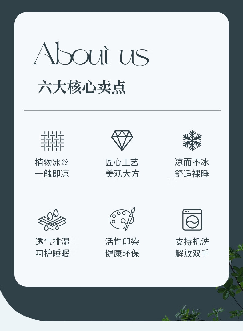 萃取植物冰丝,自然清凉,凉而不冰;凉感冰丝纤维织物本身经过抗菌处理,;,有效起到抗菌效果,洁净卫生,适合裸睡。
