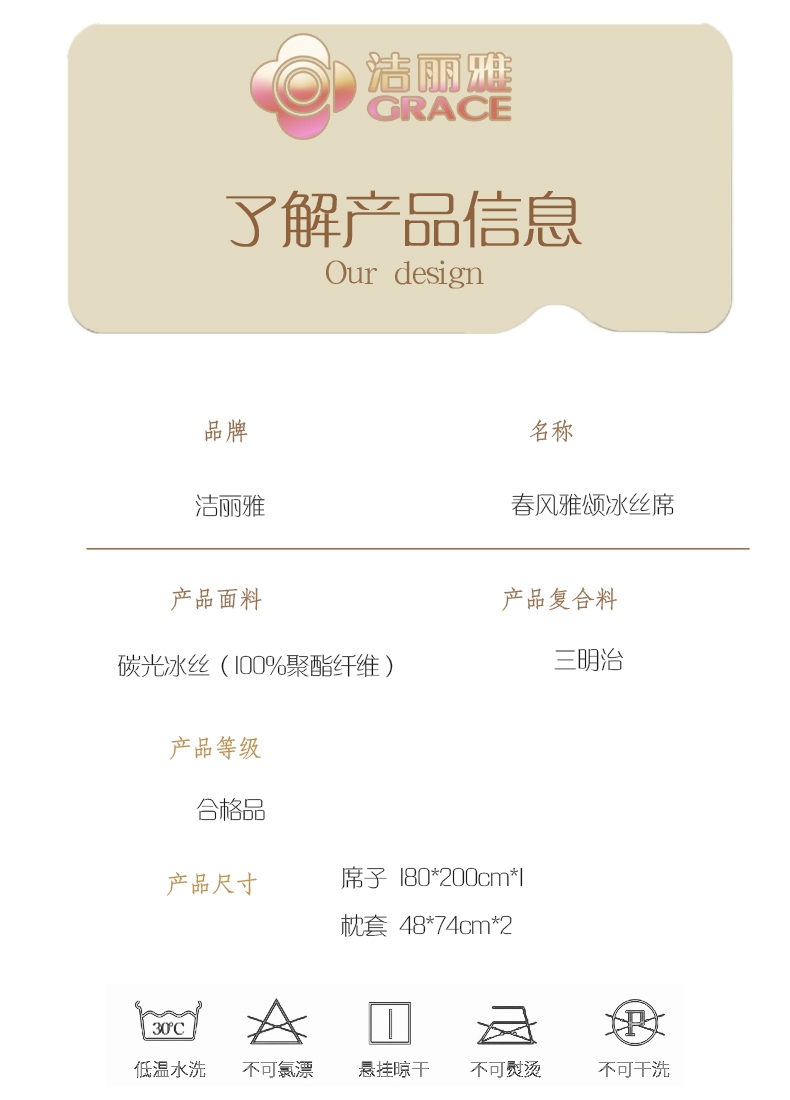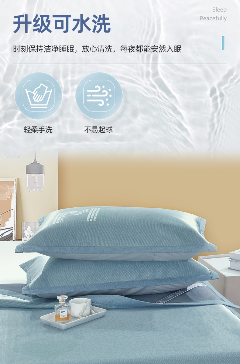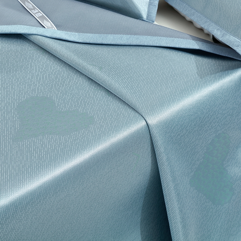 高密碳光冰丝席,自然清凉,凉而不冰;碳光凉感冰丝纤维织物本身经过抗菌处理,可以破坏细菌;有效起到抗菌效果,洁净卫生,适合裸睡。
