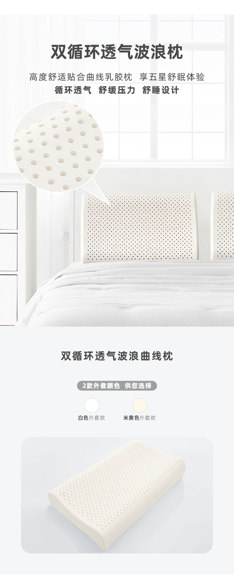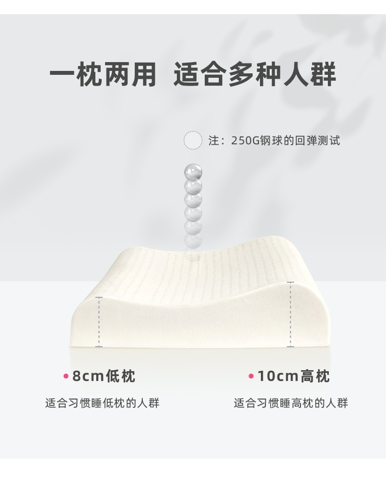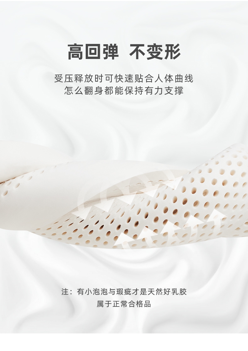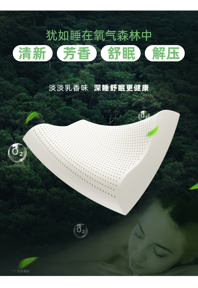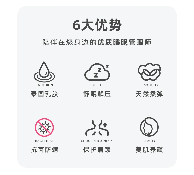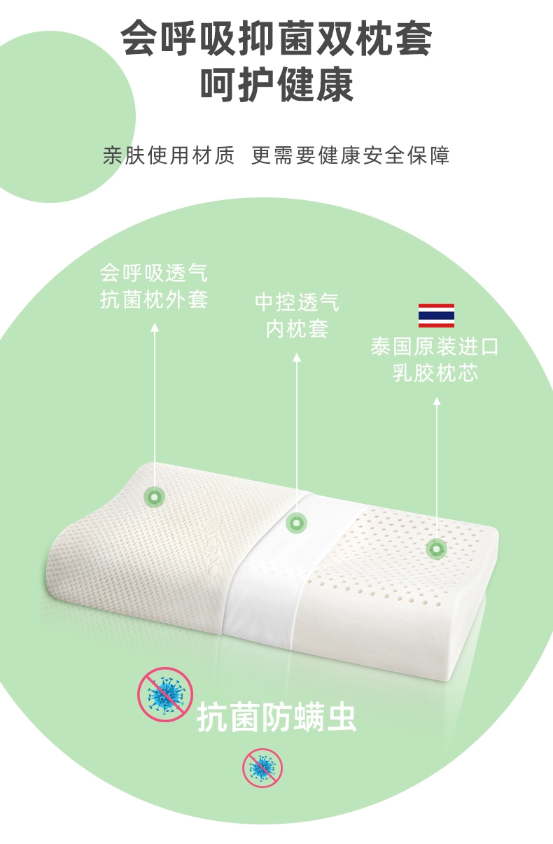 乳胶是一种天然抗菌材质;有天然乳香气息,含量高达90%以上乳胶成分;较其他枕芯更为舒适,快速散发人体睡眠中余热和湿气。