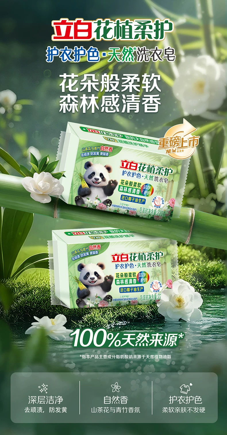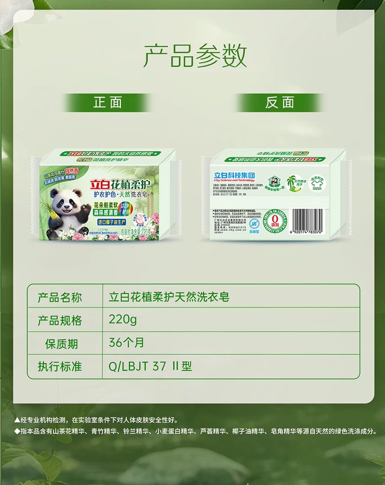产品成分:脂肪酸钠、表面活性剂、水软化剂、高级香精、着色剂、山茶花精华、青竹精华、铃兰精华、椰子油精华、芦荟精华、小麦蛋白精华、皂角精华