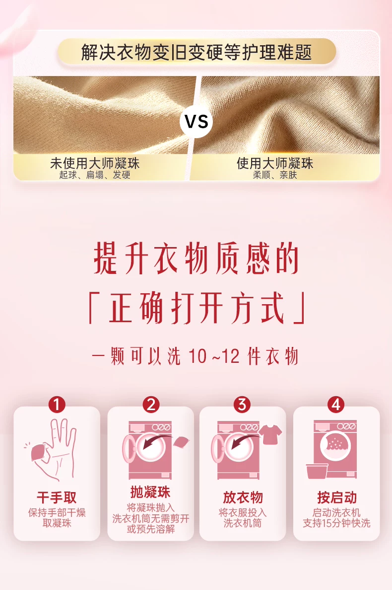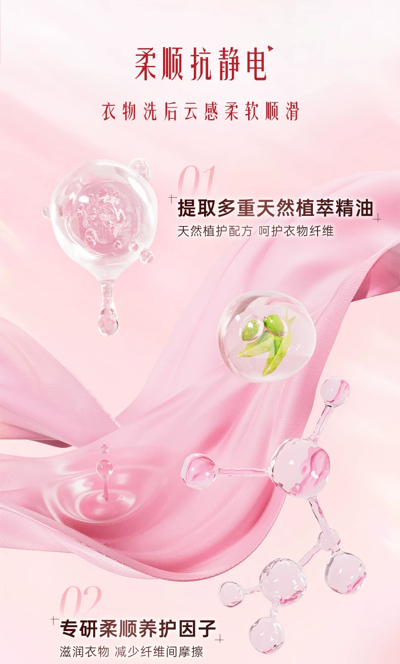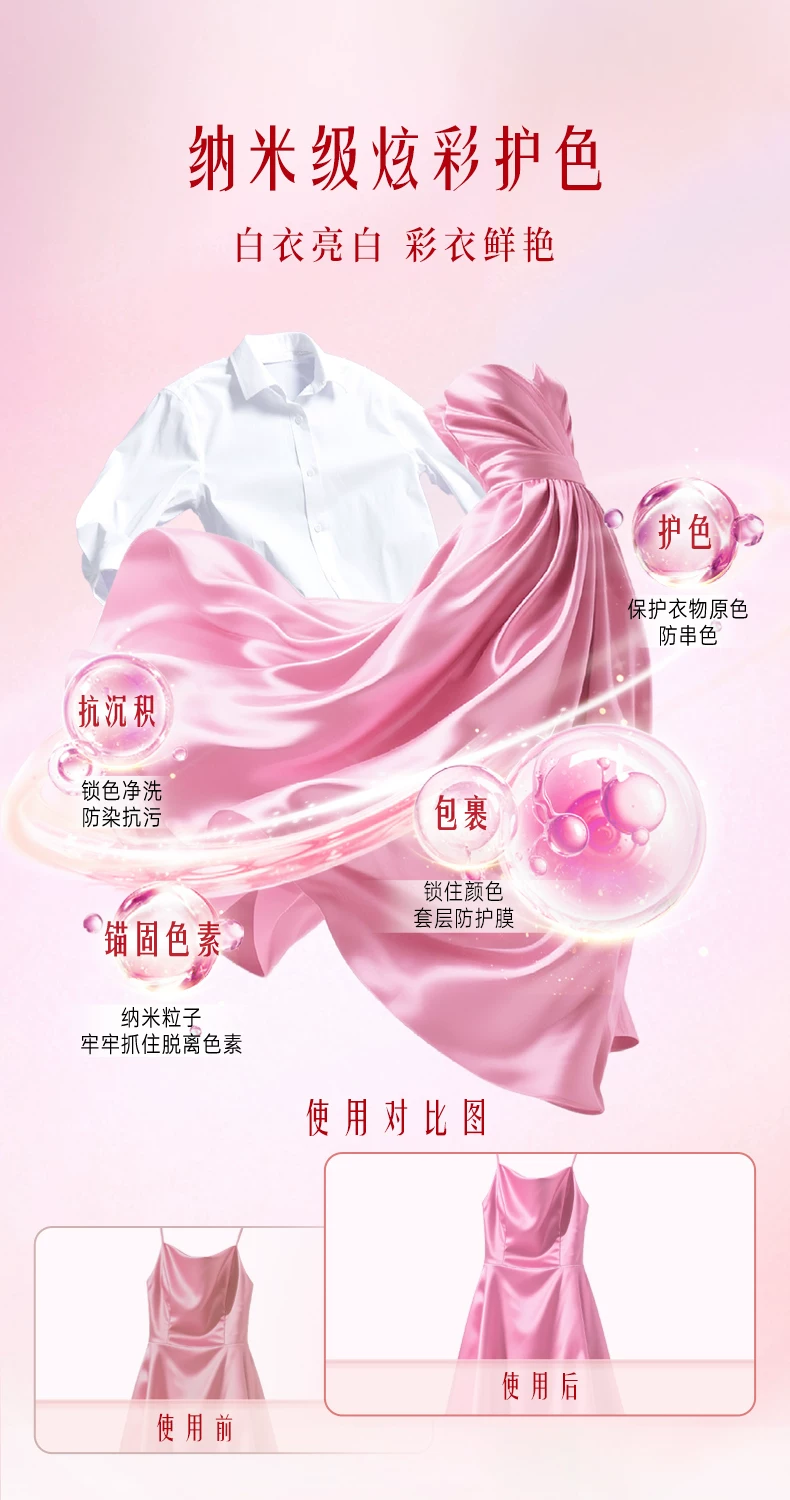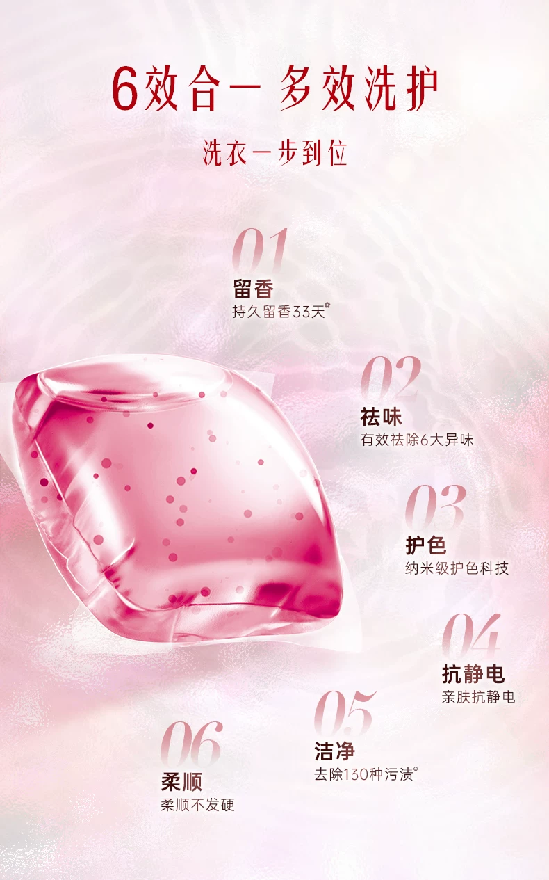 6效合1:33天留香、12倍浓缩更洁净;6大异味祛除、纳米级护色科技;亲肤抗静电、柔顺不发硬;15分钟快洗无残留