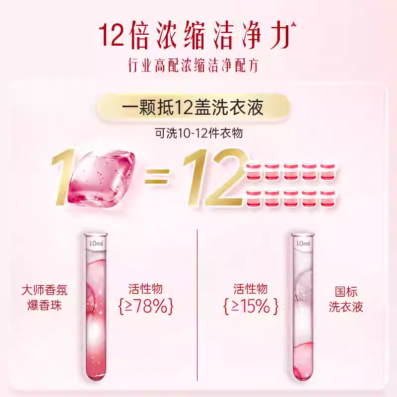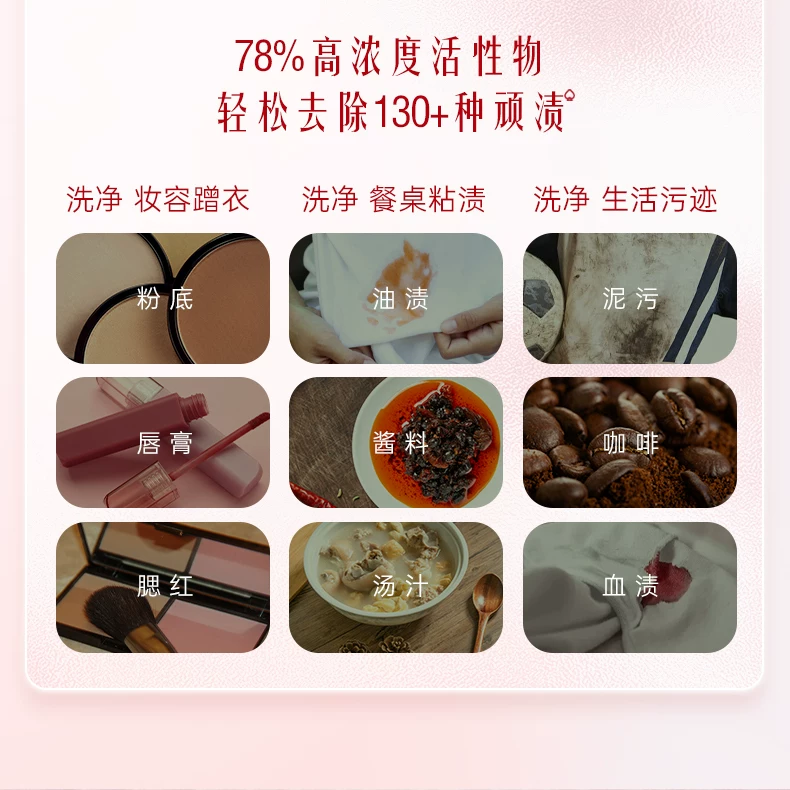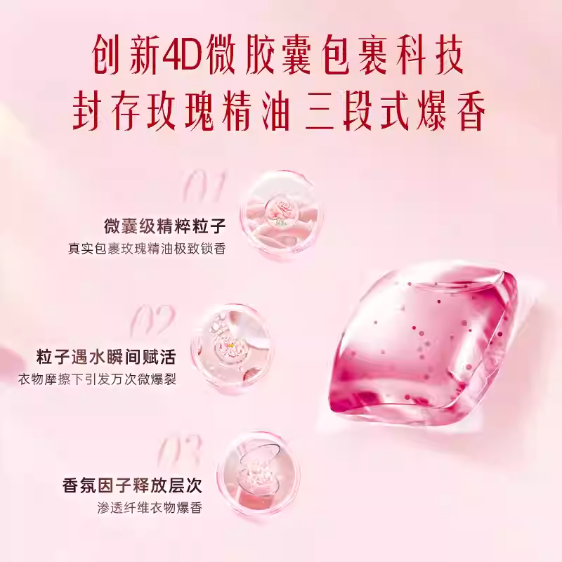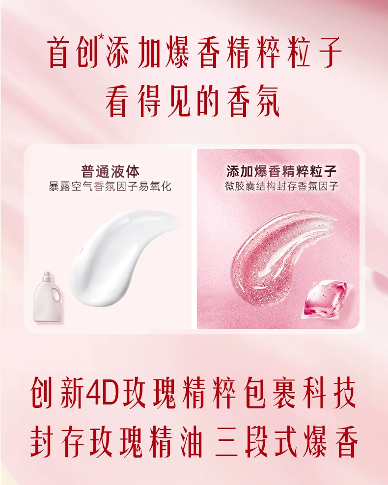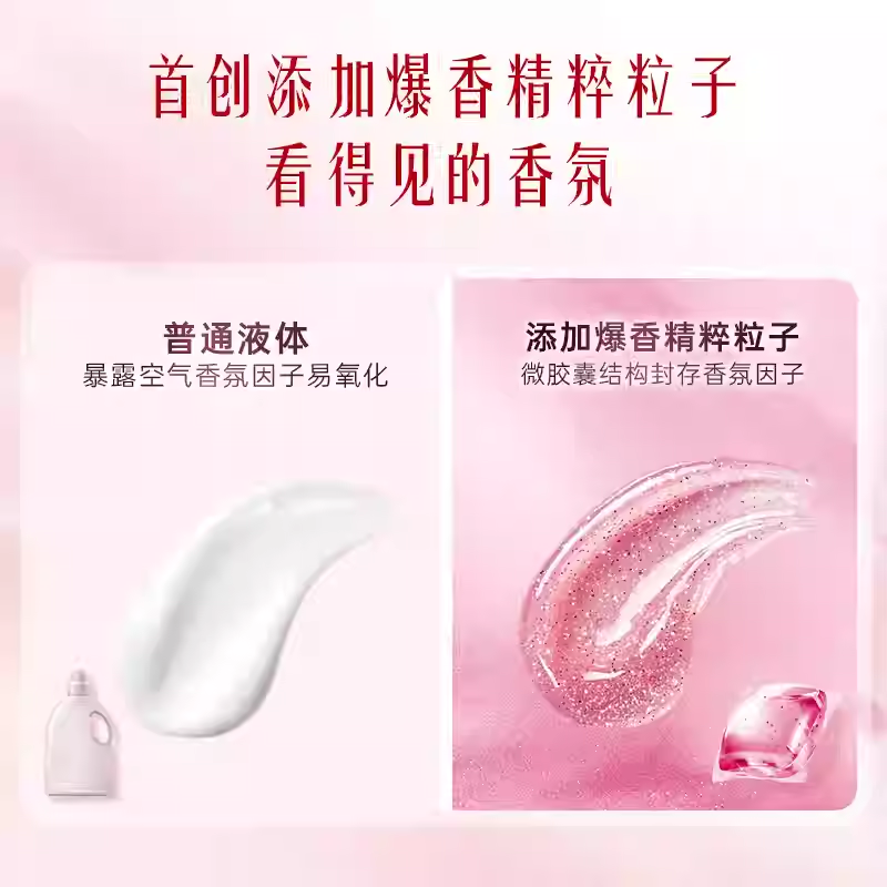 产品成分:表面活性剂(含椰子油精华、橄榄油精华)、助剂(含稳定剂、污垢分散剂)、酶制剂(天然酵素)、香精、着色剂、爆香精粹粒子、柔顺因子