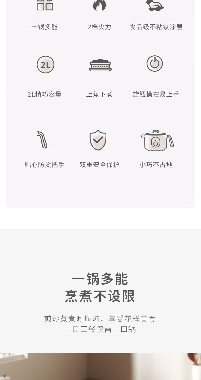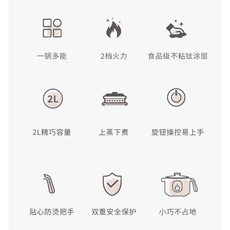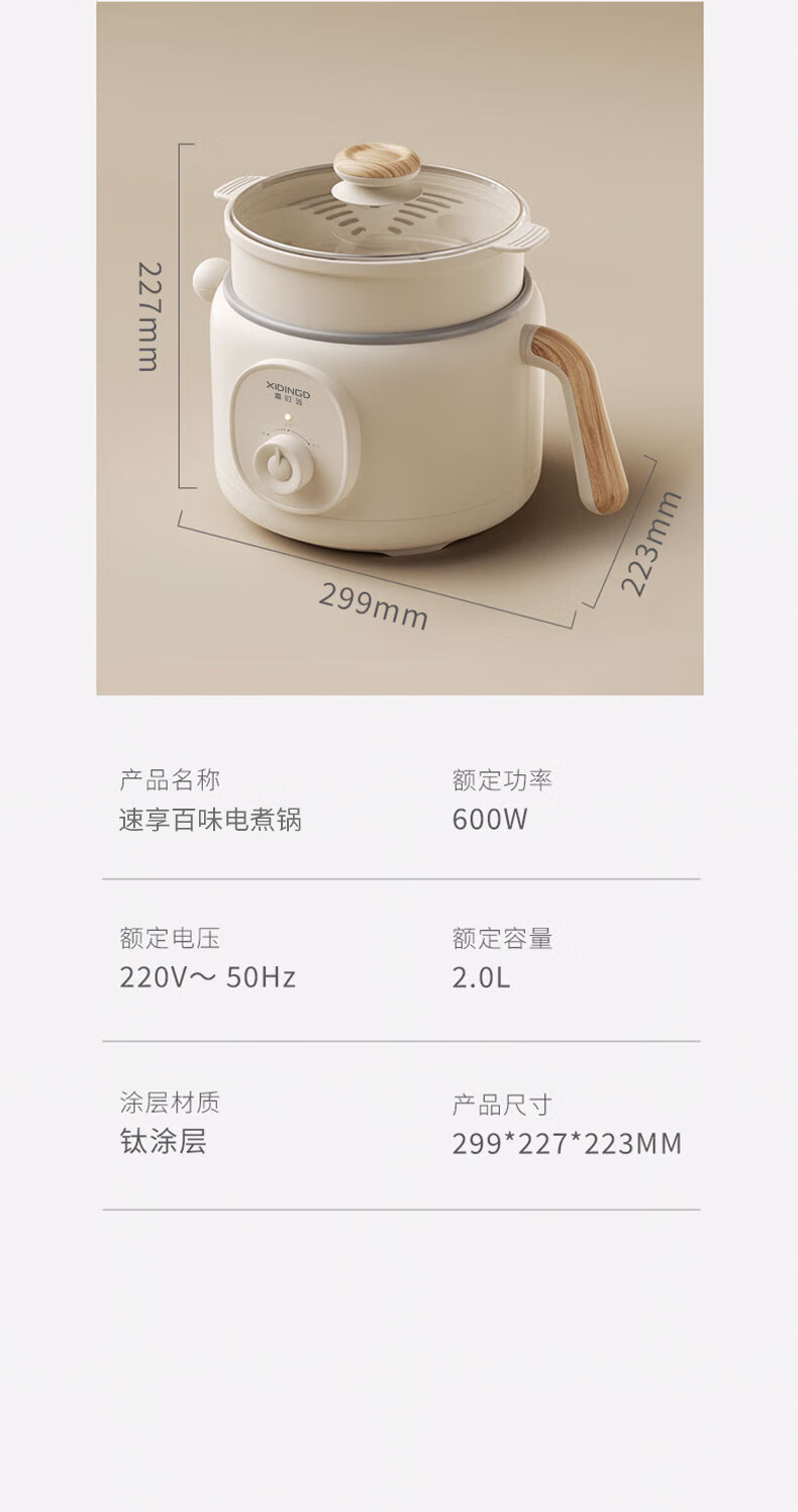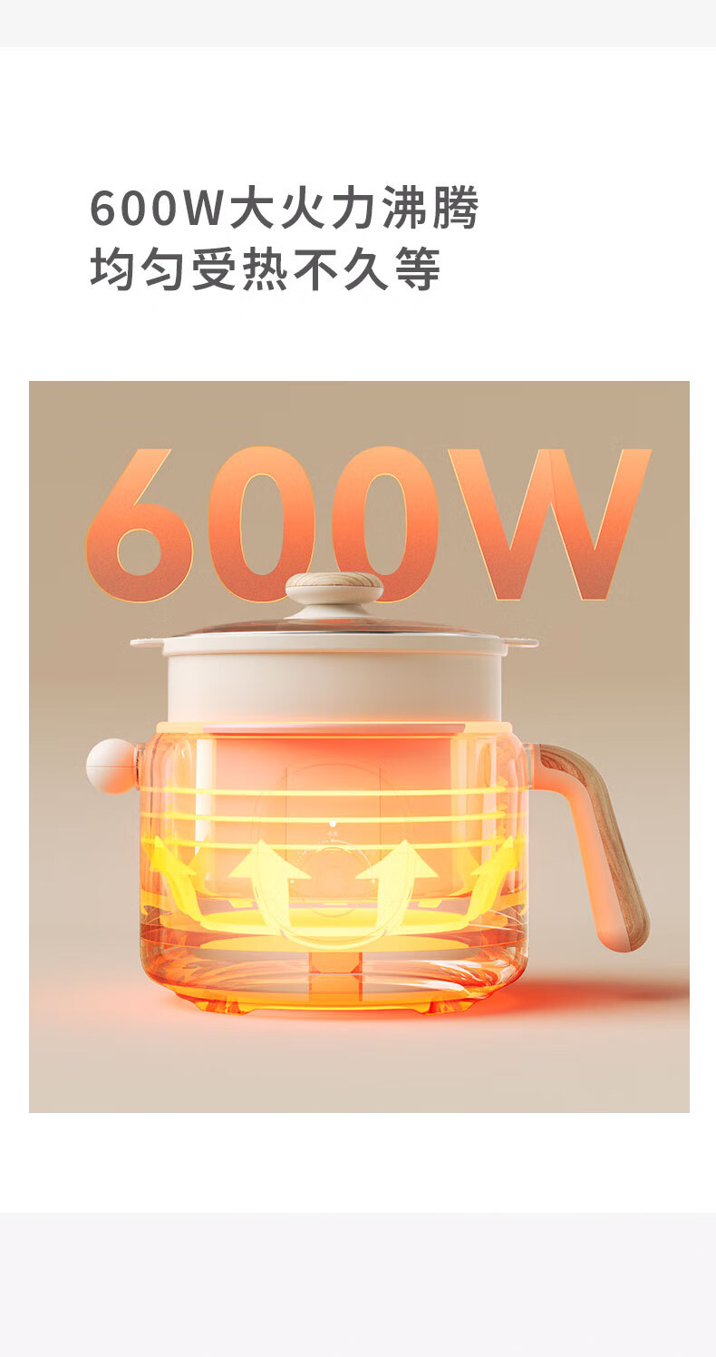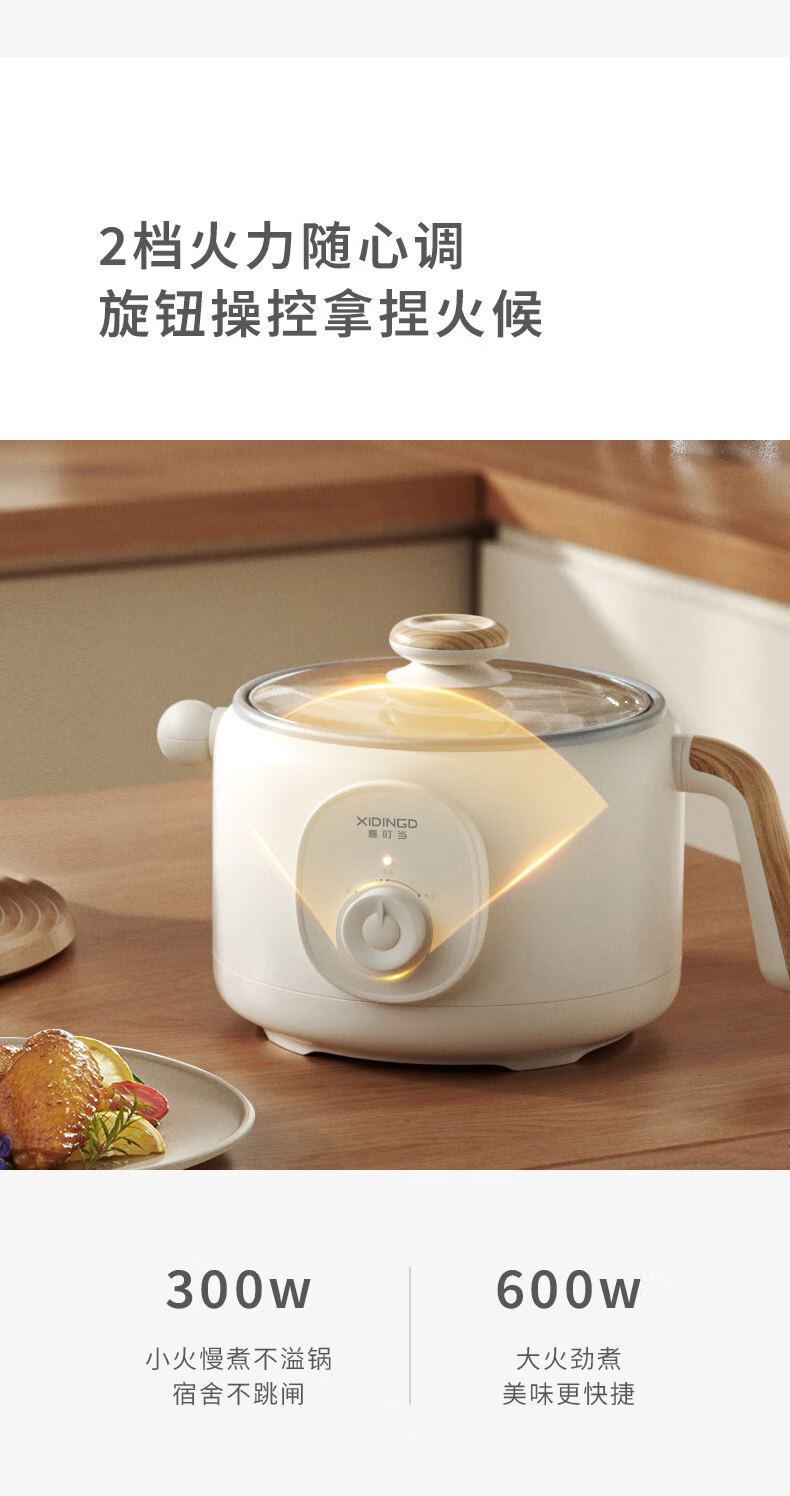 煎炒蒸煮涮焖炖,享受花样美食;2档火力随心调,旋钮操控拿捏火候;600W大火力,沸腾均匀受热不久等