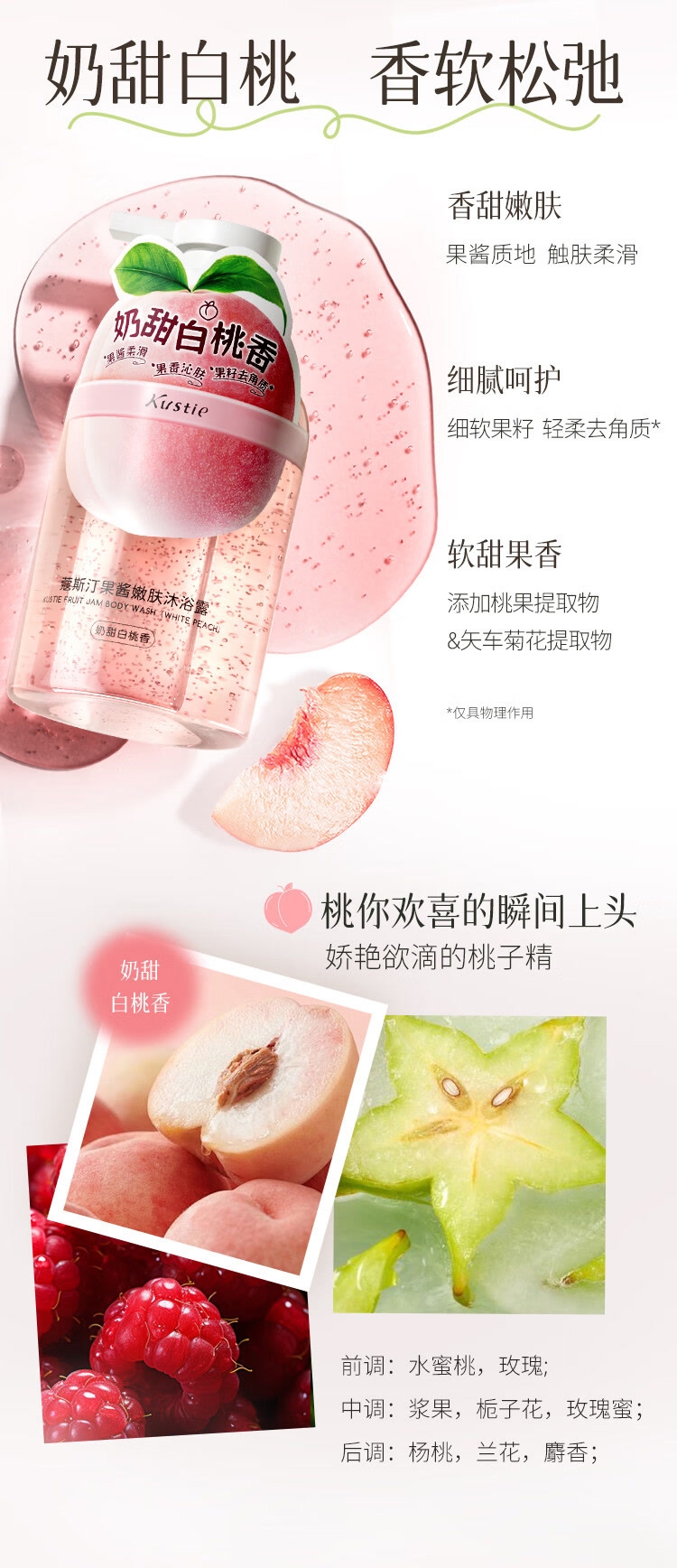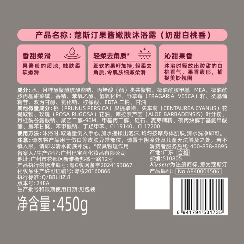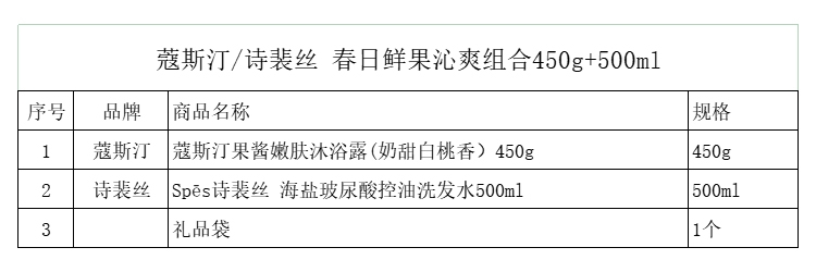 配置清单:蔻斯汀果酱嫩肤沐浴露(奶甜白桃香)450g Spēs诗裴丝 海盐玻尿酸控油洗发水500ml 礼品袋