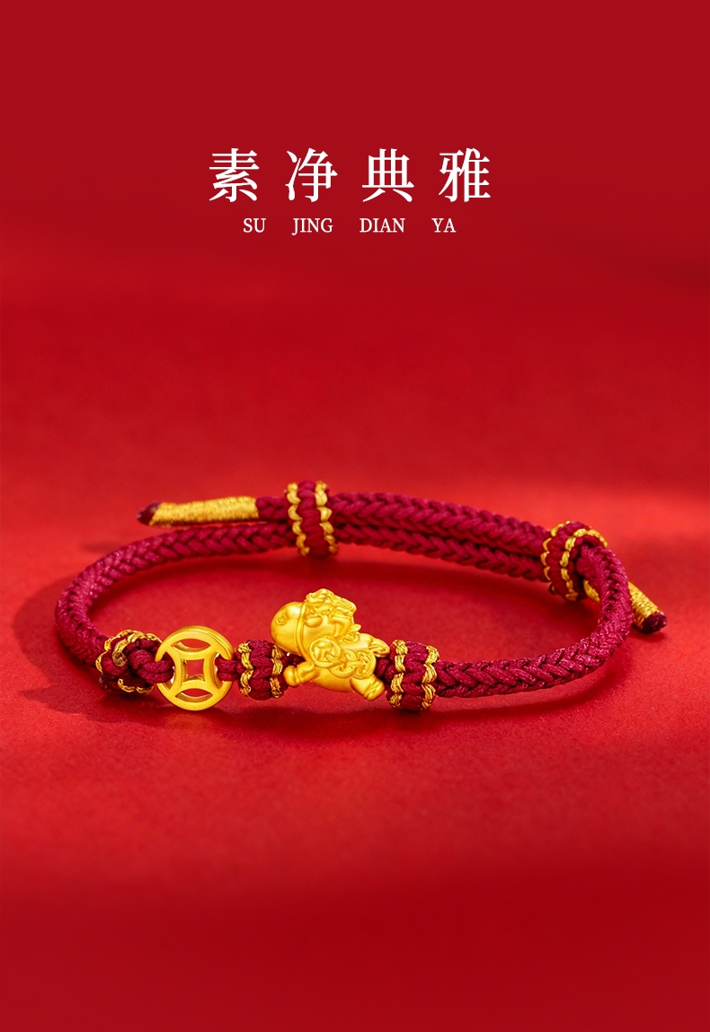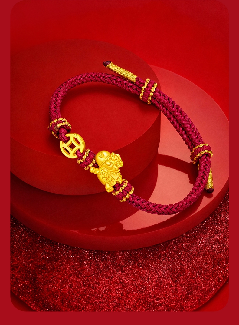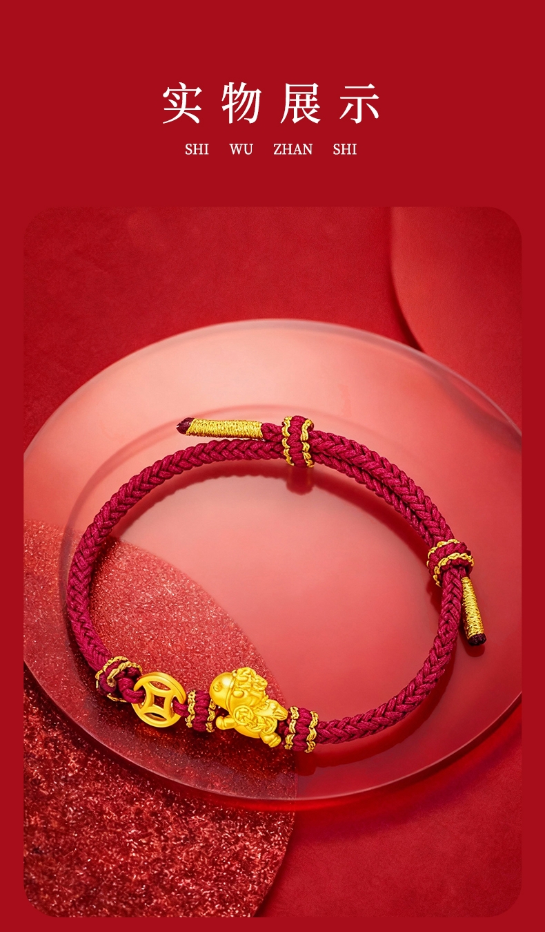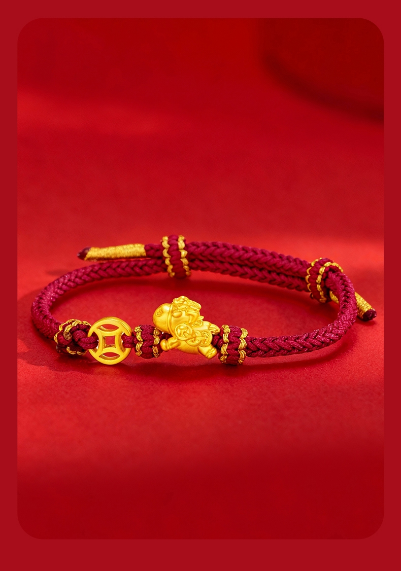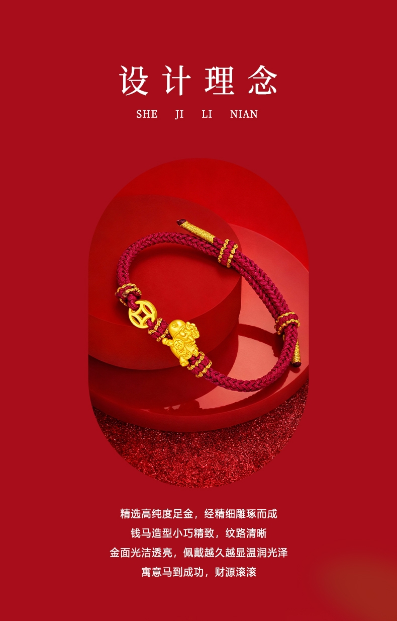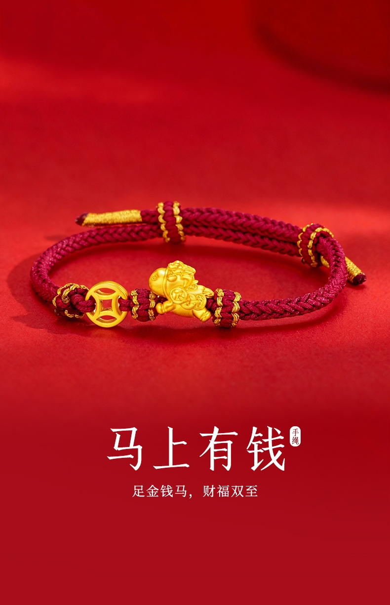 寓意马到成功,财源滚滚,经典百搭;钱马造型小巧精致,用足金经精细雕琢而成;编绳工艺,素净典雅,佩戴舒适无勒痕,适合日常佩戴