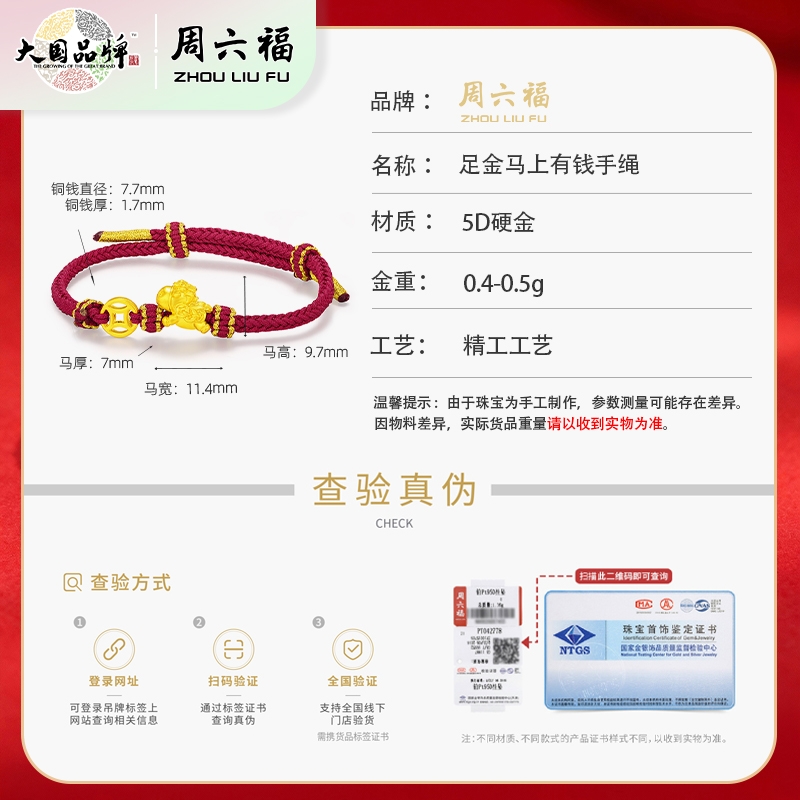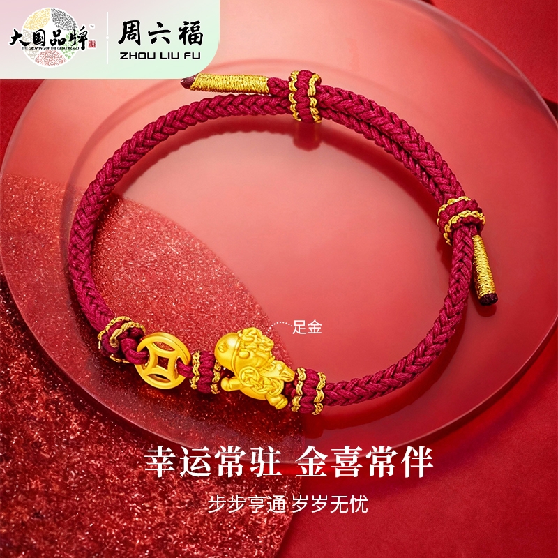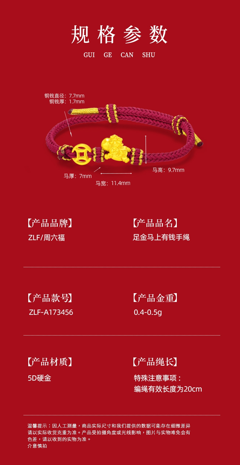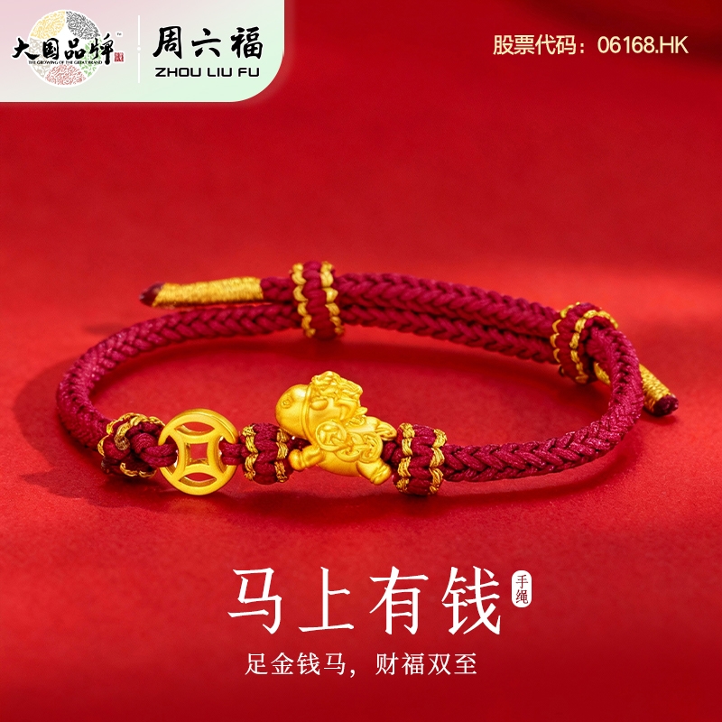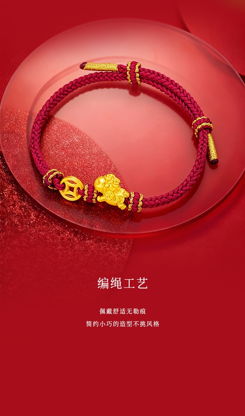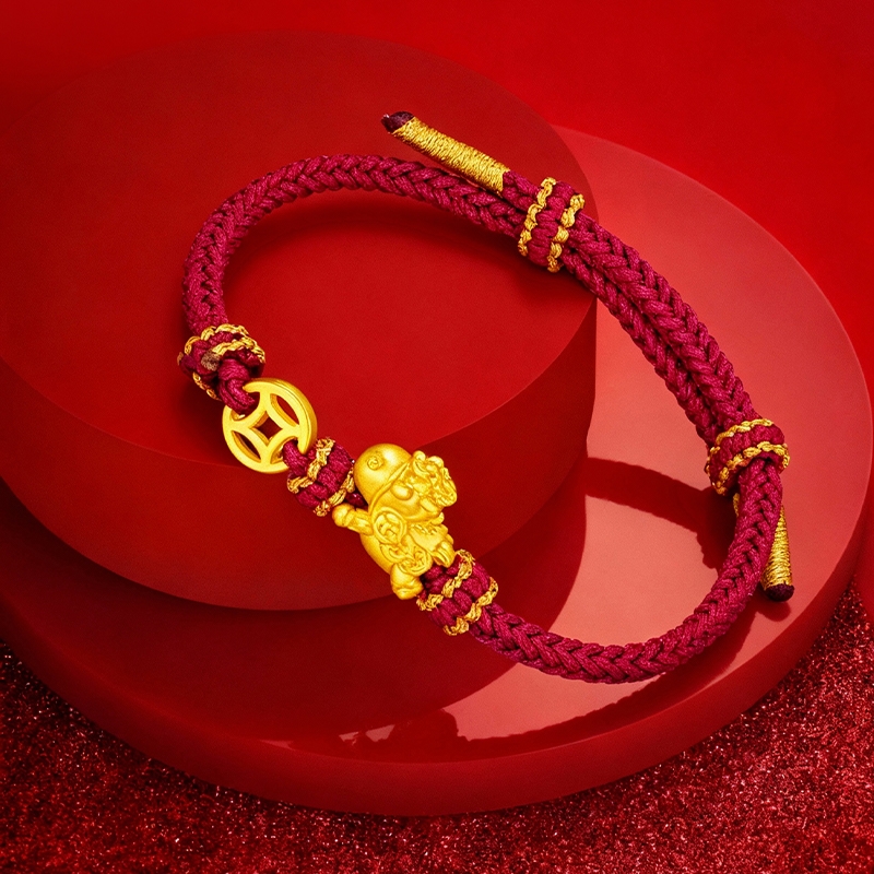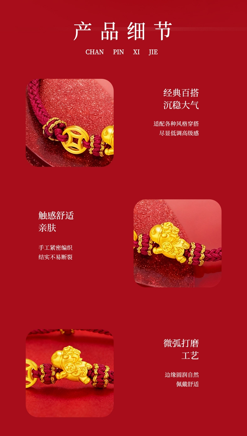 寓意马到成功,财源滚滚,经典百搭;钱马造型小巧精致,用足金经精细雕琢而成;编绳工艺,素净典雅,佩戴舒适无勒痕,适合日常佩戴