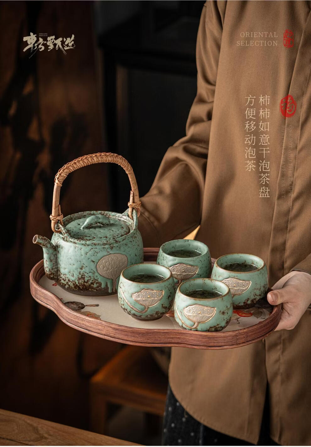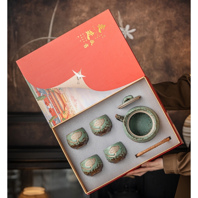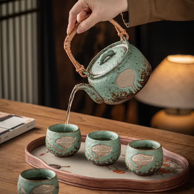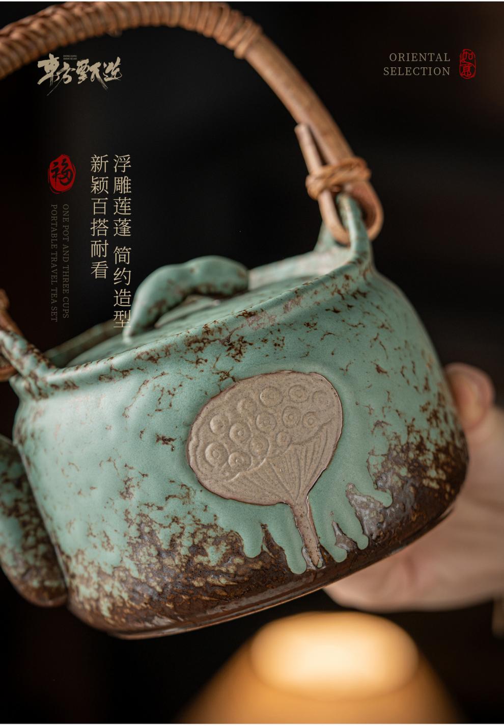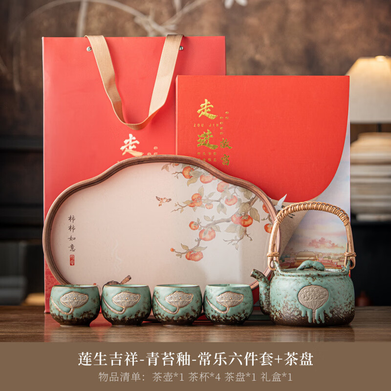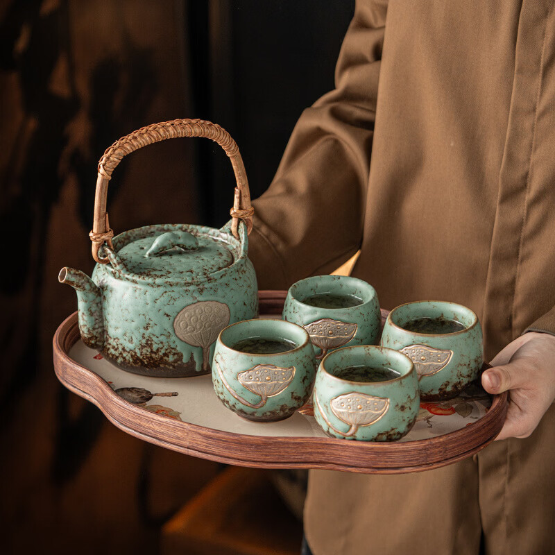 复古青苔釉,千年瓷艺的沉淀与传承。;新颖百搭耐看,浮雕莲蓬,简约造型。;一壶四杯一盘,尽显东方茶道韵味。