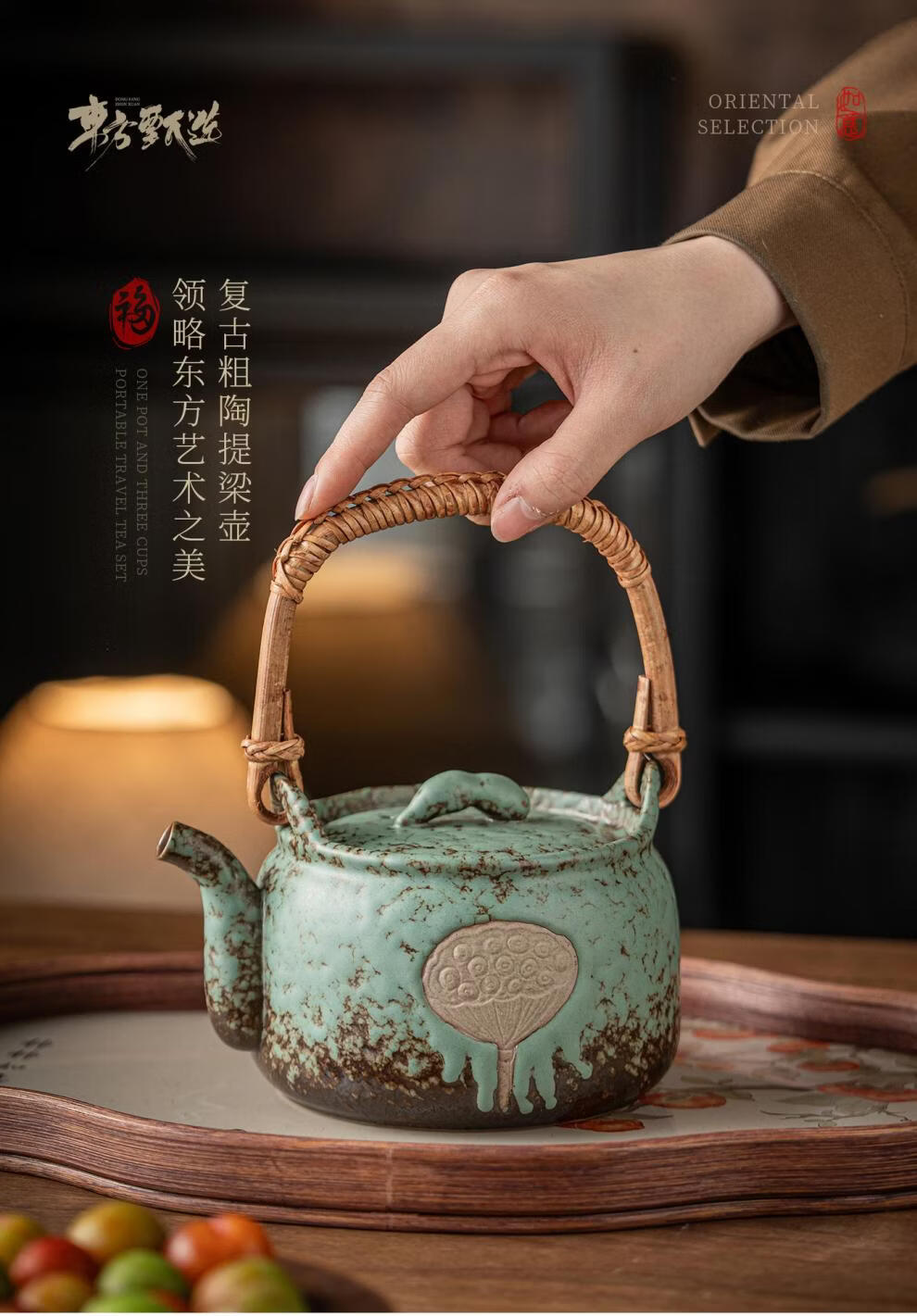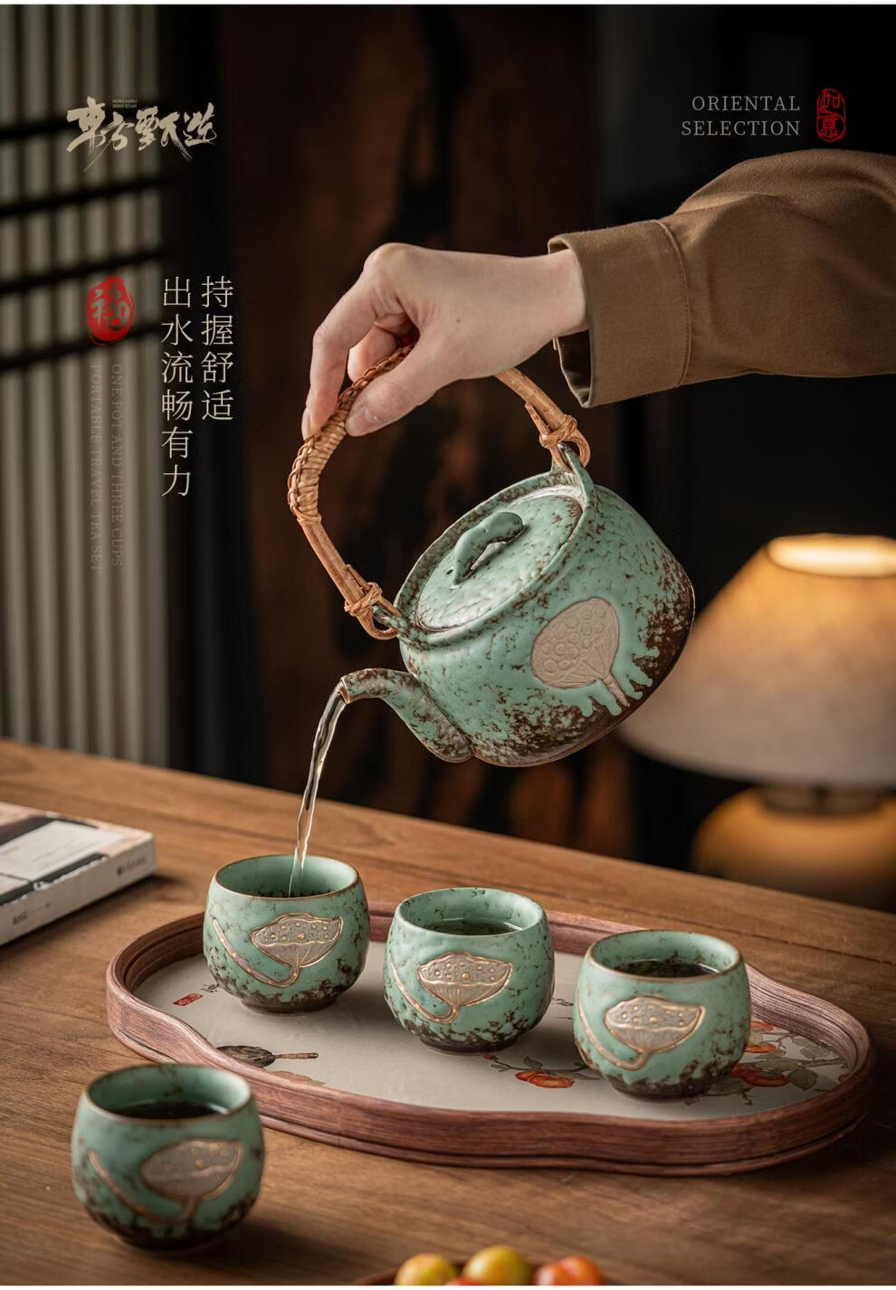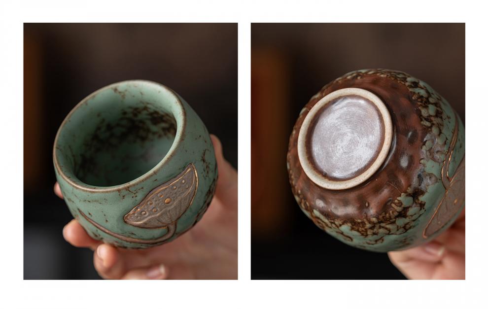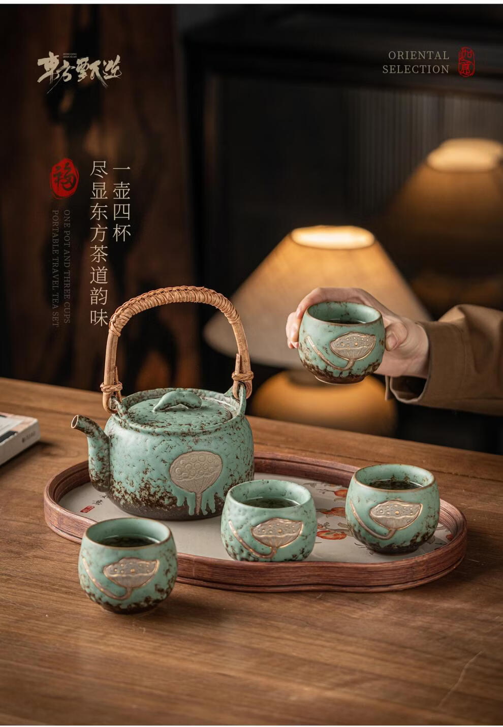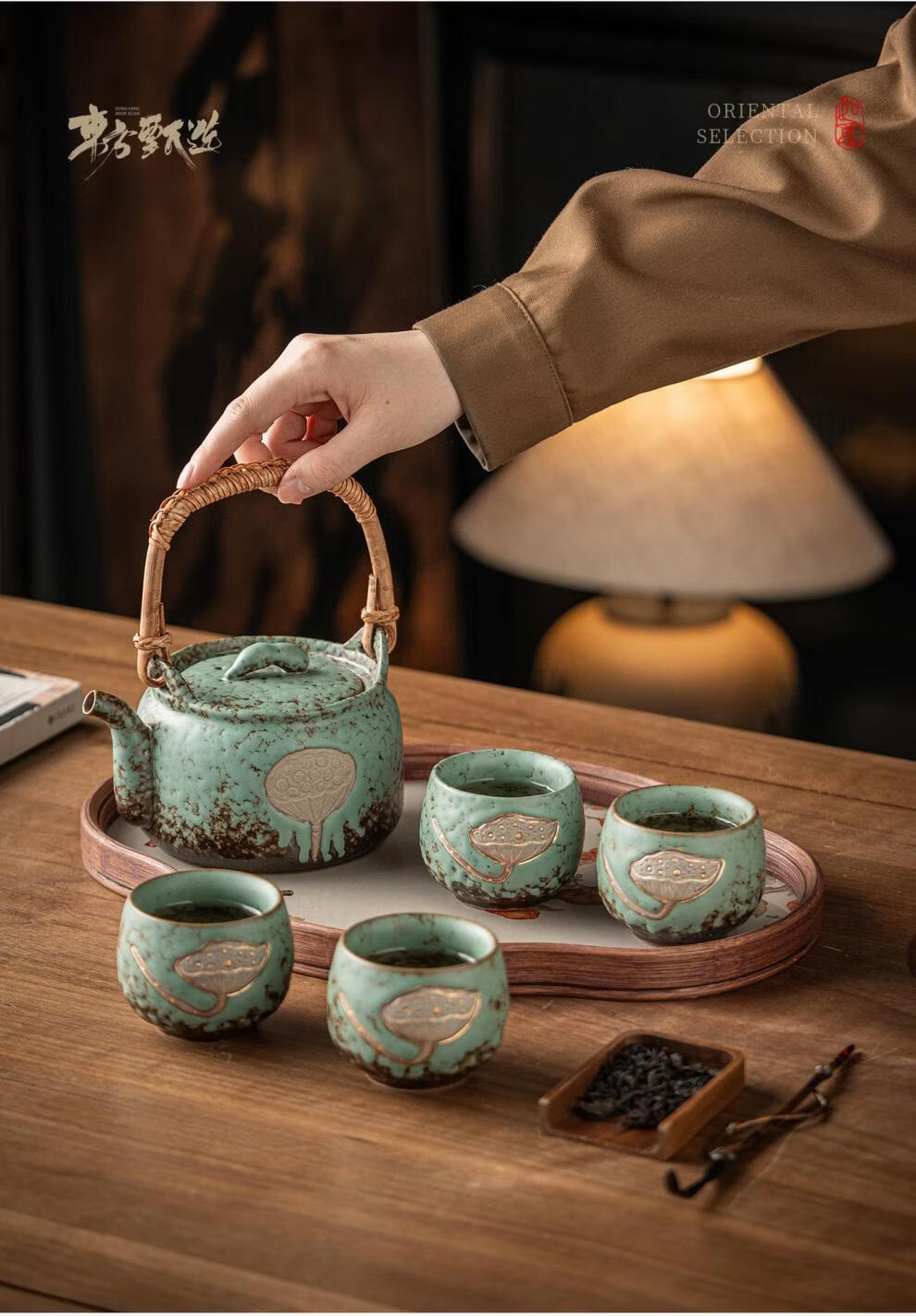 复古青苔釉,千年瓷艺的沉淀与传承。;新颖百搭耐看,浮雕莲蓬,简约造型。;一壶四杯一盘,尽显东方茶道韵味。