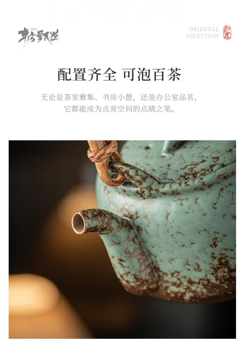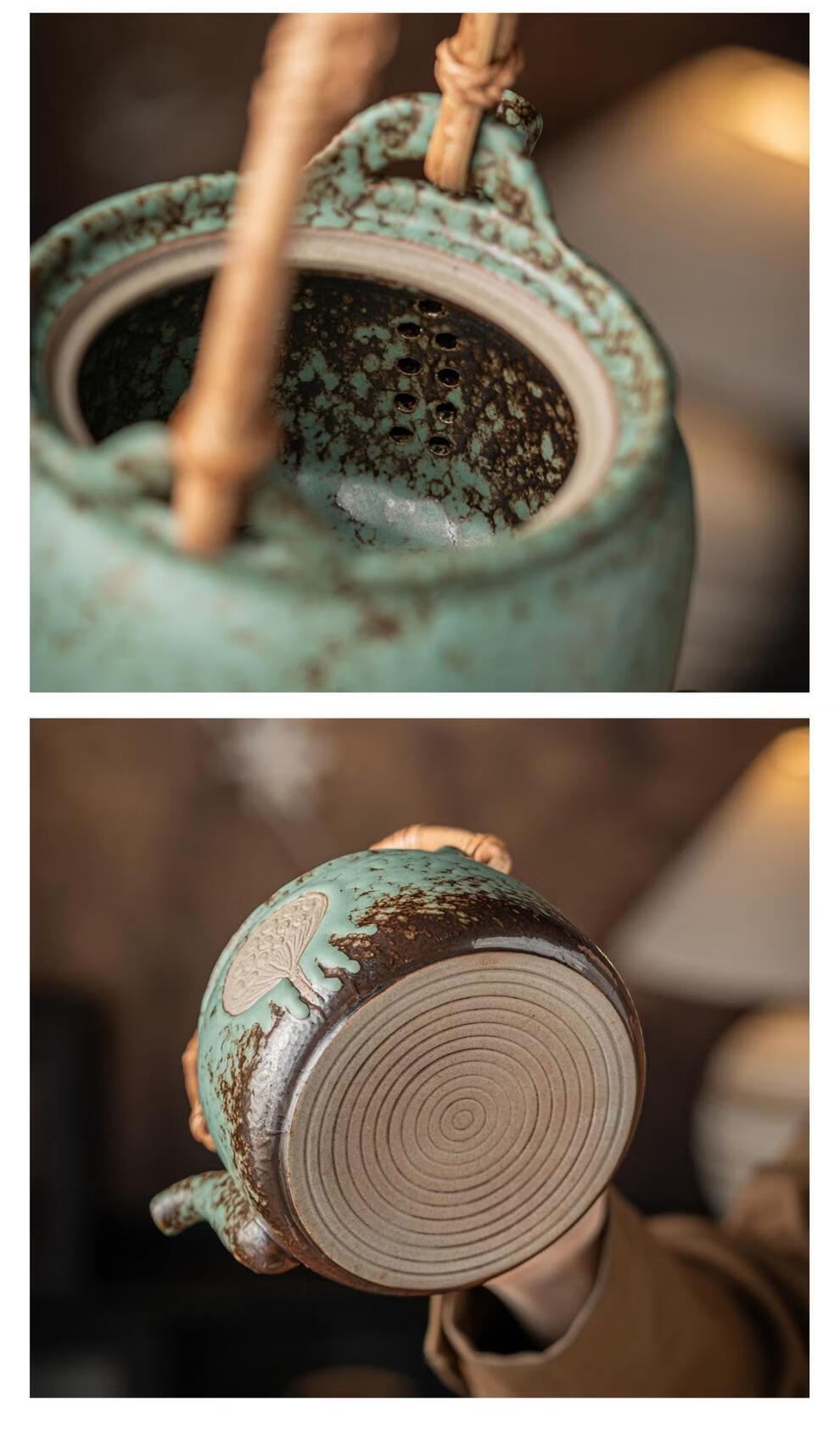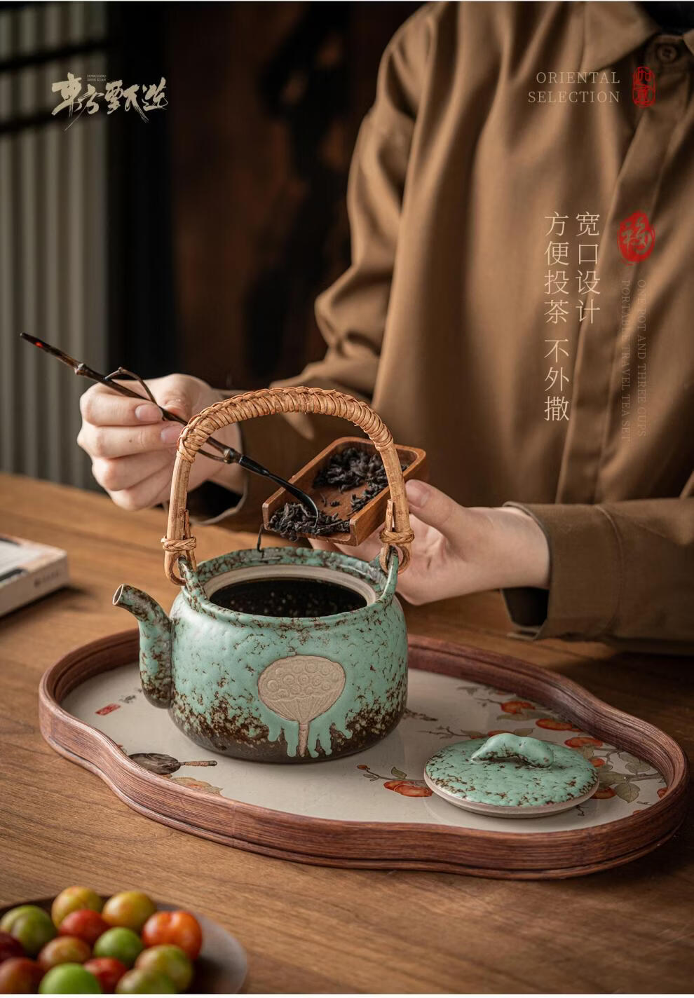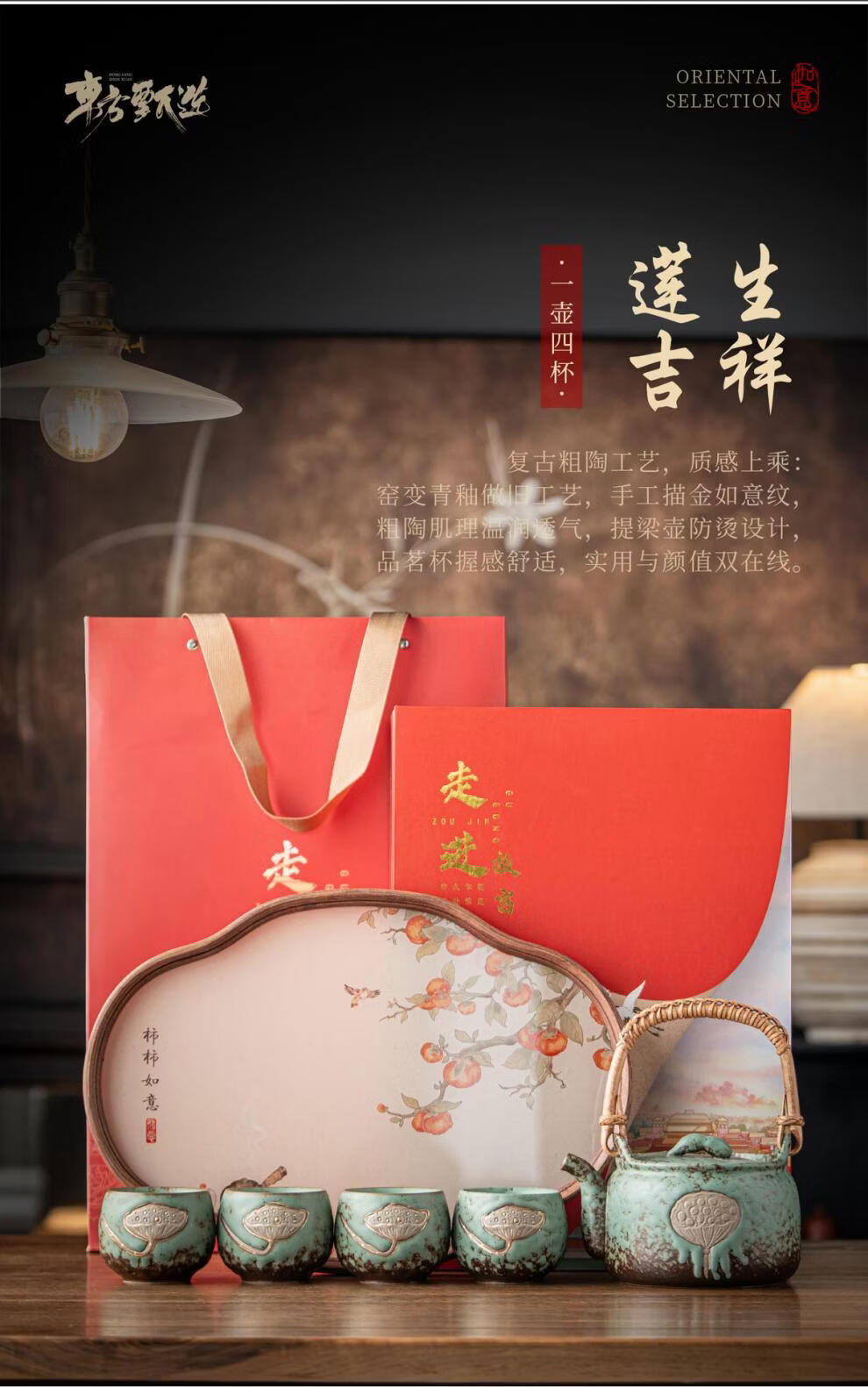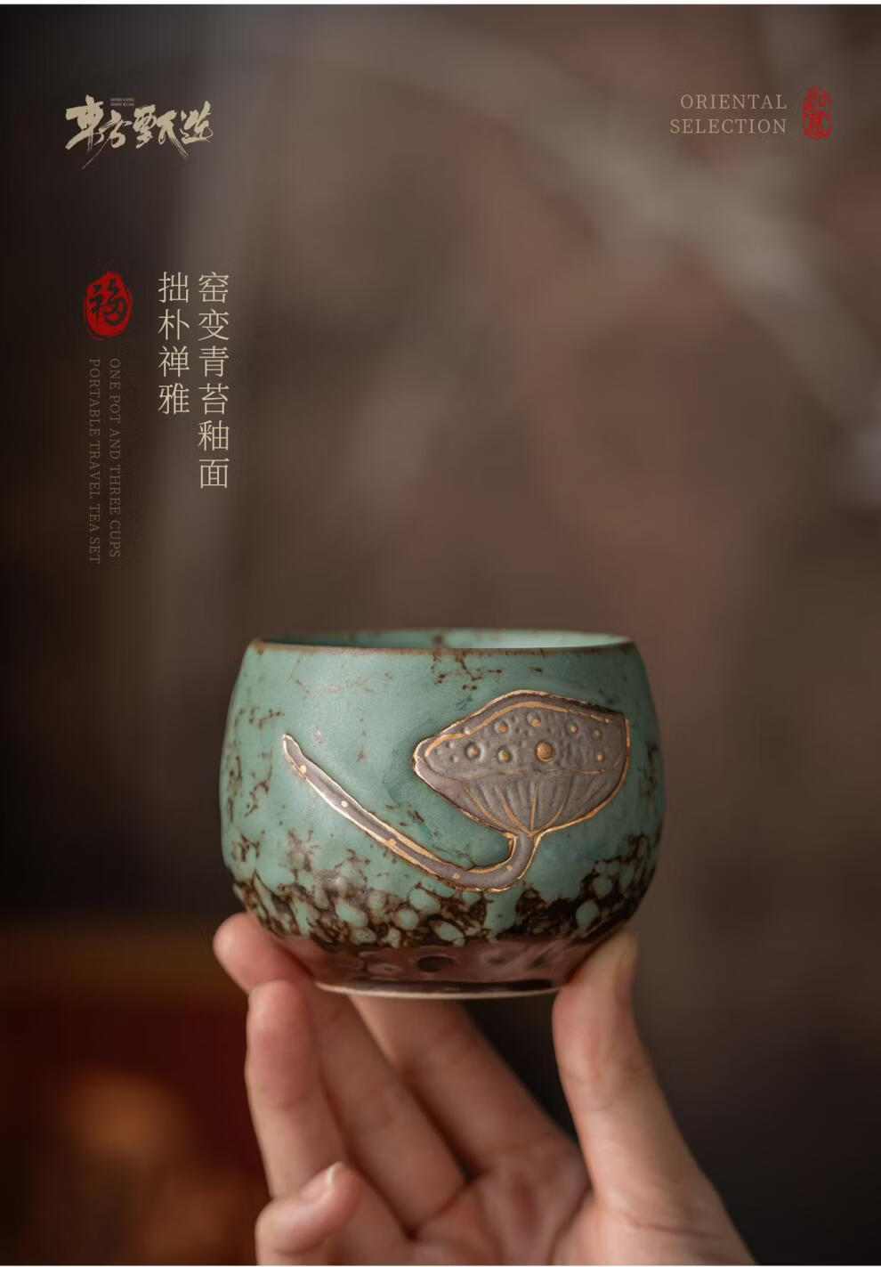 复古青苔釉,千年瓷艺的沉淀与传承。;新颖百搭耐看,浮雕莲蓬,简约造型。;一壶四杯一盘,尽显东方茶道韵味。