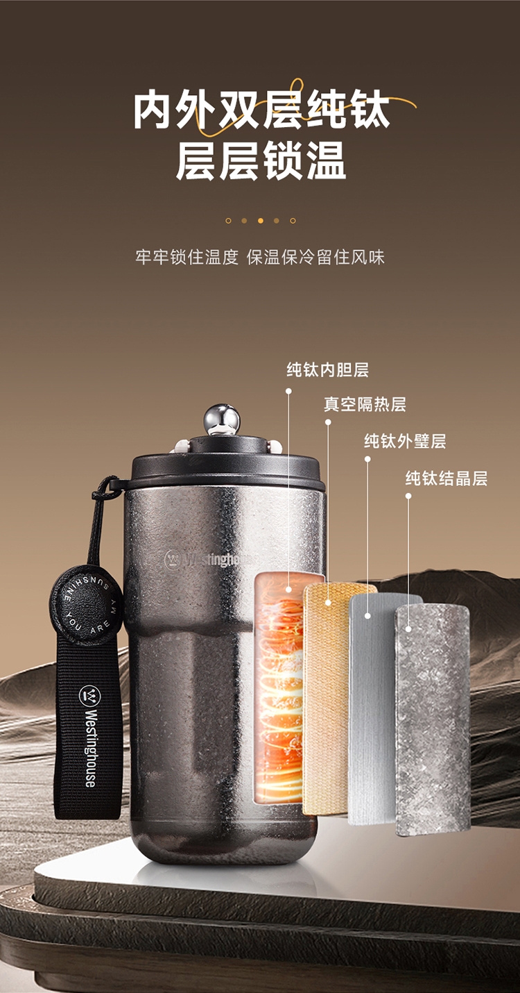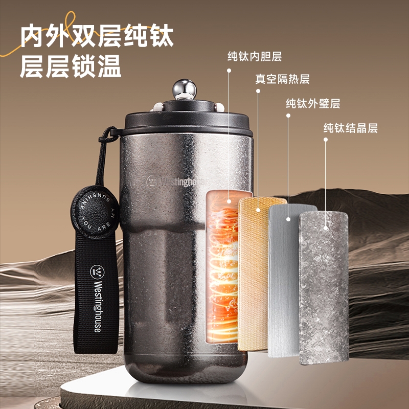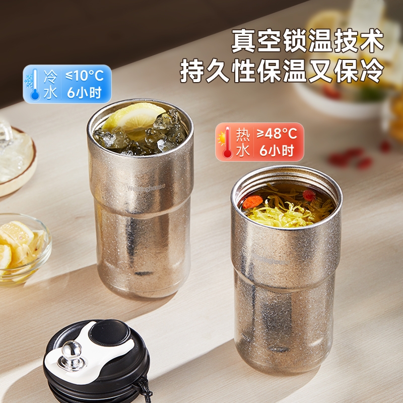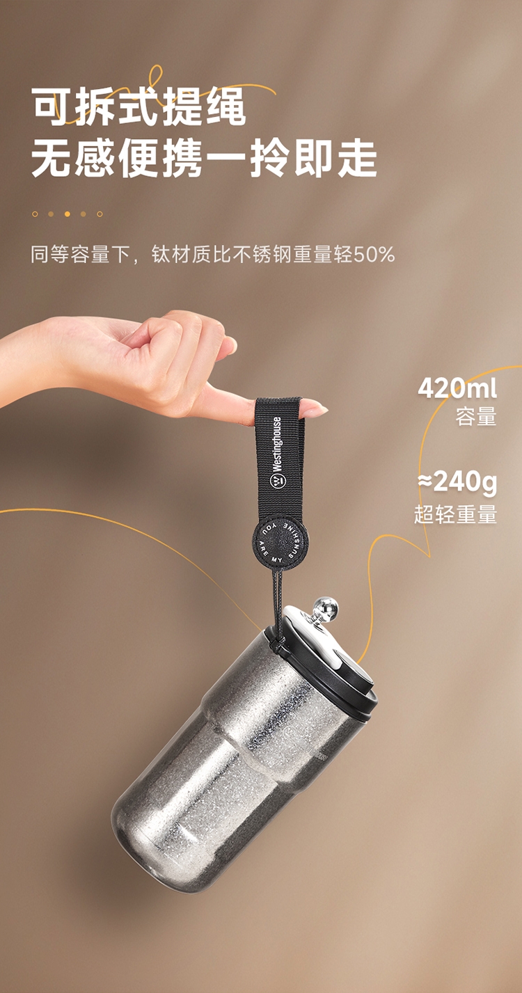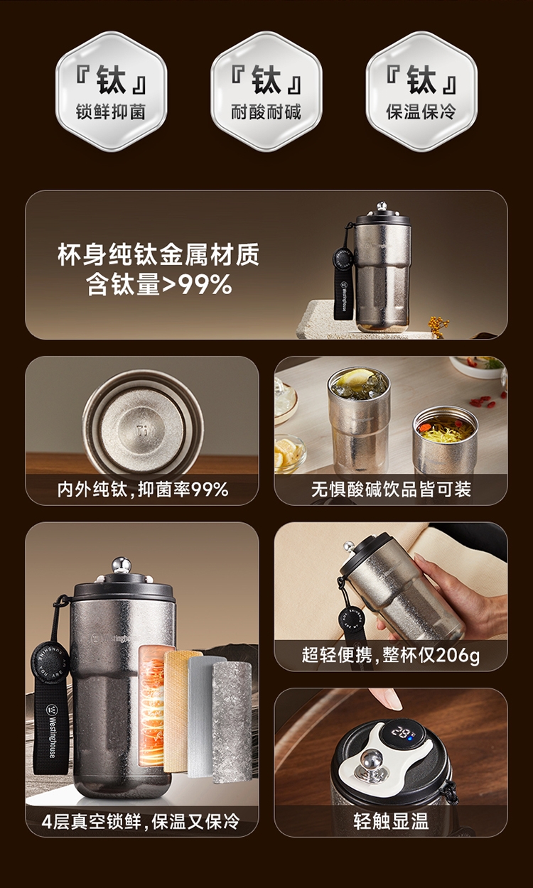 杯身内外纯钛,含钛量>99%;4层真空锁鲜,保温又保冷;轻触显温温度一触即知,内置感温器,喝水不烫嘴;可拆式提绳无感便携一拎即走;同等容量下,钛材质比不锈钢重量轻50%