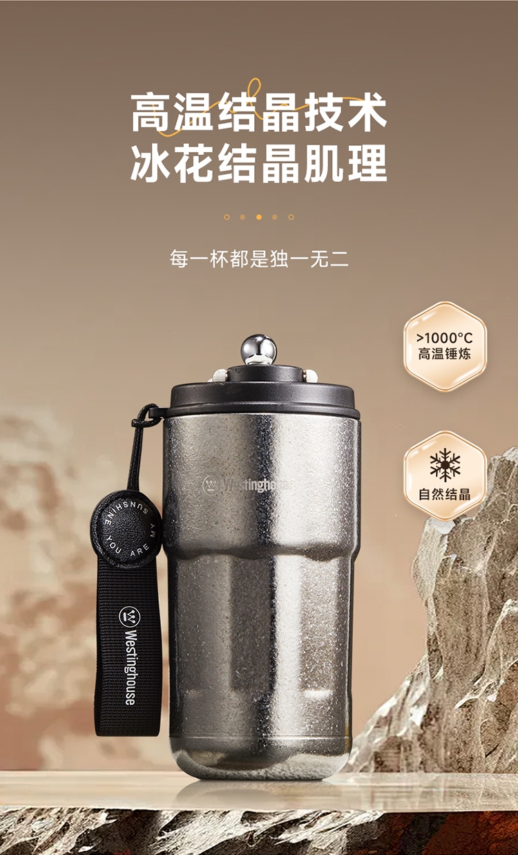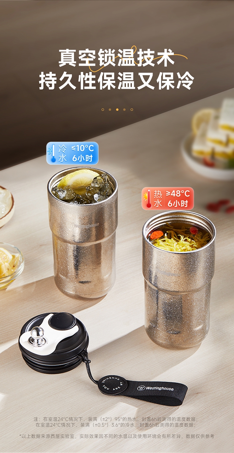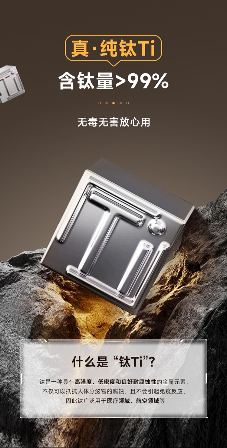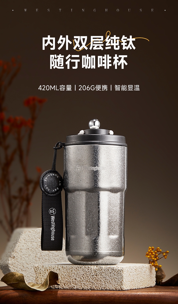 杯身内外纯钛,含钛量>99%;4层真空锁鲜,保温又保冷;轻触显温温度一触即知,内置感温器,喝水不烫嘴;可拆式提绳无感便携一拎即走;同等容量下,钛材质比不锈钢重量轻50%