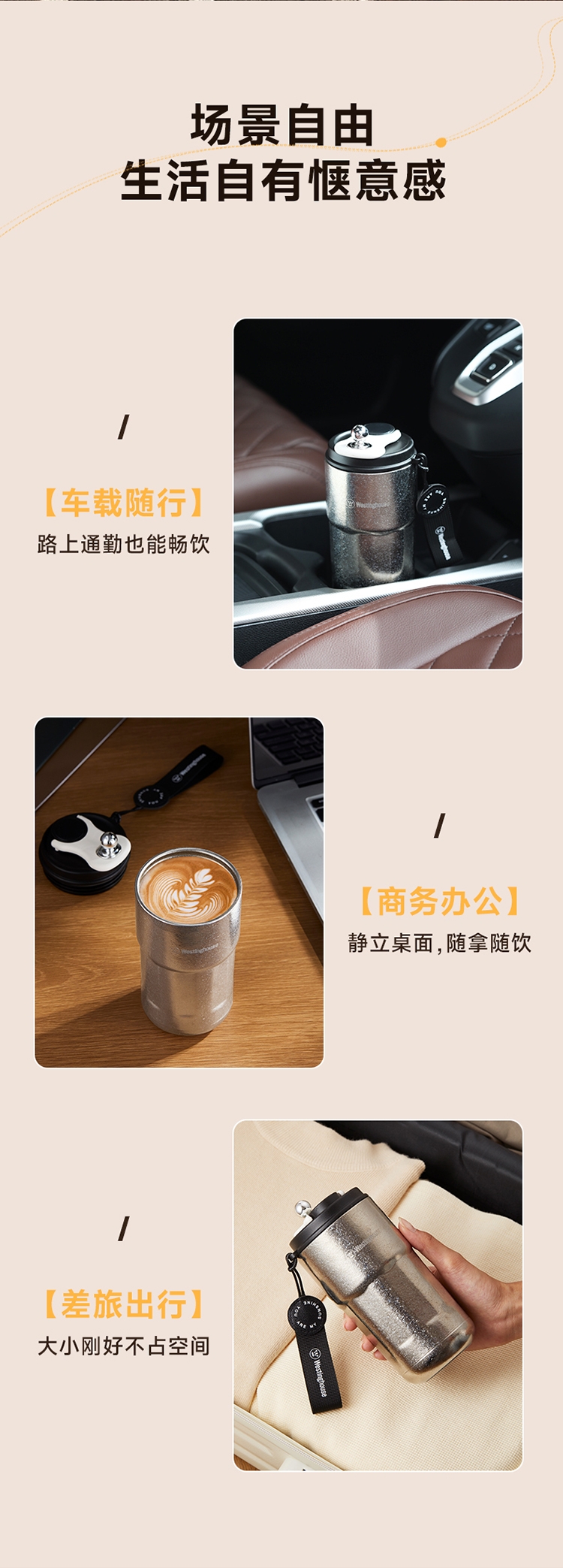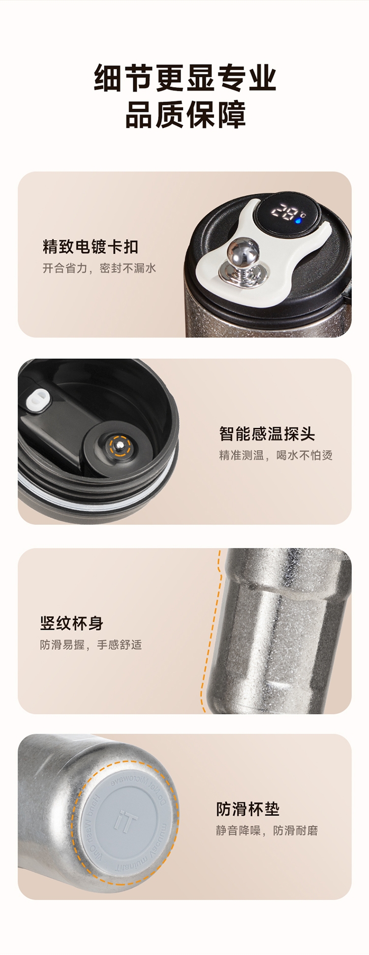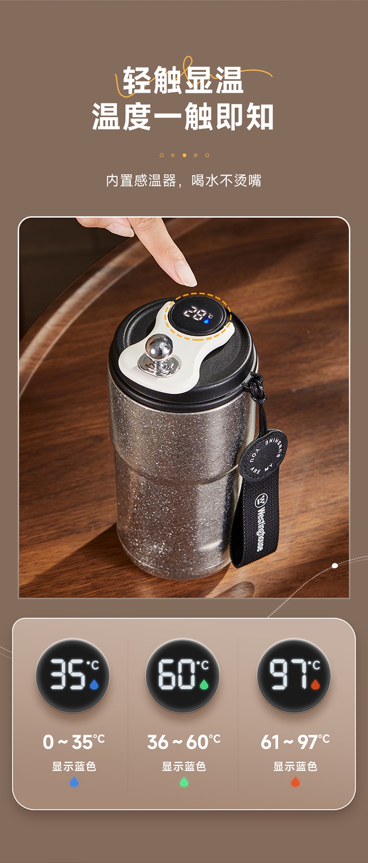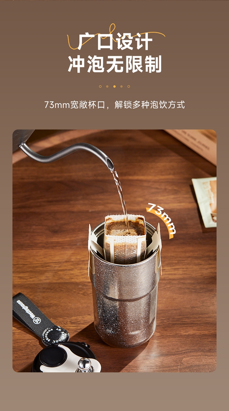 杯身内外纯钛,含钛量>99%;4层真空锁鲜,保温又保冷;轻触显温温度一触即知,内置感温器,喝水不烫嘴;可拆式提绳无感便携一拎即走;同等容量下,钛材质比不锈钢重量轻50%