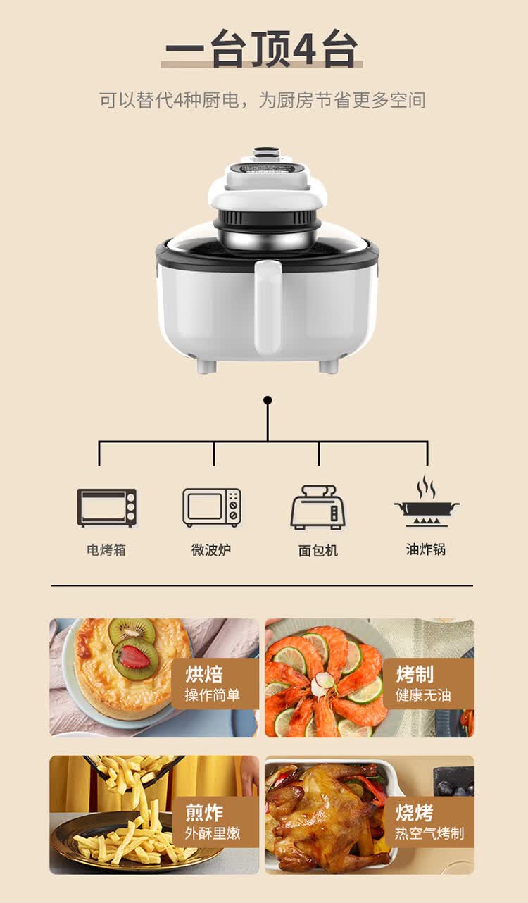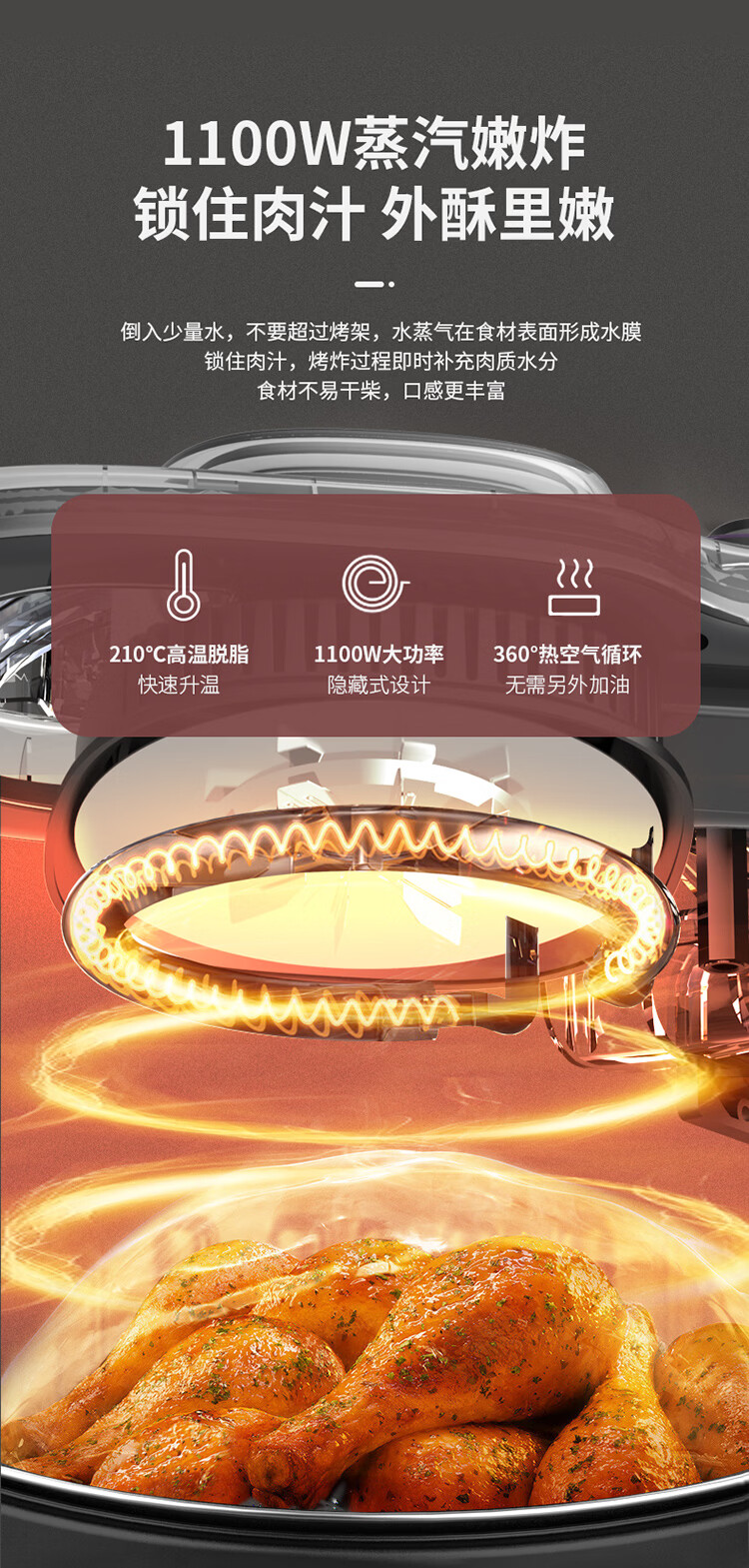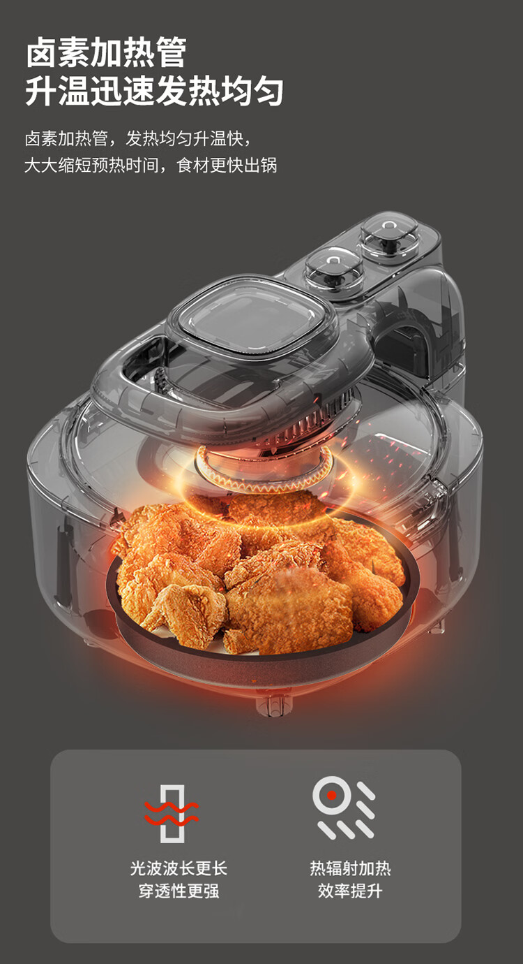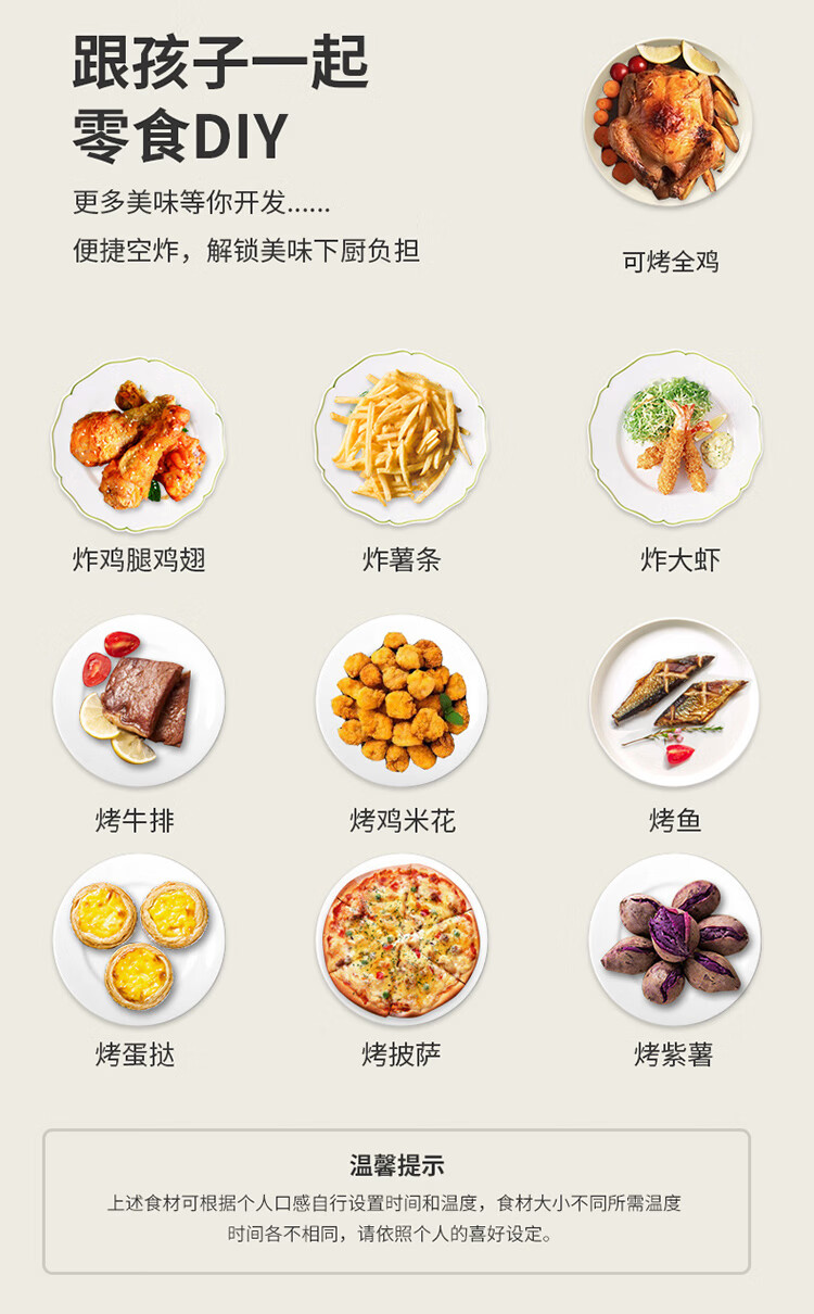 可视窗口 免翻面 大容量;循环热风 加热均匀 ;烘焙 烤制 煎炸 烧烤