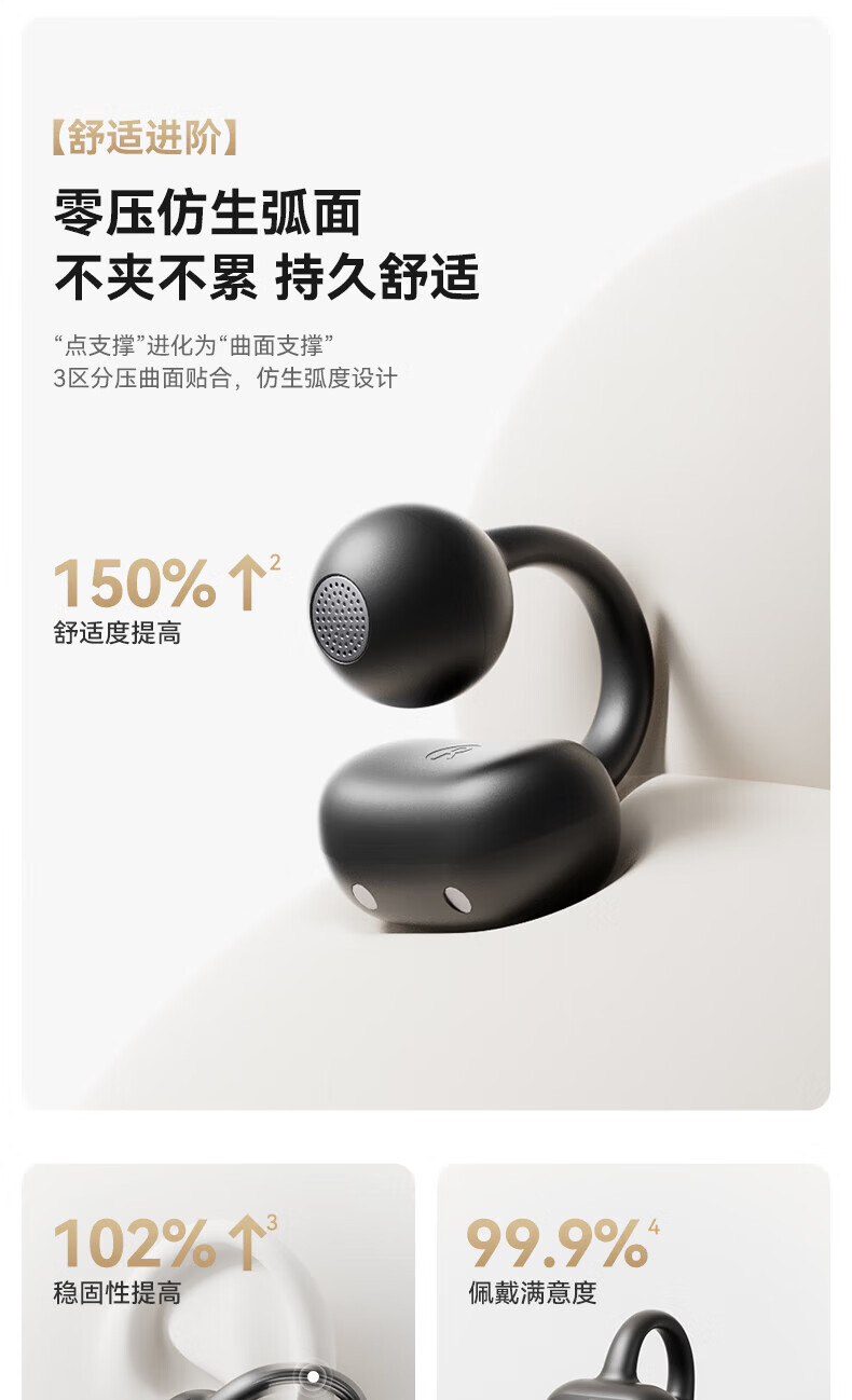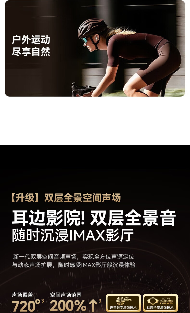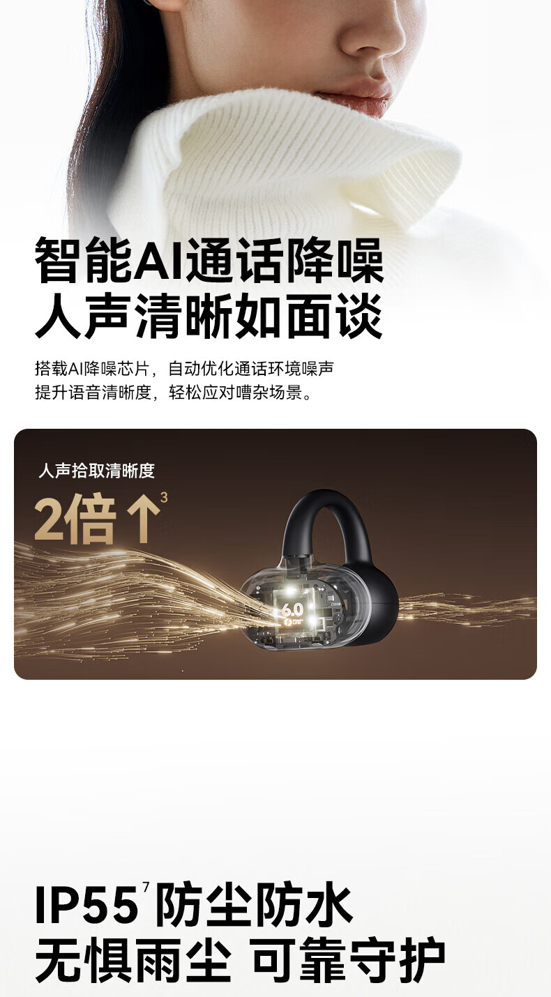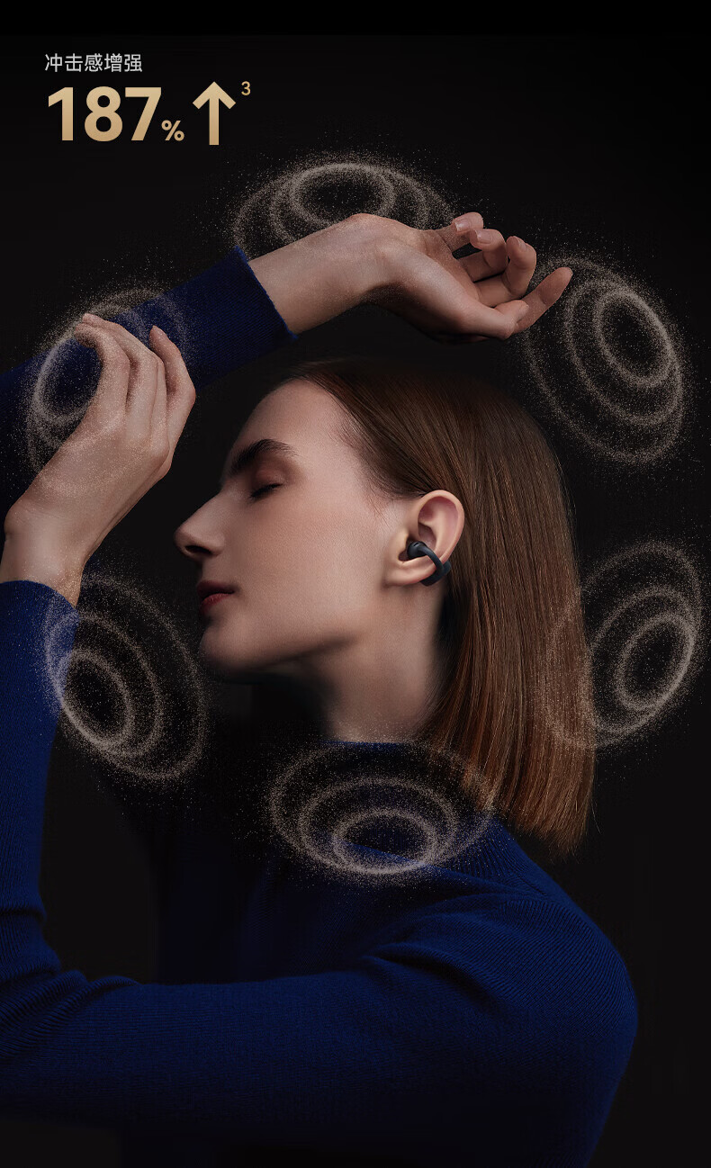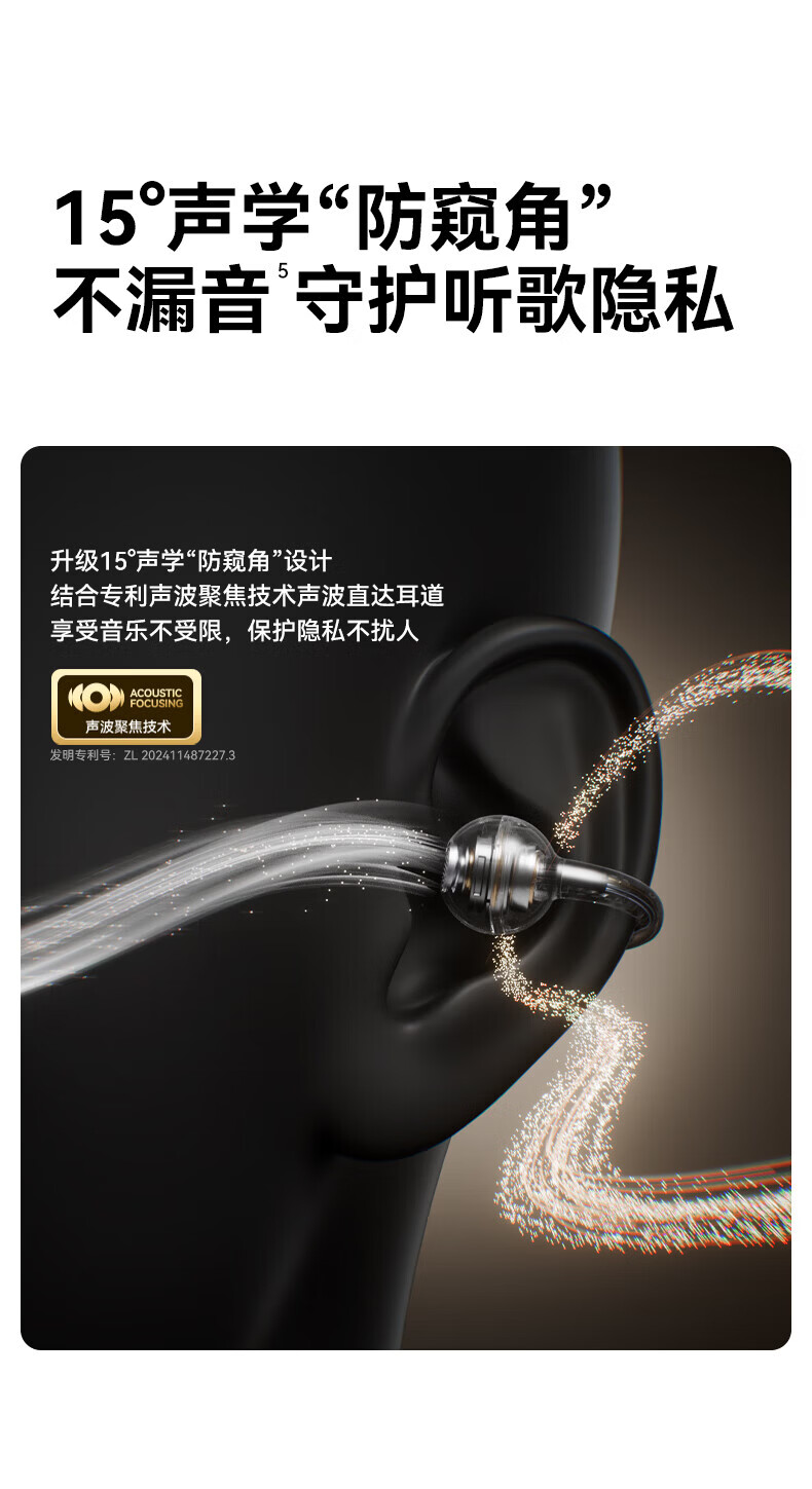 升级双层全景空间声场;智能AI通话降噪,人声清晰如面谈;结合声波聚焦技术,声波直达耳道