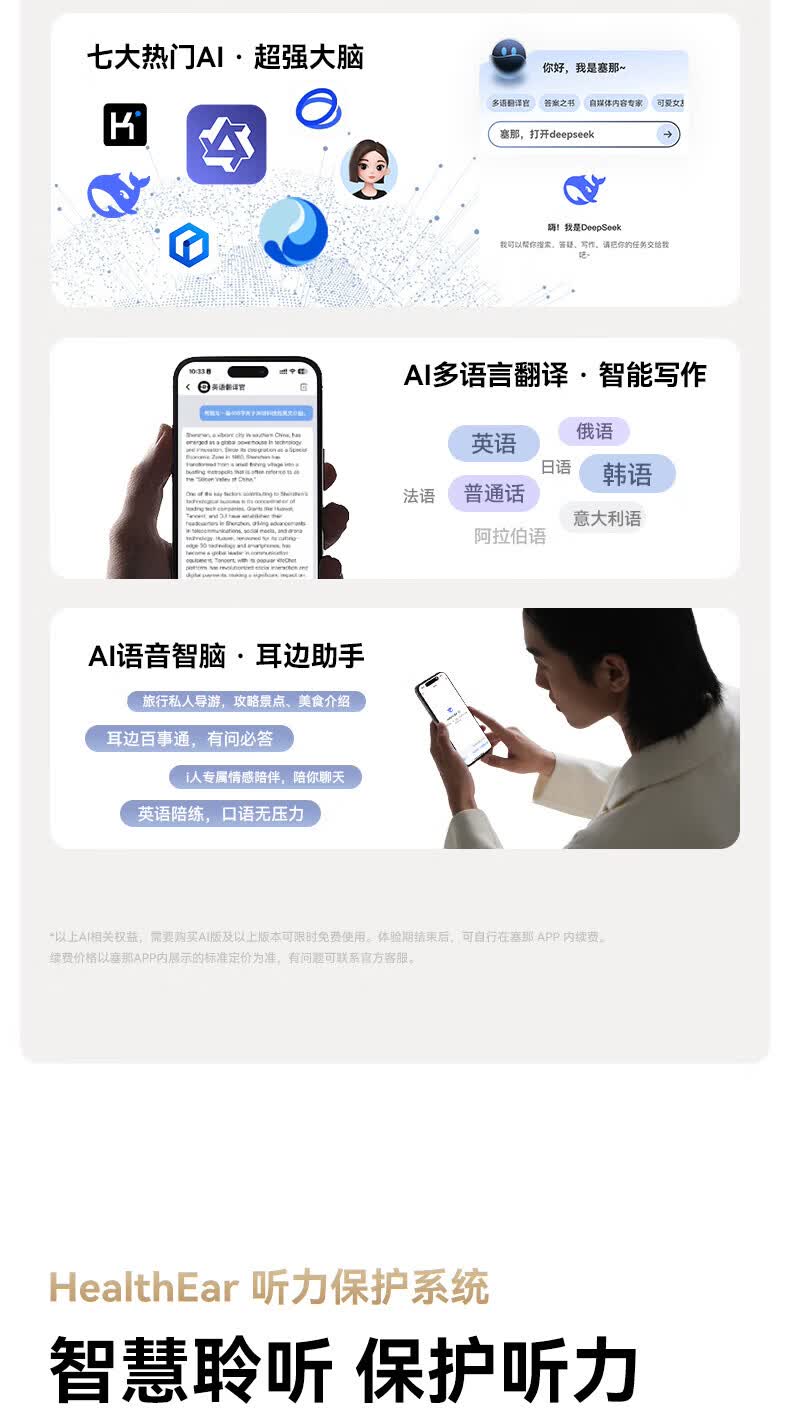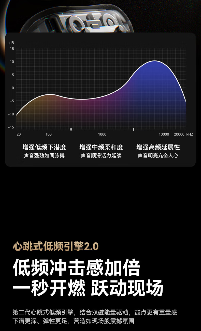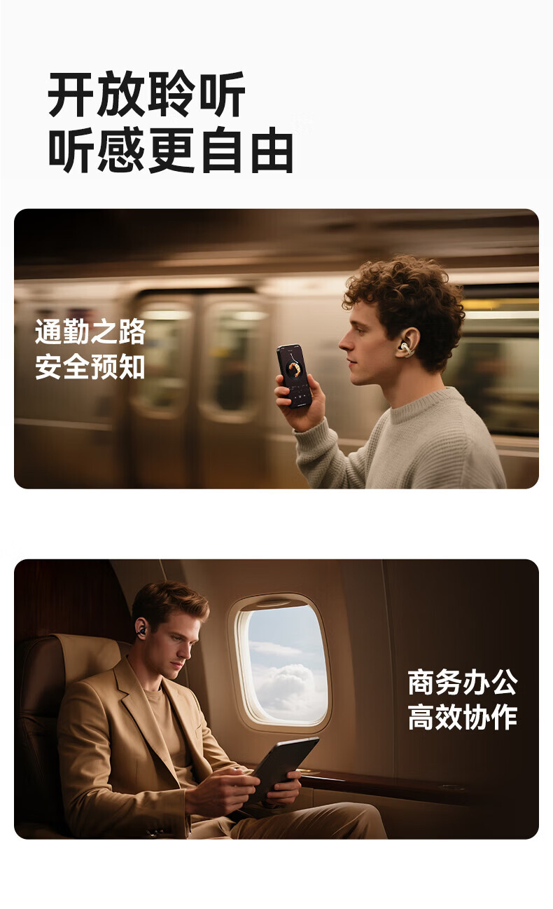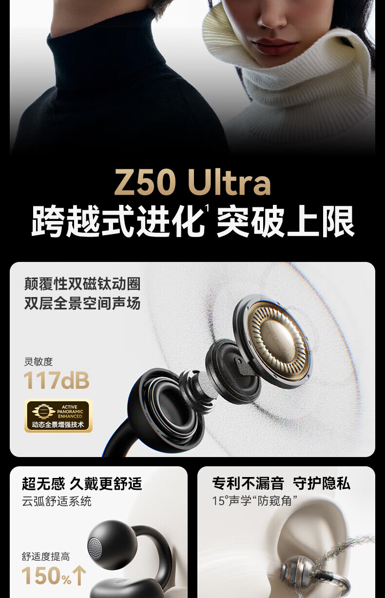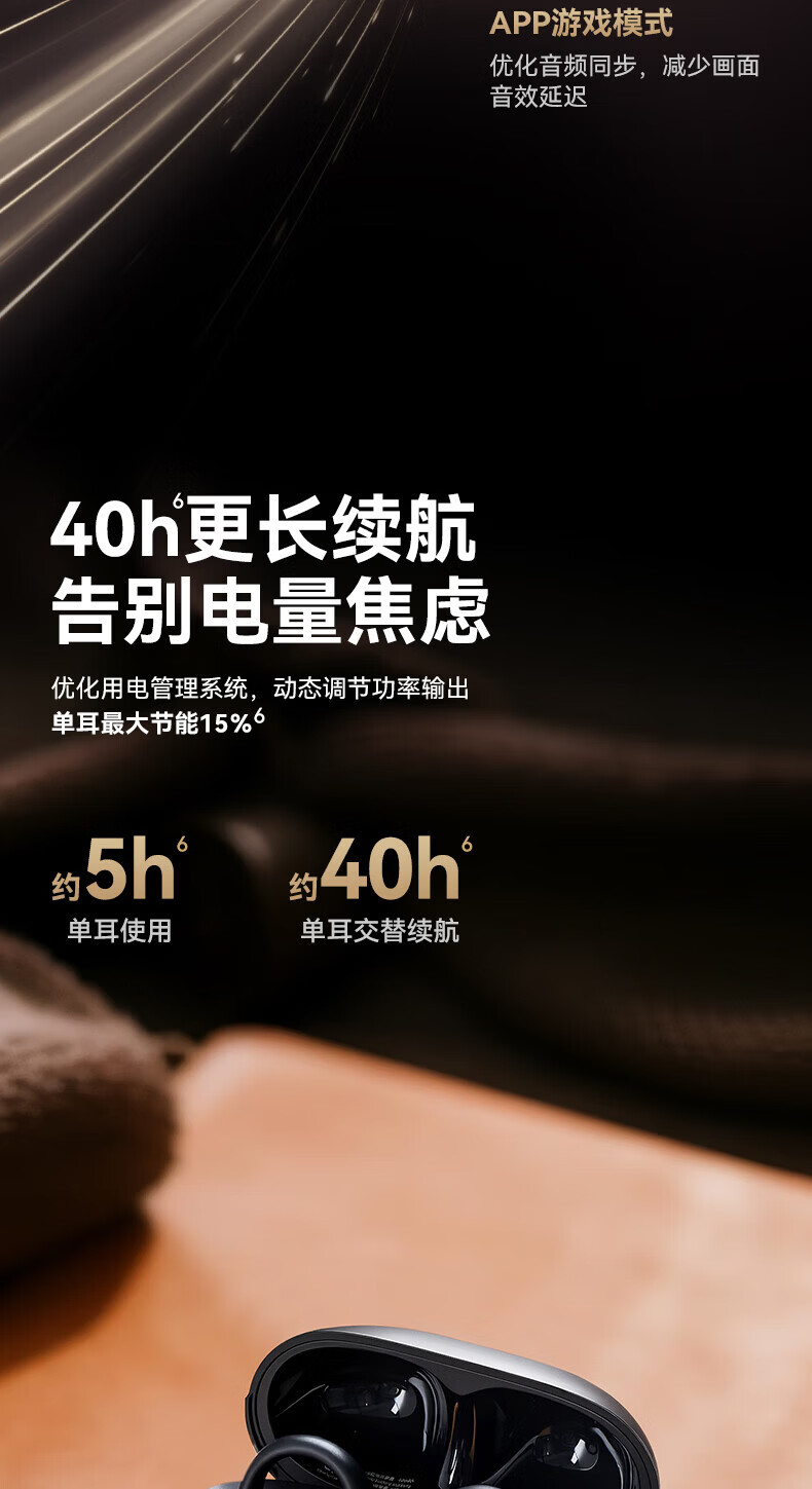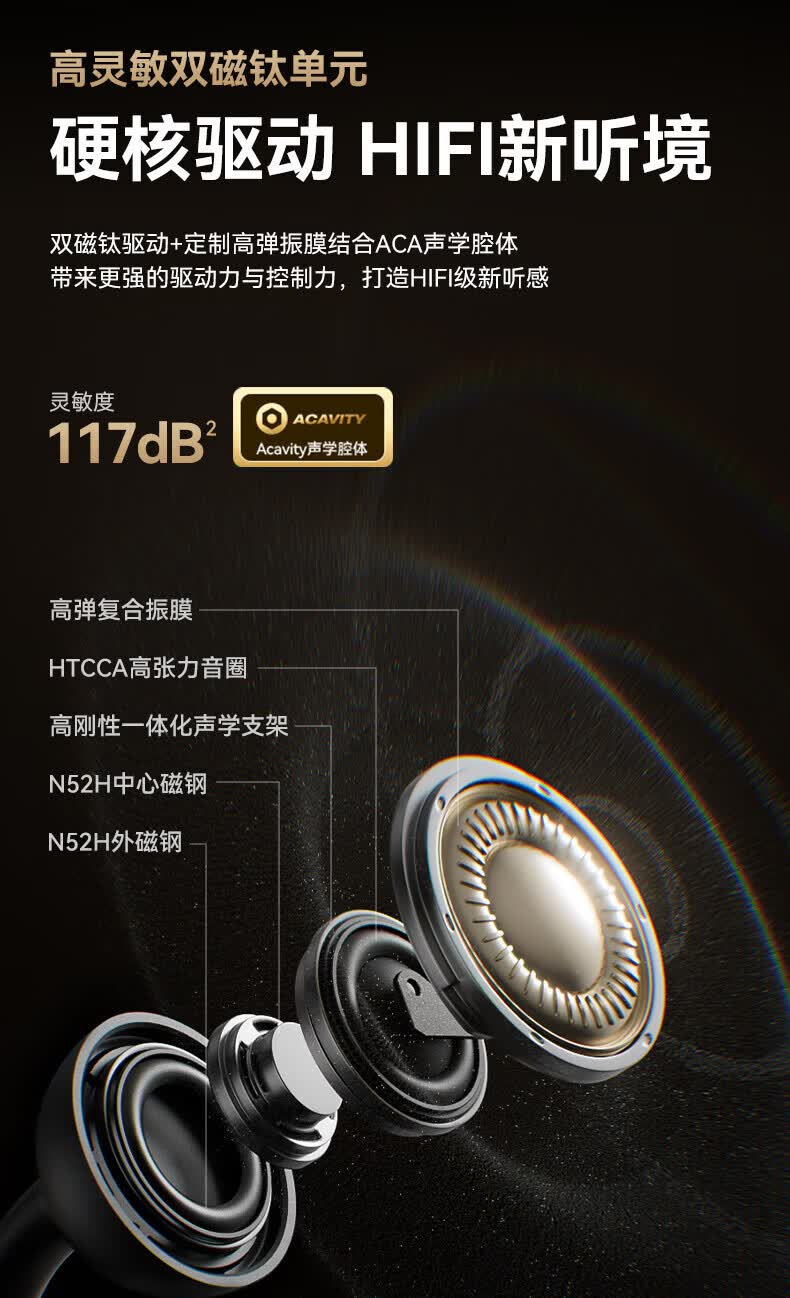 升级双层全景空间声场;智能AI通话降噪,人声清晰如面谈;结合声波聚焦技术,声波直达耳道