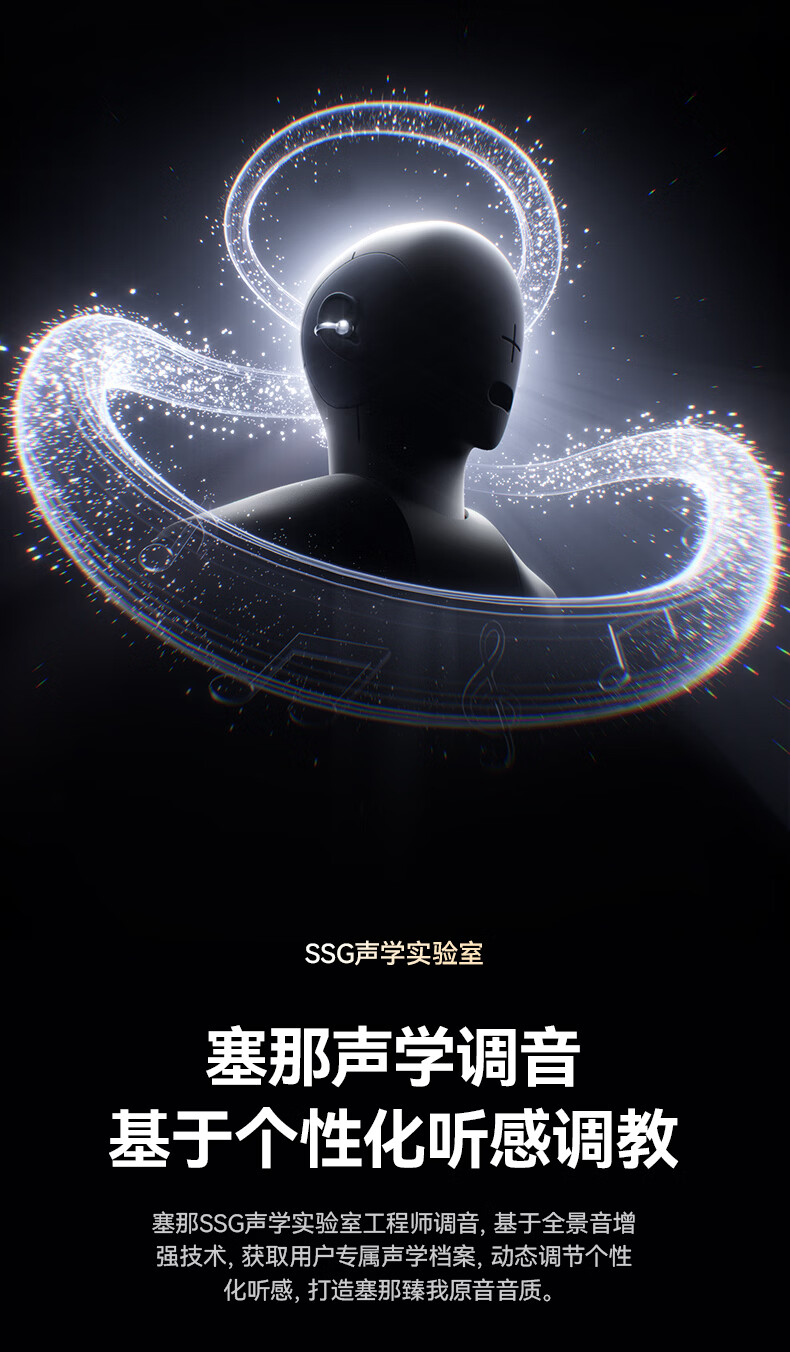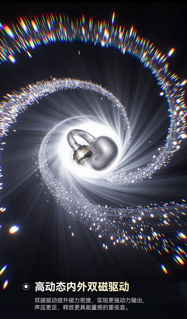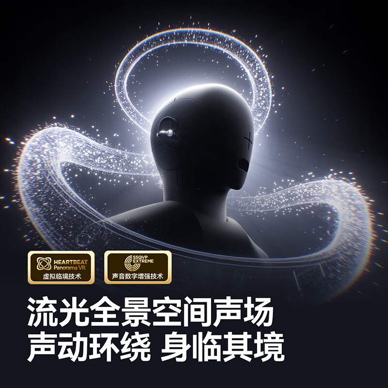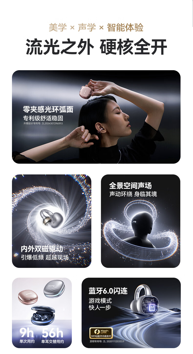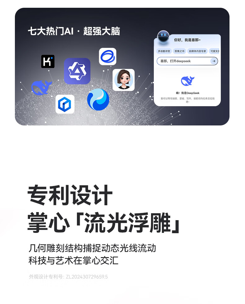 流光全景空间声场,生动环绕,身临其境;语音控制、同传翻译、面对面翻译;几何”流光浮雕“结构,捕捉动态光线流动